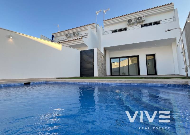 Moderne Neubau-Villen zum Verkauf in San Pedro del Pinatar – in der Nähe des Strandes und des Stadtzentrums Exklusives Wohnprojekt an der Costa Cálida Diese neue Boutique-Siedlung besteht aus nur vier modernen, freistehenden Villen in idealer Lage in einer ruhigen Wohngegend in der Nähe des Zentrums von San Pedro del Pinatar, Murcia. Nur 1,4 km von den Stränden von Lo Pagán entfernt, bieten diese Häuser die perfekte Kombination aus Komfort, Privatsphäre und Nähe zu wichtigen Dienstleistungen und Attraktionen an der Küste. San Pedro del Pinatar ist einer der begehrtesten Orte an der Costa Cálida und bekannt für seine natürlichen Salzlagunen, Heilschlammbäder und ein vielfältiges Angebot an Freizeit-, Gastronomie- und Wellnessmöglichkeiten. Mit dem Mittelmeer und dem Mar Menor in unmittelbarer Nähe ist dieser Ort ideal, um das ganze Jahr über Sonnenschein und einen entspannten Lebensstil zu genießen. Modernes Design und intelligente Raumaufteilung Jede Villa verfügt über: 3 Schlafzimmer und 3 Badezimmer, darunter zwei en-suite Badezimmer Offene Küche und Wohnbereich mit direktem Zugang zu einer großzügigen Terrasse Schlafzimmer und Badezimmer im Erdgeschoss, ideal für Gäste oder Mehrgenerationenhaushalte Privater Swimmingpool mit LED-Beleuchtung und Solardusche im Freien Große Dachterrasse zum Sonnenbaden, Entspannen oder für gesellige Stunden Grundstück mit privatem Parkplatz Die Häuser wurden mit Blick auf modernes Wohnen entworfen und bieten eine hochwertige Ausstattung und intelligente Installationen: Sicherheitseingangstür Motorisierte Aluminiumrollläden Vorinstallation für Klimaanlage Fußbodenheizung in den Badezimmern Einbau-Badezimmer mit beleuchteten Spiegeln und Möbeln Eine Mustervilla kann besichtigt werden, damit Sie sich persönlich von dem hohen Standard und der Aufteilung überzeugen können. Erstklassige Lage mit hervorragender Anbindung Diese Villen sind perfekt gelegen, um sowohl Ruhe als auch Bequemlichkeit zu genießen. Alle Dienstleistungen des täglichen Bedarfs wie Geschäfte, Restaurants, Supermärkte und Gesundheitszentren sind zu Fuß erreichbar. Darüber hinaus ist die Gegend gut an das Straßennetz und den öffentlichen Nahverkehr angebunden. Entfernungen zu den wichtigsten Sehenswürdigkeiten: Strand Lo Pagán: 1,4 km Strände des Mar Menor: 2 km Einkaufszentrum Dos Mares: 3,5 km Golfplatz Lo Romero: 10 km Roda Golf Resort: 9 km Internationaler Flughafen Murcia: 35 km (25 Minuten mit dem Auto) Flughafen Alicante: 75 km (45 Minuten mit dem Auto) Reservieren Sie noch heute Ihre neue Villa in San Pedro Dies ist eine seltene Gelegenheit, eine neu gebaute Villa in einer der begehrtesten Küstenregionen Murcias zu erwerben. Da nur noch wenige Einheiten verfügbar sind, kontaktieren Sie uns jetzt, um weitere Informationen zu erhalten, einen Besichtigungstermin zu vereinbaren oder sich Ihr Traumhaus am Meer zu sichern.