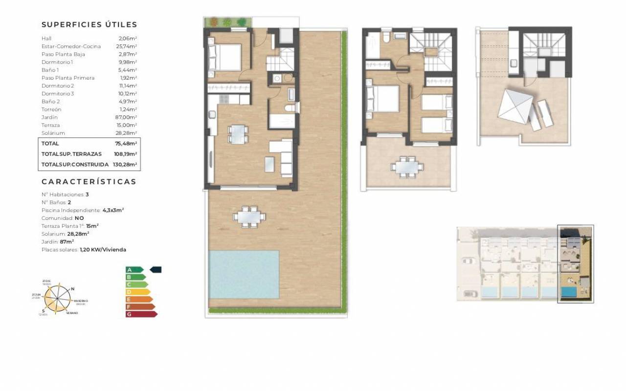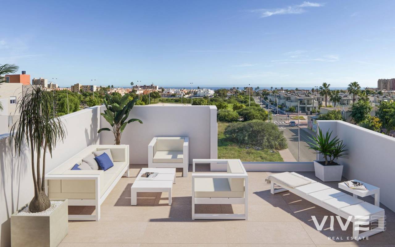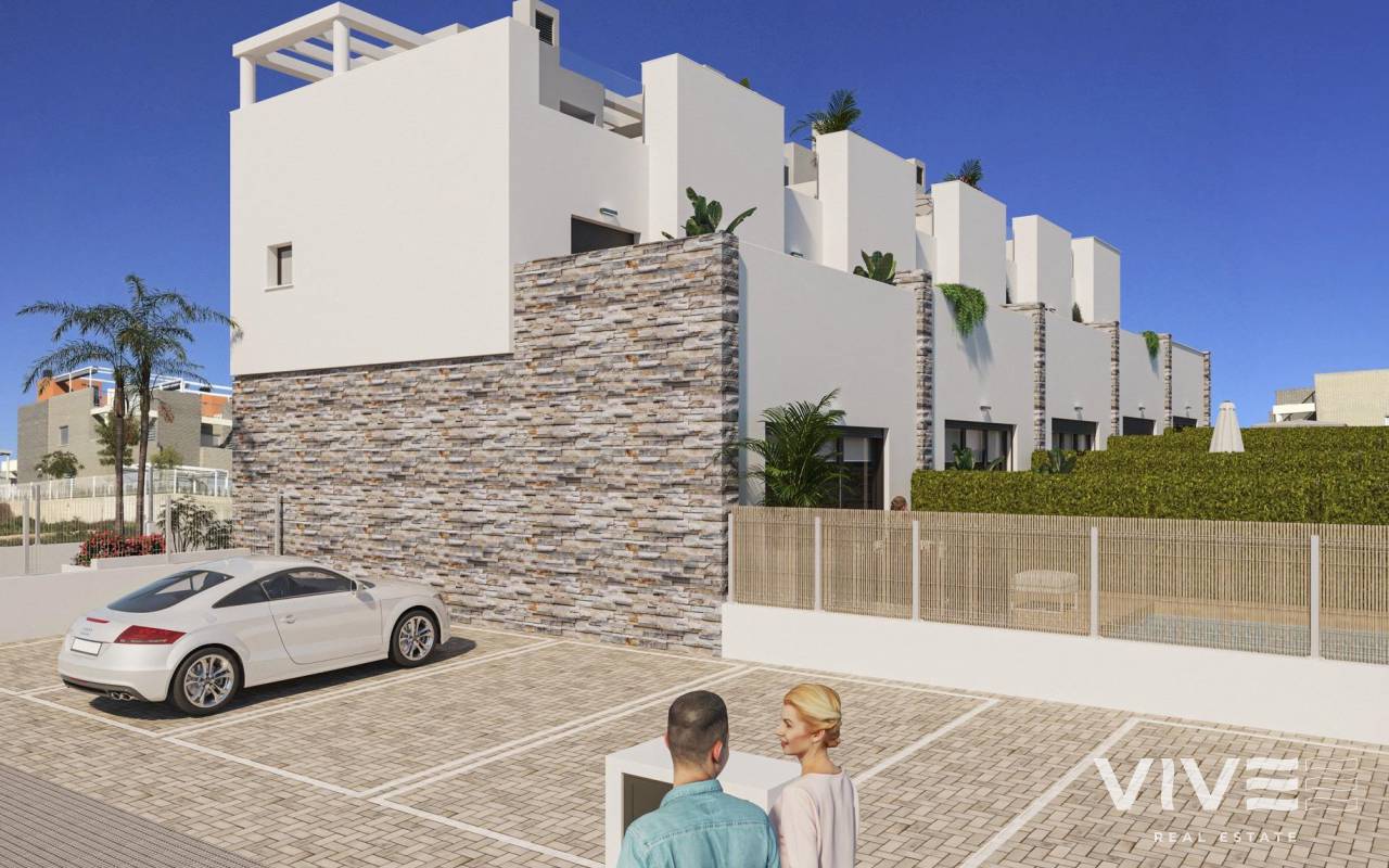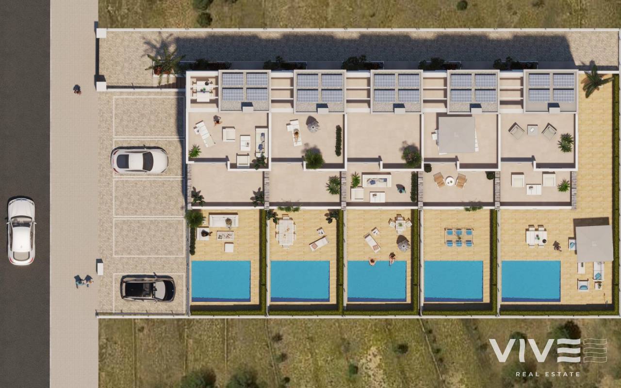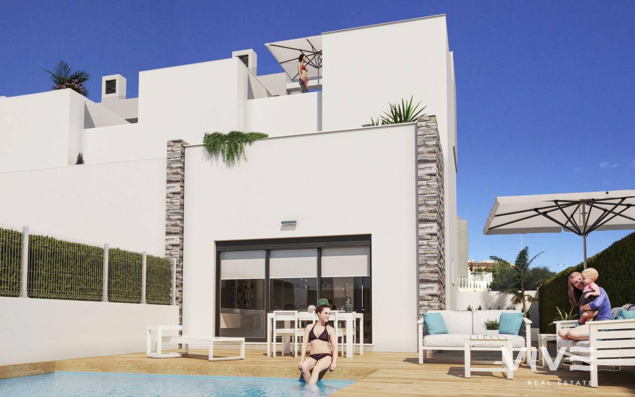 NEU GEBAUTE DOPPELHAUSHÄLFTEN IN TORREVIEJA Neubau Wohnanlage von 5 schönen Eigenschaften mit privaten Swimmingpools in Torrevieja. Doppelhaushälfte Villa hat 3 Schlafzimmer, 2 Bäder, offene Küche mit Wohnzimmer, Einbauschränke, Terrasse, private Solarium mit Grillplatz, Garten mit dem Pool und comunal Parkplatz. Eigenschaften mit hochwertigen Materialien und Oberflächen gebaut. Die unglaubliche Lage, nur 5 Minuten vom Meer entfernt, und die Nähe zu den wichtigsten Einkaufs- und Freizeitzentren von Torrevieja sowie zu den Golfplätzen, machen es zu einem einzigartigen und exklusiven Ort zum Leben. Torrevieja ist eine spanische Stadt in der Provinz Alicante, an der Costa Blanca. Sie ist bekannt für ihr typisch mediterranes Klima und ihre Küstenlinie. Entlang der Sandstrände gibt es Strandpromenaden mit Ferienanlagen. Das kleine Meeres- und Salzmuseum beherbergt Ausstellungen über die Fischerei- und Salzgeschichte der Stadt. Im Landesinneren befindet sich der Naturpark Lagunas de La Mata-Torrevieja mit Wanderwegen und zwei salzhaltigen Lagunen, von denen eine rosa und die andere grün ist. Der Flughafen Alicante ist 40 Minuten und der Flughafen Murcia etwa 1 Stunde entfernt.