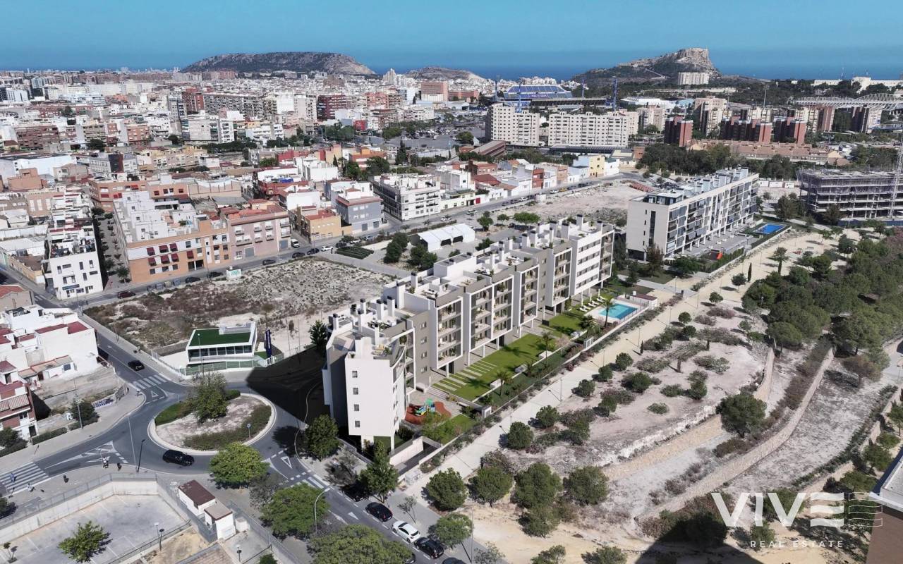 Neu gebaute Wohnanlage in Alicante, mit freiem Blick auf die Stadt. Das Haus Ihrer Träume in einer privilegierten Lage. Entdecken Sie Ihr neues Zuhause in Alicantes begehrtem Viertel San Agustin, wo modernes Wohnen auf malerische Landschaften trifft. Diese exklusive Wohnanlage in der Nähe von Pau II bietet 47 schön gestaltete Wohnungen mit 2, 3 oder 4 Schlafzimmern. Die Wohnanlage verfügt über einen Gemeinschaftspool, üppige Gärten, einen Garagenplatz und einen Abstellraum für zusätzlichen Komfort. Exklusive Annehmlichkeiten für einen komfortablen Lebensstil Genießen Sie eine Reihe von Annehmlichkeiten, die Ihre Lebensqualität erhöhen. Die Penthäuser der Anlage verfügen über private Sonnenterrassen, die direkt von den Wohnungen aus zugänglich sind und einen atemberaubenden Blick auf Alicante bieten. Zu den weiteren Annehmlichkeiten gehören sichere Fahrradabstellplätze, die einen aktiven Lebensstil ermöglichen. Ihr neues Zuhause verfügt über eine zentrale aerothermische Wasserheizung für Energieeffizienz und ganzjährigen Komfort mit integrierter Klimaanlage (warm/kalt), die über Kanäle verteilt wird. Hochwertige PVC- oder Aluminium-Tischlerarbeiten mit thermischer und akustischer Isolierung sorgen für eine ruhige, klimaeffiziente Umgebung. Günstige Anbindung an alles, was Sie brauchen Zwischen der Gran Vía und der Vía Parque gelegen, bietet die Wohnanlage eine hervorragende Anbindung an das Stadtzentrum und an wichtige Verkehrsadern wie die Autobahn A7. Die zentrale Lage ist ideal für Familien und Berufstätige, da sich neun Bildungseinrichtungen aller Stufen in unmittelbarer Nähe befinden. Für den täglichen Bedarf finden Sie in der Nähe vier große Supermärkte und das Einkaufszentrum Isla de Corfú, das Fitnessstudios, Restaurants und eine Vielzahl von Geschäften bietet. Alles, was Sie brauchen, ist zu Fuß erreichbar, so dass Sie Ihr Auto zu Hause lassen können. Ein Viertel, das reich an Zugänglichkeit und natürlicher Schönheit ist Das Viertel San Agustín liegt auf einem sanften Hügel und bietet einen Panoramablick auf die Skyline der Stadt, den Monte Benacantil und die umliegenden Berge. Dank des mediterranen Klimas in Alicante ist das Leben im Freien das ganze Jahr über ein Vergnügen, und es gibt viele Grünflächen und Freizeitmöglichkeiten in der Nähe. Wichtige Entfernungen: Stadtzentrum von Alicante: 2 km Flughafen Alicante-Elche: 14 km Playa de San Juan (Strand): 6 km Golfplatz Alicante: 7 km Hafen von Alicante: 5 km Erleben Sie das Beste vom Leben in Alicante Das außergewöhnliche Klima, die lebendige Kultur und die hervorragende Infrastruktur machen Alicante zu einer der begehrtesten Städte Spaniens, in der man gerne lebt. Diese neue Wohnanlage in San Agustín verbindet stilvolles Design mit einer unschlagbaren Lage und ist damit der ideale Ort für Ihren nächsten Lebensabschnitt. Setzen Sie sich noch heute mit uns in Verbindung, um einen Besichtigungstermin zu vereinbaren und dieses Traumhaus zu Ihrem zu machen!