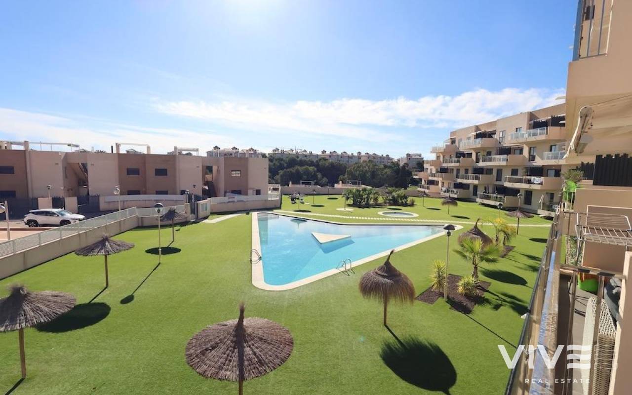 La Zenia, Residencial Sabrina.. 77 m2 große, nach Süden ausgerichtete Wohnung mit 2 Schlafzimmern (davon 1 en suite), 2 Bädern, einem großzügigen Wohn-Esszimmer, einer offenen Küche und einer Terrasse.. Die Immobilie wird möbliert und mit Klimaanlage verkauft. Sie bietet weitläufige Gemeinschaftsbereiche mit Gemeinschaftspool sowie einen Abstellraum und einen Parkplatz.. Die Wohnung verfügt über eine Touristenlizenz und erzielt derzeit hervorragende Erträge.