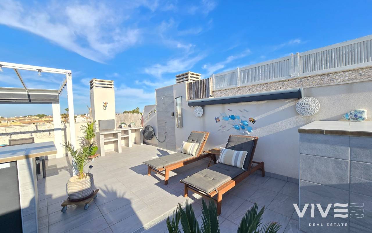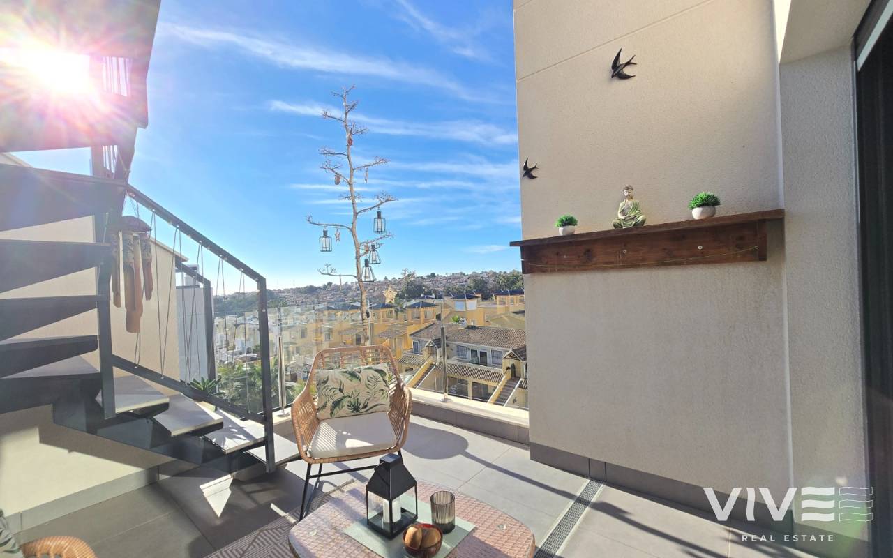 Entdecken Sie dieses außergewöhnliche südlich ausgerichtete Penthouse mit atemberaubendem Meer- und Bergblick, gelegen in einer jungen und perfekt gepflegten Urbanisation in der Nähe des Golfs von Villamartin. Das absolute Highlight ist das geräumige Solarium, das mit einer voll ausgestatteten Außenküche, einem Ess- und Loungebereich und Sonnenterrassen ausgestattet ist, auf denen Sie den ganzen Tag über Licht, Ruhe und Panoramablicke genießen können. Im Inneren empfängt Sie ein heller und geräumiger Wohnbereich mit offener Küche in einer modernen, einladenden Atmosphäre. Das Penthouse verfügt über zwei Schlafzimmer und zwei Badezimmer, eines davon en-suite, die mit hochwertigen Materialien und einer praktischen Aufteilung gestaltet sind. Zusätzlichen Komfort bieten die Tiefgarage (mit Vorinstallation für Elektroautos) und zwei separate Abstellräume, ideal für zusätzlichen Stauraum. Die Urbanisation selbst bietet eine Reihe von Einrichtungen: zwei Swimmingpools, einen Whirlpool, einen Fitnessraum im Freien, einen Petanque-Platz, einen Spielplatz für die Kleinsten und wunderschön angelegte Gemeinschaftsbereiche. Darüber hinaus befindet sich alles in Gehweite zu Bars, Restaurants und anderen Einrichtungen, sodass Entspannung und Komfort immer in Reichweite sind. Als Extras verfügt die Wohnung über Sonnensegel, Windschutz, Wasserenthärter + OSMOSE und wird vollständig möbliert verkauft! Dieses Penthouse verbindet luxuriöses Wohnen, Komfort und eine erstklassige Lage an der Costa Blanca – perfekt als Dauerwohnsitz, Ferienunterkunft oder Investition. Zögern Sie nicht und vereinbaren Sie schnell einen Besichtigungstermin! Suma: 249 Euro/Jahr. Gemeinschaftskosten: 920 Euro/Jahr.