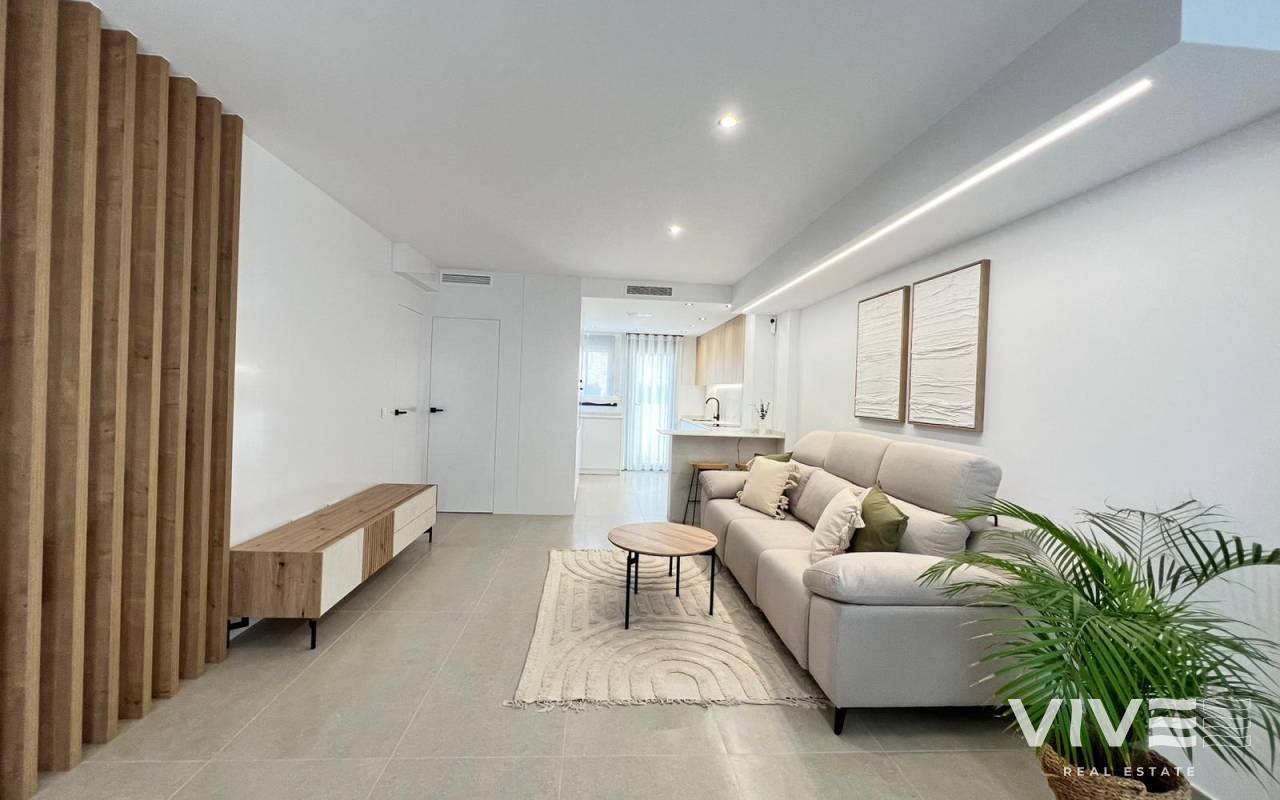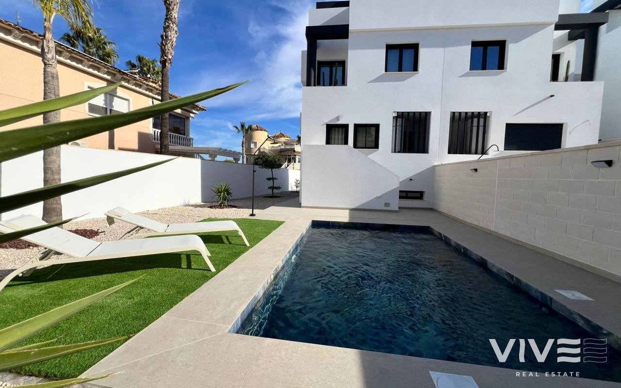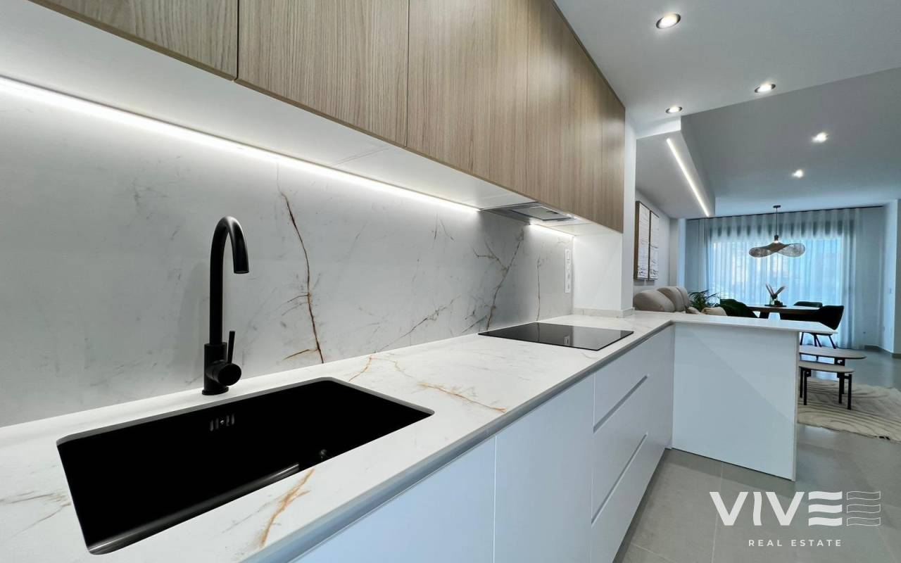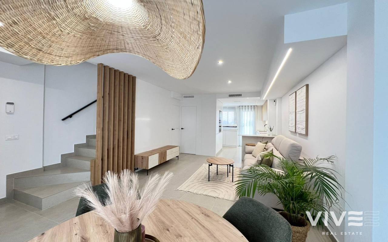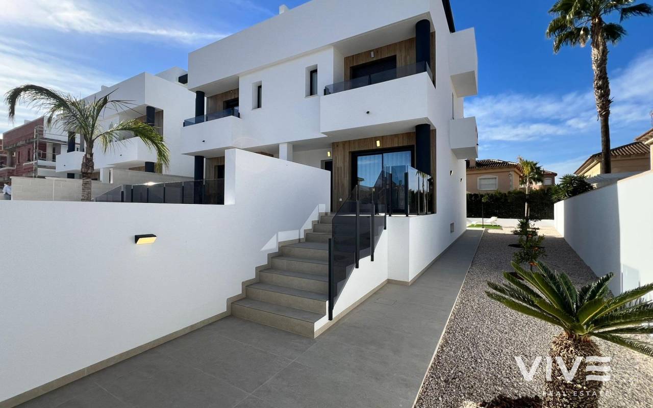 Moderne, neu gebaute Doppelhaushälften in Benferri, Alicante Exklusive Neubauwohnanlage im Benfis Park Entdecken Sie dieses neue Bauprojekt mit 10 modernen Doppelhaushälften im Benfis Park in Benferri, im Herzen der Region Vega Baja in Alicante. Diese charmante Stadt bietet eine ruhige Wohnatmosphäre mit gepflegten Straßen und einer einladenden Gemeinschaft, ideal für Familien, Rentner oder alle, die einen entspannten Lebensstil unter der mediterranen Sonne suchen. Benferri verbindet ländlichen Charme mit einer hervorragenden Anbindung an nahegelegene Städte, Strände und wichtige Verkehrsverbindungen. Geräumige Villen mit privatem Solarium Jede Villa hat eine Gesamtfläche von 222 m² und erstreckt sich über drei Etagen sowie ein privates Solarium. Im Untergeschoss befinden sich eine Garage mit Platz für zwei Autos und ein Abstellraum. Das Erdgeschoss verfügt über einen hellen, offenen Wohn- und Essbereich mit einer modernen Küche, einer Waschküche und einer Gästetoilette mit direktem Zugang zu einer Terrasse, die das Haus umgibt. Im ersten Stock befinden sich drei Schlafzimmer und zwei Badezimmer, eines davon en suite, sowie zwei Terrassen, die zwei der Schlafzimmer bedienen. Die oberste Etage bietet ein privates Solarium von ca. 39 m², das sich perfekt zum Sonnenbaden, Essen im Freien oder Entspannen mit freiem Blick eignet. Moderne Ausstattung und optionaler Pool Die Villen verfügen über eine voll ausgestattete Küche mit Elektrogeräten und eine Vorinstallation für eine Klimaanlage. Ein privater Swimmingpool ist als optionale Zusatzausstattung erhältlich, sodass Käufer ihr Haus weiter personalisieren können. Das Design konzentriert sich auf Komfort, Funktionalität und natürliches Licht und schafft so ein modernes Wohnumfeld, das sich ideal für das ganze Jahr oder für den Urlaub eignet. Leben in Benferri Vega Baja Benferri liegt nur wenige Minuten von Orihuela entfernt und profitiert von einer schnellen Anbindung an die Autobahn AP 7, sodass die Strände der Costa Blanca, der Flughafen Alicante Elche und die wichtigsten Einkaufs- und Freizeitmöglichkeiten schnell und bequem zu erreichen sind. Die umliegende Landschaft ist geprägt von fruchtbarem Ackerland, sanften Hügeln und mediterraner Landschaft, die ein Gefühl des Wohlbefindens und der Verbundenheit mit der Natur vermitteln. Die Stadt bietet alle wichtigen Dienstleistungen wie Supermärkte, Schulen, Sportanlagen und eine lebendige lokale Atmosphäre das ganze Jahr über. Entfernungen zu Sehenswürdigkeiten Orihuela 8 km Strand von Guardamar del Segura 25 km La Finca Golf Resort 18 km Vistabella Golf 14 km Flughafen Alicante Elche 45 km Hafen von Torrevieja 32 km Einkaufszentrum Zenia Boulevard 30 km Ihr neues Zuhause an der Costa Blanca Diese neu gebauten Doppelhaushälften in Benferri bieten großzügigen Platz, modernes Design und eine strategisch günstige Lage in der Nähe von Stränden, Golfplätzen und wichtigen Dienstleistungen. Kontaktieren Sie uns noch heute, um weitere Informationen zu erhalten oder einen privaten Besichtigungstermin zu vereinbaren.