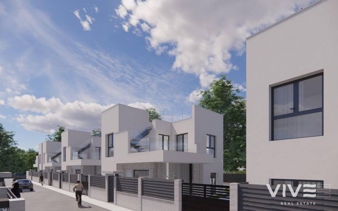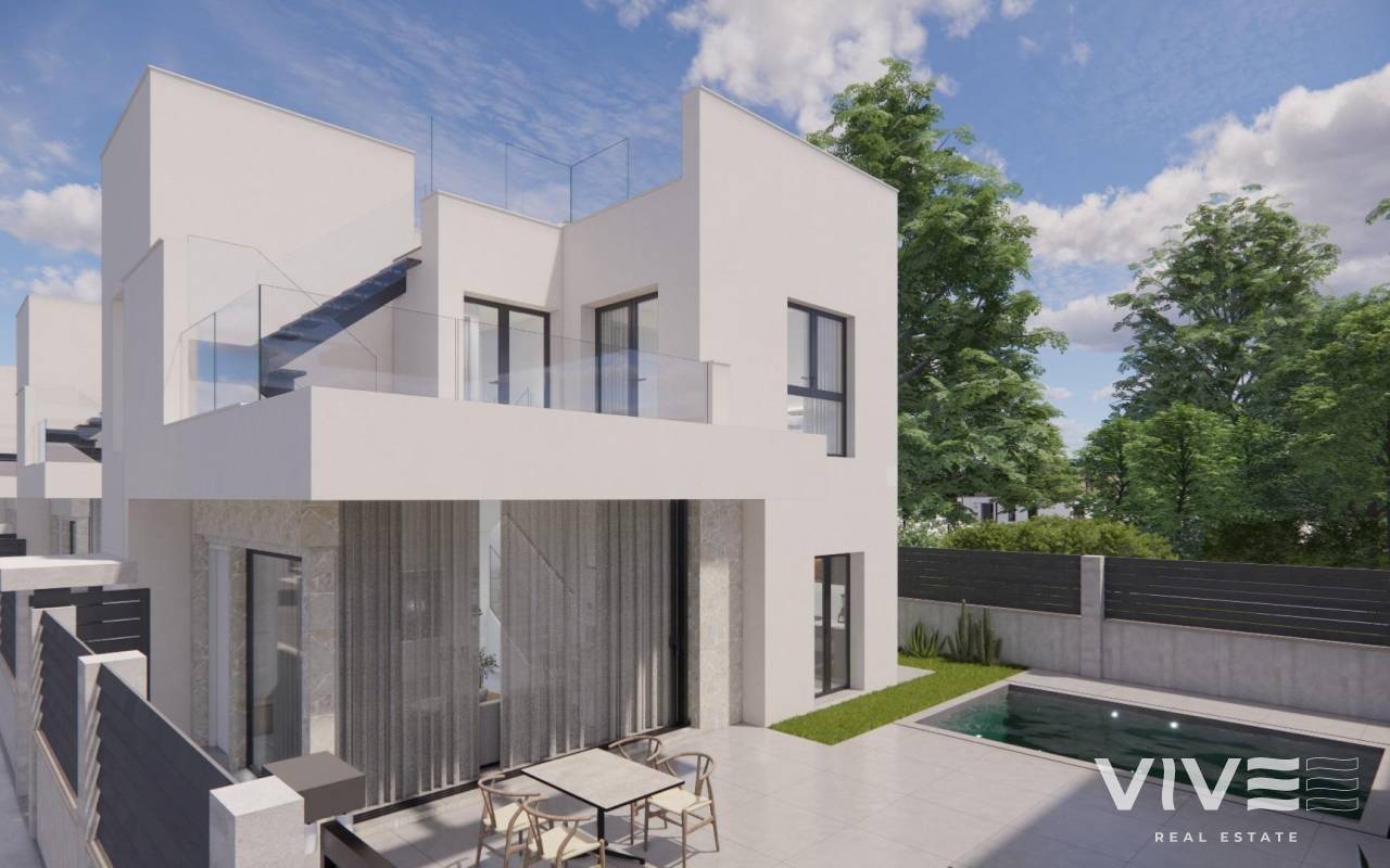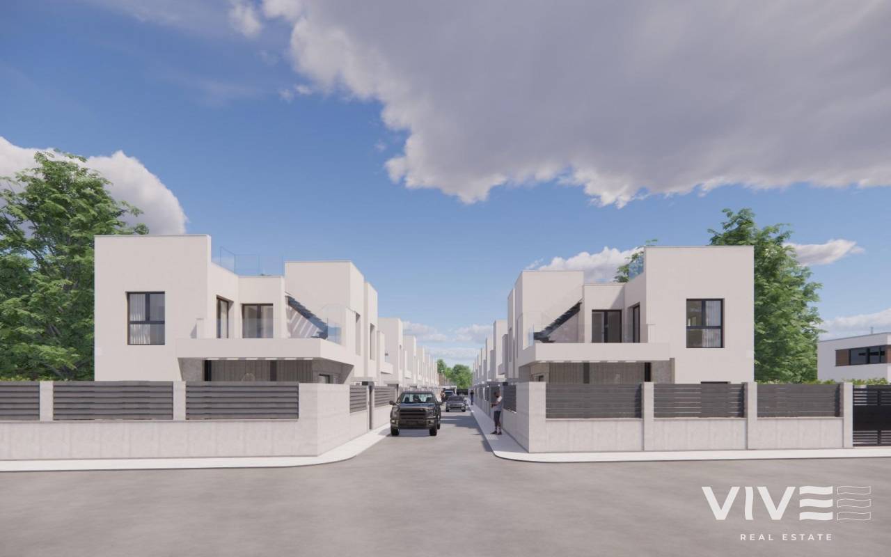 Moderne, neu gebaute Villen in La Herrada Los Montesinos mit privatem Swimmingpool Exklusives Wohnprojekt in ruhiger Lage Diese exklusive Wohnanlage mit 16 modernen Villen befindet sich in der prestigeträchtigen Wohngegend La Herrada in Los Montesinos und bietet Privatsphäre, Komfort und eine ausgezeichnete Lebensqualität. La Herrada ist bekannt für seine ruhige Wohnatmosphäre, die Nähe zu allen Annehmlichkeiten des täglichen Lebens und seine privilegierte Lage zwischen den berühmten Salinen von Torrevieja und La Mata. Es ist ein idealer Ort für diejenigen, die einen entspannten und gesunden mediterranen Lebensstil im Süden der Costa Blanca suchen. Zeitgenössisches Design mit optimierten Innenräumen Jede Villa verfügt über 130 m² gut aufgeteilte Wohnfläche auf zwei Etagen, die so gestaltet sind, dass sie natürliches Licht und Funktionalität maximieren. Die auf Grundstücken ab 250 m² erbauten Immobilien bieten großzügige Außenbereiche, die sich perfekt zum Sonnenbaden, Unterhalten oder Entspannen am privaten Pool eignen. Komfortable Aufteilung auf zwei Etagen Das Erdgeschoss verfügt über einen offenen Wohnbereich mit einer voll integrierten Küche und direktem Zugang zum Garten und Poolbereich. Auf dieser Etage befinden sich außerdem zwei Schlafzimmer, ein komplettes Badezimmer und ein praktischer Waschraum. Im Obergeschoss befinden sich zwei geräumige Schlafzimmer, jedes mit eigenem Badezimmer, eines davon en-suite. Beide Schlafzimmer haben Zugang zu einer 28 m² großen offenen Privatterrasse. Für diejenigen, die noch mehr Platz im Freien wünschen, gibt es gegen Aufpreis ein optionales Solarium auf dem Dach. Hochwertige Ausstattung und moderne Funktionen Die Villen verfügen über eine hochwertige Ausstattung wie Badezimmermöbel, Spiegel, Duschwände und Fußbodenheizung in allen Badezimmern. Es gibt eine Vorinstallation für eine Klimaanlage, ein motorisiertes Eingangstor für Fahrzeuge, einen privaten Parkplatz auf dem Grundstück und einen geschlossenen Zugang zur Wohnanlage über eine private interne Straße. Erstklassige Lage in der Nähe wichtiger Annehmlichkeiten und Sehenswürdigkeiten Die Strände von Guardamar und Torrevieja sind 9 km entfernt La Marquesa Golf, La Finca Golf und Vistabella Golf sind weniger als 5 km entfernt Der Flughafen Alicante ist 29 km entfernt Naturparks, Salinen, Radwege und Wanderwege in der Umgebung Komfortables Wohnen im Herzen der Costa Blanca Diese neu gebauten Villen in Los Montesinos bieten die perfekte Kombination aus modernem Komfort, natürlicher Umgebung und ausgezeichneter Erreichbarkeit. Ob Sie einen dauerhaften Wohnsitz oder ein Ferienhaus suchen, diese Wohnanlage bietet Ihnen alles, was Sie brauchen, um einen ruhigen und komfortablen mediterranen Lebensstil zu genießen. Kontaktieren Sie uns noch heute, um einen Besichtigungstermin zu vereinbaren und sich Ihr neues Zuhause in La Herrada zu sichern.