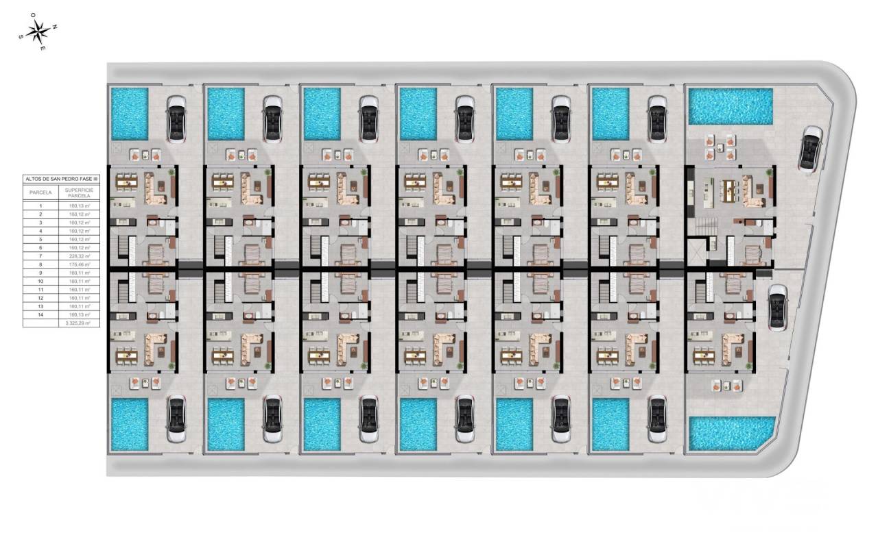 Moderne Neubauvillen mit privatem Pool in San Pedro del Pinatar Zeitgenössisches Design und hochwertiges Wohnen Entdecken Sie die dritte Phase dieses exklusiven Wohnprojekts in San Pedro del Pinatar, wo moderne Architektur auf Komfort und Funktionalität trifft. Diese 14 Doppelhaushälften sind in minimalistischem Stil und mit hochwertigen Oberflächen gestaltet und bieten ein elegantes und anspruchsvolles Wohnerlebnis an der Costa Calida. Jede Villa verfügt über 3-4 geräumige Schlafzimmer, 3 Badezimmer, einen privaten Swimmingpool, Terrassen und einen privaten Garten und bietet somit die perfekte Umgebung für Privatsphäre, Entspannung und mediterranes Leben im Freien. San Pedro del Pinatar ist eine der begehrtesten Städte in der Region Mar Menor, bekannt für ihre natürlichen Salzseen, ruhigen Strände und ihr ganzjährig angenehmes Klima, was sie sowohl für den dauerhaften Wohnsitz als auch für den Urlaub ideal macht. Offener Grundriss für modernes Wohnen Die Villen sind sorgfältig aufgeteilt und verfügen über eine offene Küche, die mit einem hellen Wohn- und Essbereich verbunden ist. Große Fenster im Wohnzimmer mit motorisierten Jalousien bieten direkten Zugang zum Poolbereich und lassen natürliches Licht in die Innenräume strömen. Zu den wichtigsten Merkmalen jeder Immobilie gehören: 3 Schlafzimmer mit Einbauschränken 3 voll ausgestattete Badezimmer mit Waschtischen, Spiegeln und Duschwänden Möblierte Küche mit Balay-Geräten Privater Pool und Gartenbereich LED-Beleuchtung im Innen- und Außenbereich Terrassen im ersten Stock und optionales Solarium auf dem Dach Parkplatz auf dem Grundstück Aerothermisches System für Warmwasser Photovoltaik-Solarmodule für verbesserte Energieeffizienz Vorinstallation für eine Klimaanlage Diese Häuser sind so konzipiert, dass sie Nachhaltigkeit, Komfort und modernen Stil in jedem Detail vereinen. Erstklassige Lage in der Nähe von Stränden und Dienstleistungen San Pedro del Pinatar liegt zwischen dem Mar Menor und dem Mittelmeer und ist ein Paradies für Strandliebhaber und Wassersportler. Die Stadt bietet einen lebhaften Yachthafen, natürliche Schlammbäder, Geschäfte, Restaurants, Sportanlagen und das ganze Jahr über einen exzellenten Service. Strände des Mar Menor 3 km Mittelmeerstrände 5 km Einkaufszentrum Dos Mares 5 km Lo Romero Golf 10 km Roda Golf 15 km Flughafen Murcia Corvera 30 km Flughafen Alicante 80 km Yachthafen San Pedro 4 km Ein ideales Zuhause für Lifestyle und Investition Dank ihrer Lage, ihres Designs und ihrer energieeffizienten Ausstattung sind diese Villen eine ausgezeichnete Gelegenheit als Dauerwohnsitz, Ferienhaus oder Mietinvestition in einer der attraktivsten Gegenden der Costa Calida. Kontaktieren Sie uns noch heute für weitere Informationen oder um eine Besichtigung zu vereinbaren und sich Ihre neue Villa in San Pedro del Pinatar zu sichern.