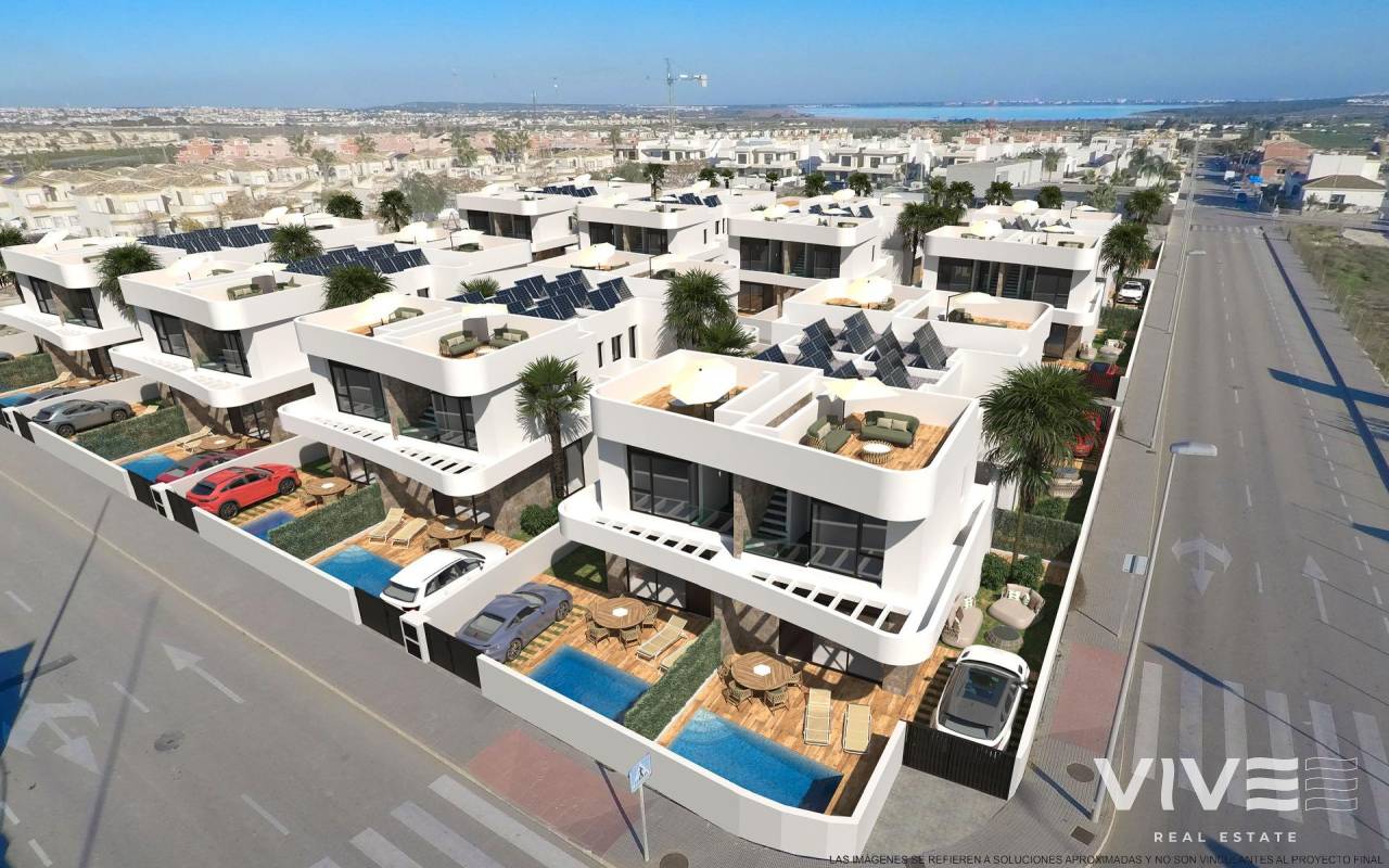 NEU GEBAUTE VILLEN IN LOS MONTESINOS Neubauprojekt in La Herrada (Los Montesinos), in einer privilegierten Lage in der Nähe der besten Strände von Guardamar und mit allen Annehmlichkeiten, die eine große Gemeinde wie Los Montesinos bietet. Dieses Projekt besteht aus 32 Villen, einige als Doppelhaushälften auf 2 Etagen und andere als unabhängige Villen auf einer Etage, die mit der besten Ausstattung geliefert werden, einschließlich Solarium, Badewannenabtrennung, Garten mit Kunstrasen von bester Qualität, dekorativen Gartenelementen und Vorinstallation für Sonnenkollektoren, Steckdose und Türmotor für Fahrzeuge. Villa hat 3 Schlafzimmer, 3 Bäder, offene Küche mit Wohnzimmer, Einbauschränke, Terrasse. Das typische Dorf Los Montesinos ist strategisch günstig gelegen, 10 Autominuten von den Stränden und dem Freizeitangebot von Torrevieja (mit allen Dienstleistungen einer Großstadt: Theater, 2 Krankenhäuser, internationale Schulen, etc.), mehrere Golfplätze und mit einfachem Zugang zur Autobahn A7, um den Flughafen Alicante in 20 Minuten zu erreichen. In der Urbanisation gibt es Supermärkte und Bars für den täglichen Bedarf, es ist eine ländliche und ruhige Umgebung. Das Klima dieser Gegend garantiert 300 Sonnentage im Jahr mit einer Durchschnittstemperatur von 20ºC, was zusammen mit der reichhaltigen Gastronomie und dem kulturellen und sportlichen Angebot der Umgebung diese Gegend zu einem idealen Ort macht, um ein zweites Feriendomizil zu errichten oder einen ruhigen Ort, um dauerhaft zu leben.