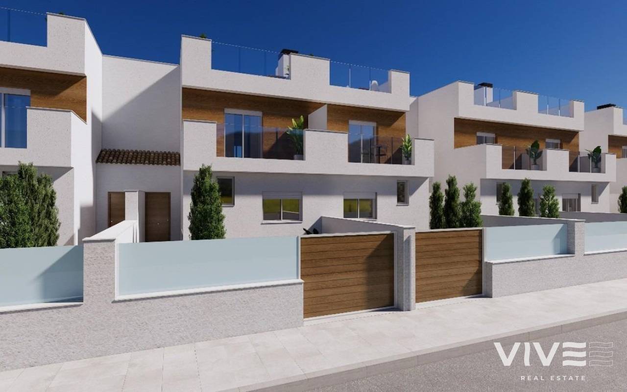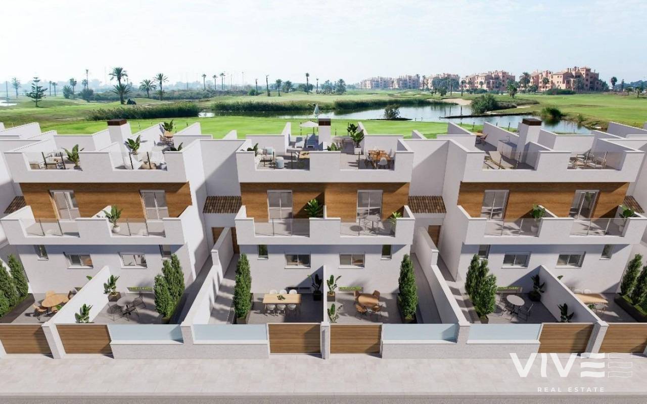 Neubau-Reihenhäuser in erster Linie am La Serena Golf in Los Alcázares Premium-Lage am Golfplatz und am Meer Entdecken Sie eine exklusive Wohnanlage mit 31 Neubau-Reihenhäusern in erster Linie am La Serena Golf in Los Alcázares, nur 600 m vom Mar Menor entfernt. Im Herzen der Costa Cálida gelegen, vereint dieser privilegierte Standort Golf, Strand und mediterranen Lebensstil. Mit allen Annehmlichkeiten in unmittelbarer Nähe und hervorragender Verkehrsanbindung ist dies der ideale Ort sowohl für den Urlaub als auch für das ganzjährige Wohnen. Moderne Häuser mit privatem Pool und Dachsolarium Jedes Haus bietet ein stilvolles, zeitgemäßes Design und helle Innenräume. Die Immobilien verteilen sich auf drei Ebenen plus Dachsolarium und bieten maximalen Komfort und Privatsphäre: Untergeschoss mit privater Garage für 2 Autos und Zugang zu einem Hof. Erdgeschoss mit offenem Wohn-/Essbereich und Küche mit Zugang zum Garten und privatem Pool, 1 Schlafzimmer und 1 Badezimmer Erster Stock mit 2 Schlafzimmern, 1 Badezimmer und 2 Terrassen Dachsolarium mit Sommerküche, ideal zum Entspannen und Genießen der Panoramablicke Ost- und Westausrichtung sorgen für hervorragendes Tageslicht und ein angenehmes Outdoor-Wohngefühl den ganzen Tag über. Hochwertige Ausstattung und Komfort Diese Häuser werden nach höchsten Standards gebaut und bieten Premium-Ausstattung, darunter: Privater Swimmingpool Tiefgarage für 2 Autos mit motorisiertem Tor Aerothermie-System für Warmwasser Vollständig installierte, kanalisierte Klimaanlage Möblierte und ausgestattete Küche Voll ausgestattete Badezimmer mit Möbeln, Spiegeln und Duschabtrennungen Sicherheitseingangstür Wohnen zwischen Meer und Fairway Umgeben von mediterraner Landschaft bietet diese exklusive Anlage ein ruhiges Wohnambiente direkt am Serena Golf, einem renommierten 18-Loch-Golfplatz, umgeben von Natur und ruhigen Seen. Die warmen, flachen Gewässer des Mar Menor eignen sich perfekt zum Schwimmen sowie für Wassersportarten wie Segeln, Stand-Up-Paddling und Kajakfahren – das ganze Jahr über. Entfernungen: Strand (Mar Menor): 600 m La Serena Golf: direkt am Komplex Zentrum von Los Alcázares: 2 km Cartagena: 22 km Stadt Murcia: 40 km Flughafen Murcia: 30 km Flughafen Alicante: 90 km Sichern Sie sich Ihren mediterranen Lebensstil Ganz gleich, ob Sie einen Hauptwohnsitz, ein Ferienhaus oder eine rentable Investitionsmöglichkeit suchen – diese Häuser bieten Luxus, Komfort und einen exklusiven Küsten-Lifestyle. Kontaktieren Sie uns noch heute, um einen Besichtigungstermin zu vereinbaren und Ihr neues Zuhause in Los Alcázares zu sichern.