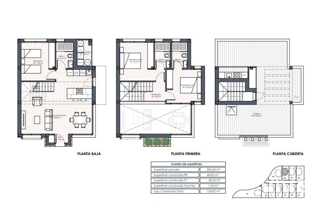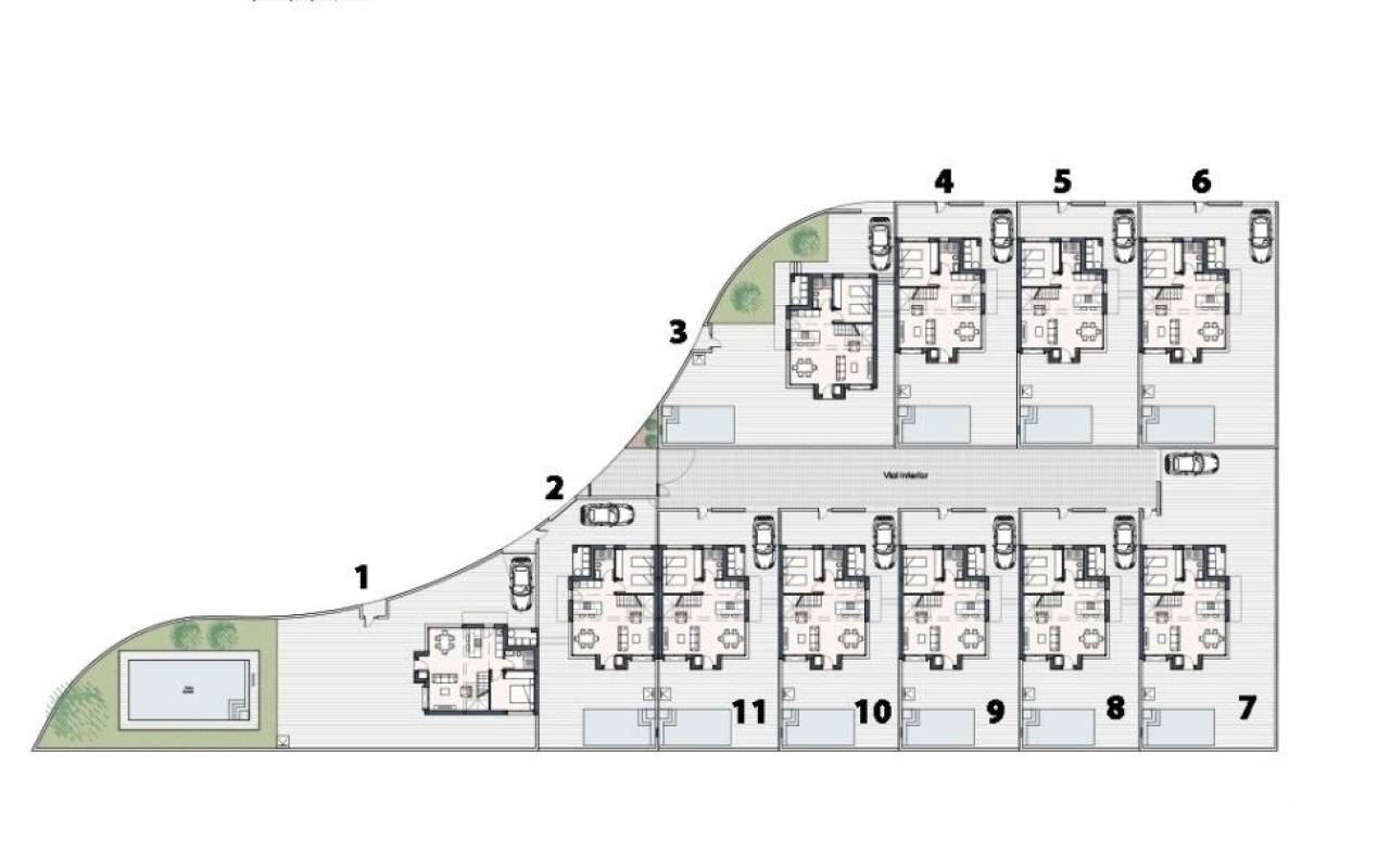 NEUBAU VON VILLEN IN LOS MONTESINOS Neubauvillen mit 3 Schlafzimmern und 3 Bädern, offener Küche mit Wohn-Esszimmer. Alle Villen haben eine Terrasse, einen privaten Swimmingpool, einen privaten Garten und eine Auffahrt. Gegen Aufpreis ist auch ein Untergeschoss möglich. Alle Villen sind aus hochwertigen Materialien und mit fortschrittlicher Technologie gebaut, um den Komfort und die Bequemlichkeit unserer Kunden zu gewährleisten. Der typische Ort Los Montesinos ist strategisch günstig gelegen, nur 10 Autominuten von den Stränden und dem Freizeitangebot von Torrevieja (mit allen Dienstleistungen einer Großstadt: Theater, 2 Krankenhäuser, internationale Schulen, usw.), von mehreren Golfplätzen und mit einfachem Zugang zur Autobahn A7, um den Flughafen Alicante in 20 Minuten zu erreichen. In der Urbanisation gibt es Supermärkte und Bars für den täglichen Bedarf, es ist eine ländliche und ruhige Umgebung. Das Klima in dieser Gegend garantiert 300 Sonnentage im Jahr mit einer Durchschnittstemperatur von 20ºC, was zusammen mit der reichhaltigen Gastronomie und den kulturellen und sportlichen Aktivitäten in der Umgebung diese Gegend zu einem idealen Ort macht, um einen Zweitwohnsitz für den Urlaub oder einen ruhigen Ort zum dauerhaften Leben einzurichten.