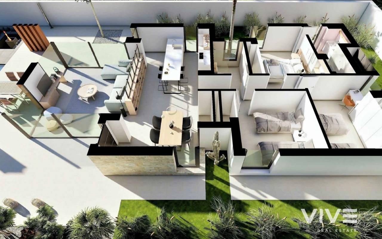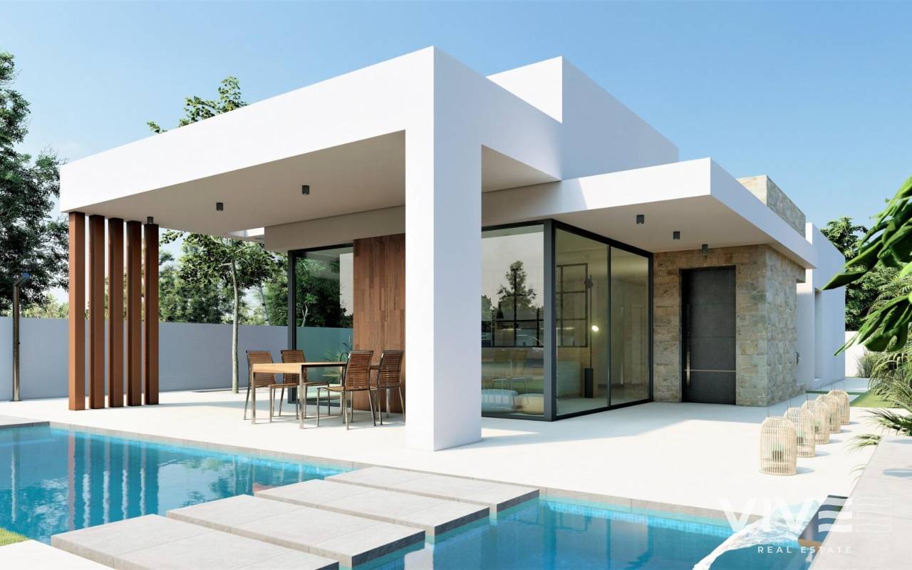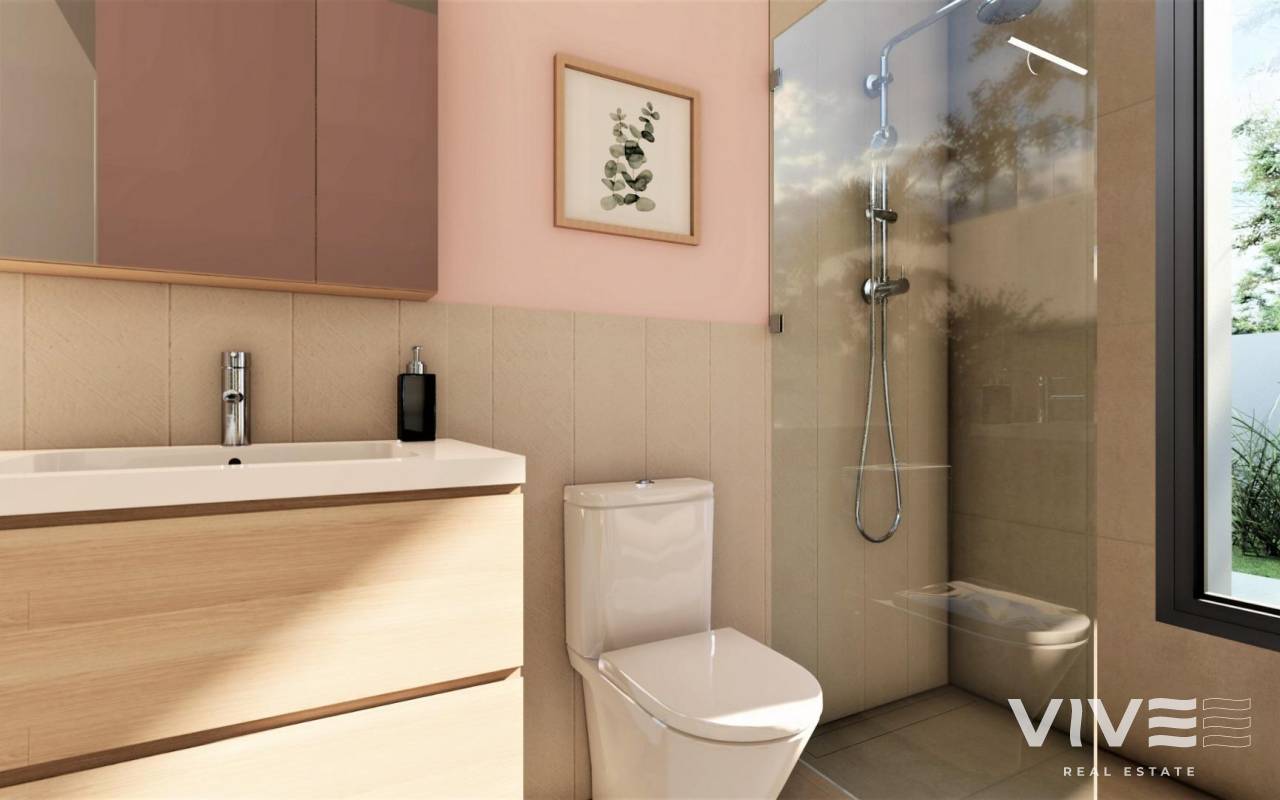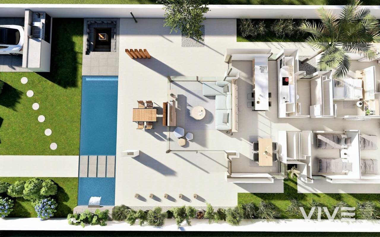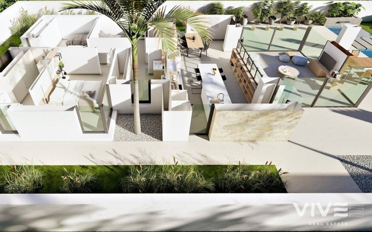 NEU GEBAUTE VILLEN IN SAN FULGENCIO Neubauvillen in San Fulgencio, nur 5 km vom Strand entfernt. Die Villen bieten 3 Schlafzimmer, 2 Bäder und eine geräumige Küche, Esszimmer, Wohnzimmer, Schwimmbad mit Wasserfall und zwei Pools: Planschbecken von 1,95x2,60 m und 0,6 m tief, und Pool von 5,60x2,60 m, zwischen 1 und 1,5 m variable Tiefe. Eine große, nach Süden ausgerichtete Veranda verbindet das Wohnzimmer mit dem Außenbereich und öffnet sich zu einem modernen und funktionalen Außenbereich, in dem Sie den privaten Swimmingpool, den Grill, den Chillout und den großen Gartenbereich, der ihn umgibt, genießen können. Die einfachen und klaren Linien der Möbel tragen zur Integration mit dem Rest des Hauses bei. Hölzerne Details verleihen der Atmosphäre eine warme Note. Die Bäder, in denen Farben mit natürlichen und warmen Tönen kombiniert werden, schaffen eine gemütliche Atmosphäre, die zusammen mit der direkten Beziehung zum Außenbereich eine Verbindung mit der Natur ermöglicht und so zu großen Momenten der Entspannung führt. Das Hauptschlafzimmer verfügt über einen privaten Innenhof, der zusammen mit dem Licht, das durch seine Fenster eindringt, eine entspannende Atmosphäre schafft, perfekt für Ruhe und Entspannung. San Fulgencio ist ein angenehmes Dorf mit mehreren Restaurants und Geschäften. Die Lage ist sehr gut, da die fantastischen Strände von La Marina und die etwas größere Stadt Guardamar in der Nähe liegen. Die Stadt San Fulgencio liegt etwa 30 Minuten vom Flughafen Alicante-Elche, 6 km vom nächsten Golfplatz und nur 5 km vom nächsten Strand entfernt.