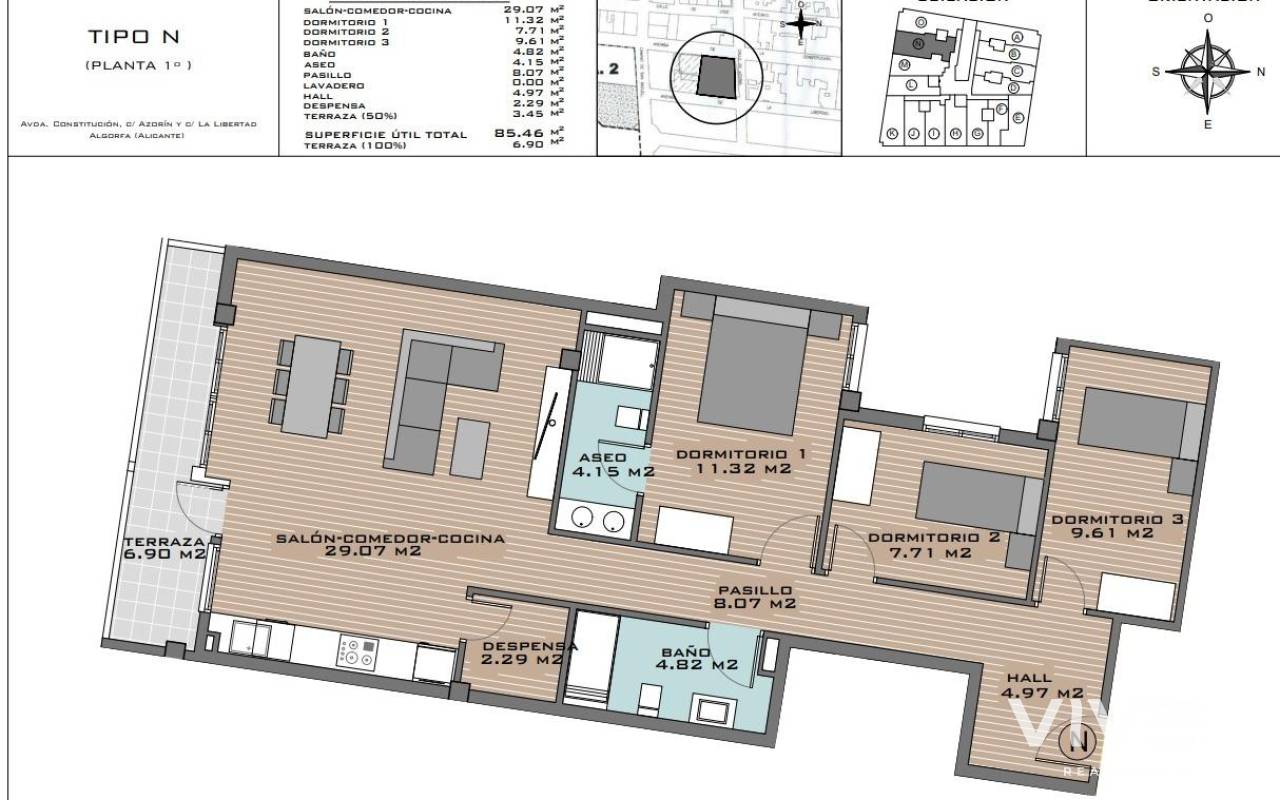 NEUBAU WOHNUNG IN ALGORFA Neubau einer Wohnanlage mit 41 stilvollen Wohnungen und Penthäusern in Algorfa. Die Wohnungen bestehen aus 1, 2 und 3-Schlafzimmer-Wohnungen, mit 1 oder 2 Badezimmern, offener Küche mit Wohnbereich und Einbauschränken. Moderne Penthäuser haben ein privates Solarium. Pre-Installation von warm / kalt Klimaanlage, Versorgung über Kanäle und Rückkehr über Gitter in abgehängten Decke. Küche und Front aus kompaktem PVC, ausgestattet mit Unter- und Oberschränken, Schubladenfronten und Türen in einer Kombination aus weißem Laminat und Holzlaminat. Energielabel A. Zugang zu einem Gemeinschaftspool für Entspannung und Freizeit. Fitnessstudio vor Ort für Gesundheits- und Fitnessbegeisterte. Im Herzen eines traditionellen Dorfes gelegen, bietet Algorfa die perfekte Mischung aus spanischem Charme und modernen Annehmlichkeiten, was es zu einem idealen Ziel für Touristen und Einheimische macht. Das Stadtzentrum, die Schulen und der Golfplatz La Finca sind von der Wohnanlage aus zu Fuß zu erreichen. Nur 15 Minuten von schönen Stränden und Krankenhäusern entfernt. Eine kurze Fahrt von 35 Minuten zum Flughafen.