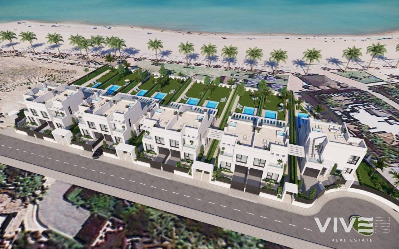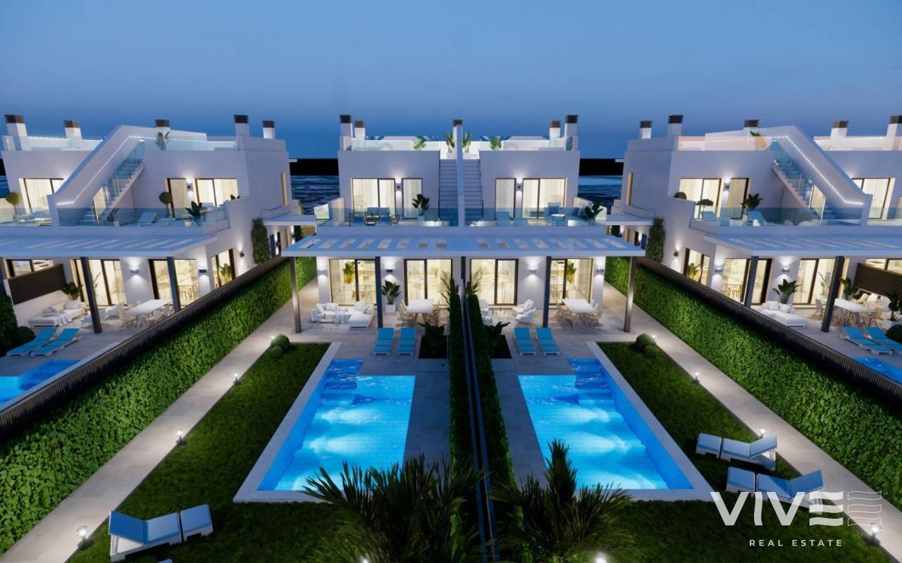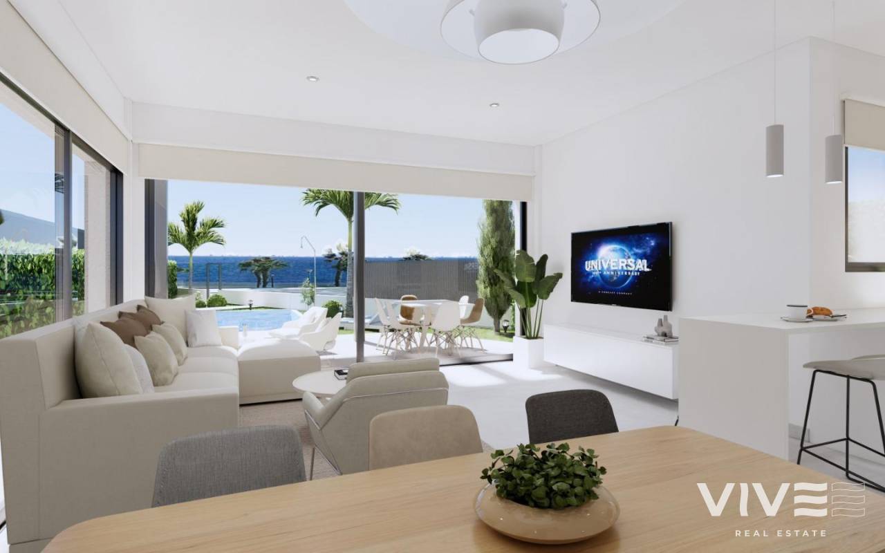 Luxuriöse Neubauvillen am Wasser in Los Alcázares Entdecken Sie das ultimative mediterrane Leben mit diesem exklusiven Wohnprojekt, das neun moderne Villen direkt am Wasser in der wunderschönen Küstenstadt Los Alcázares in Murcia umfasst. Die Villen befinden sich in der begehrten Gegend Nueva Ribera und sind auf Luxus, Privatsphäre und Bequemlichkeit ausgelegt. Golfplätze, Einkaufszentren und Verkehrsknotenpunkte sind von hier aus bequem zu erreichen. Jede Villa bietet eine hochwertige Ausstattung, einen atemberaubenden Meerblick und einen privaten Pool und ist damit die ideale Wahl für alle, die einen modernen Rückzugsort an der Küste suchen. Erstklassige Lage in Los Alcázares Eingebettet in Los Alcázares, einer charmanten Stadt an der spanischen Costa Cálida, genießt dieses Wohnprojekt eine beneidenswerte Lage mit direktem Zugang zur Strandpromenade. Diese friedliche Gegend verbindet die Ruhe des Lebens am Meer mit dem einfachen Zugang zu allen Annehmlichkeiten. Das pulsierende Stadtzentrum von Los Alcázares ist nur 2 km entfernt, während der internationale Flughafen von Murcia nur 35 km entfernt ist, was eine bequeme Anreise ermöglicht. Der renommierte Roda Golf Club liegt nur 4 km entfernt und bietet Freizeitmöglichkeiten in der Nähe des Hauses, und die Autobahn AP-7 ermöglicht einen schnellen Zugang zu den nahe gelegenen Städten und Sehenswürdigkeiten. Exklusive Villen mit erstklassigen Annehmlichkeiten Das Projekt umfasst insgesamt neun Villen: acht Doppelhaushälften und eine freistehende Villa mit jeweils über 300 Quadratmetern Grundstücksfläche. Diese geräumigen Villen sind mit Eleganz und Komfort ausgestattet und verfügen über: Privater Pool und Solarium: Jede Villa verfügt über einen privaten Salzwasser-Pool und eine Dachterrasse mit Whirlpool, LED-Beleuchtung und Vorinstallation für eine Außenküche - ideal, um Gäste zu unterhalten und dabei den Blick auf das Mar Menor zu genießen. Moderne, voll ausgestattete Küche: Die Küche verfügt über integrierte Geräte von Bosch, darunter ein Backofen, eine Mikrowelle, ein Induktionskochfeld und eine Dunstabzugshaube. Das elegante Design umfasst eine Halbinsel und Arbeitsflächen aus Silestone oder Porzellan. Anspruchsvolle Klimatisierung: Genießen Sie das ganze Jahr über den Komfort einer kanalisierten Klimaanlage auf jeder Etage, die mit Hochleistungsgeräten von Mitsubishi oder Daikin ausgestattet ist. Stilvolle Badezimmer: Zu den hochwertigen Badezimmern gehören hängende Waschtische, Duschwannen aus Harz und eingebaute Duschabtrennungen. Energieeffizientes Design: Jede Villa verfügt über eine fortschrittliche Isolierung, Guardian-Sun-Akustikfenster mit Doppelverglasung und ein aerothermisches Wassererwärmungssystem für optimale Energieeffizienz. Intelligente Hausausstattung: Elektrische Rollläden, LED-Außenbeleuchtung und die Vorinstallation für eine Ladestation für Elektrofahrzeuge sorgen für modernen Komfort. Sichere und private Gemeinschaft Diese Villen befinden sich in einer privaten, bewachten Wohnanlage mit 24-Stunden-Sicherheitsdienst und bieten von jedem Garten aus einen direkten Zugang zur Strandpromenade, was sowohl Privatsphäre als auch Anbindung gewährleistet. Erleben Sie das Küstenleben in Los Alcázares - vereinbaren Sie noch heute einen Besichtigungstermin! Genießen Sie den Luxus des Lebens an der Küste in Los Alcázares. Mit der Nähe zu Roda Golf und Einkaufszentren im Umkreis von 5 km bieten diese Villen einen unvergleichlichen Lebensstil. Kontaktieren Sie uns noch heute, um einen Besichtigungstermin zu vereinbaren und sich Ihre Traumimmobilie am Wasser zu sichern.