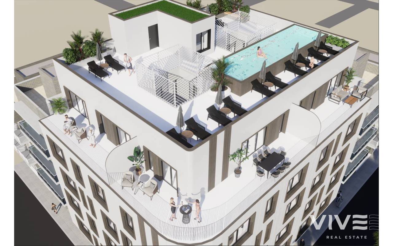Das Gebäude verfügt über gemeinschaftliche Bereiche, die darauf ausgelegt sind, das mediterrane Klima das ganze Jahr über zu genießen. Besonders hervorzuheben ist der Gemeinschaftspool auf der Dachterrasse mit Solariumbereich und Ruhezone – perfekt zur Entspannung, ohne das Wohngebäude verlassen zu müssen.