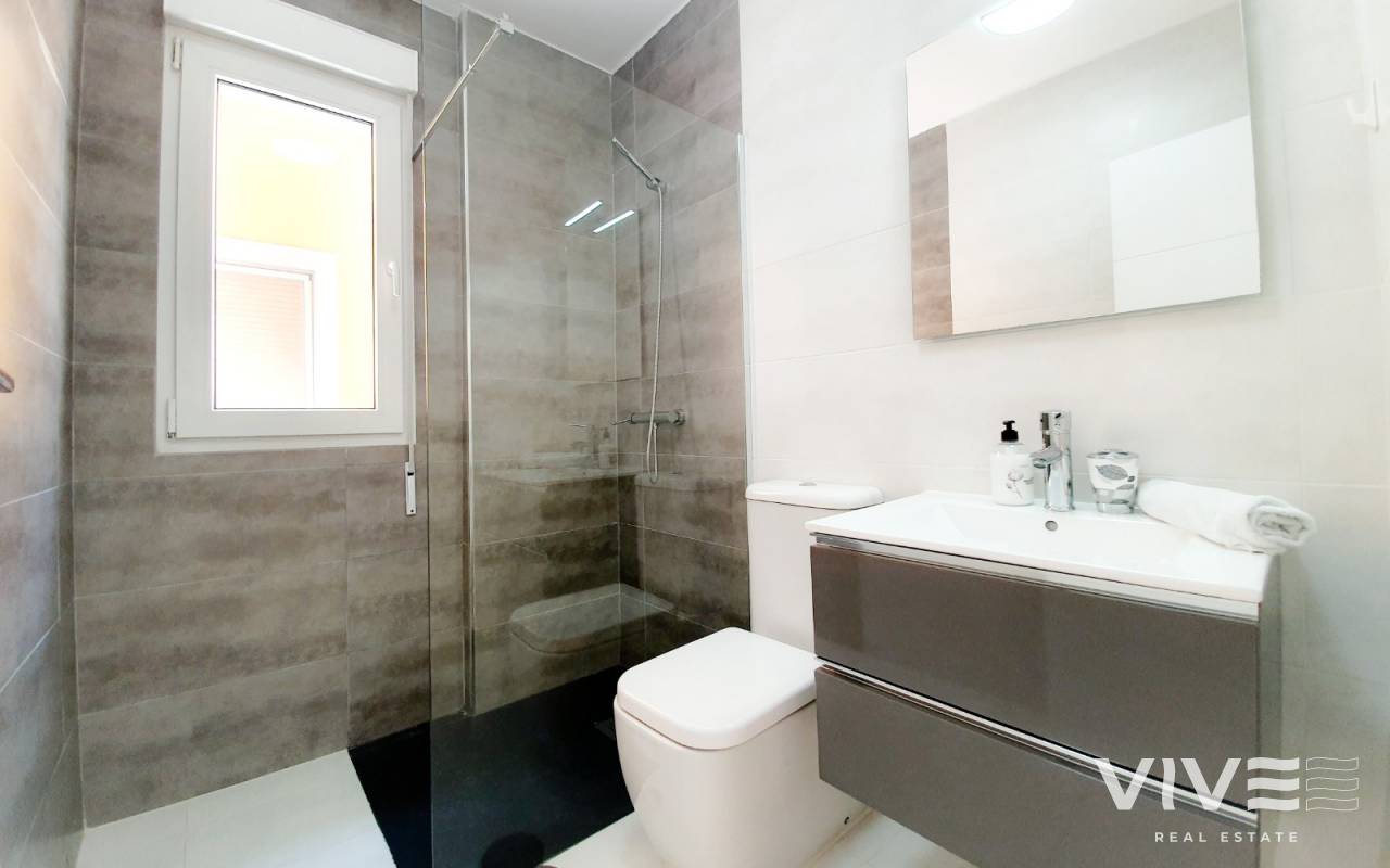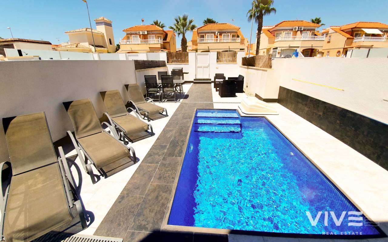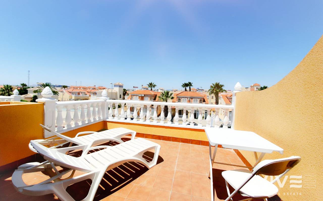 Wunderschönes Reihenhaus mit eigenem Schwimmingpool, es hat 3 Schlafzimmer, 2 Badezimmer und ein GästeWC. Marco Polo liegt nur etwa 300 m vom grossen Einkaufszentrum La Zenia Boulevard entfernt und hat alles, was Sie für einen schönen Urlaub brauchen. Der grosse Wohnraum hat eine Essecke incorporiert und die volleingerichtete Küche. Auch ein GästeWC befindet sich auf dieser Ebene. Im ersten Stock haben Sie ein Einzelschlafzimmer und ein Doppelschlafzimmer, dazu noch ein volleingerichtetes Bad. Im Obergeschoss liegt ebenfalls ein Doppelschlafzimmer mit eigenem Bad und wunderschönem Balkon, der zum Entspannen einläd.
