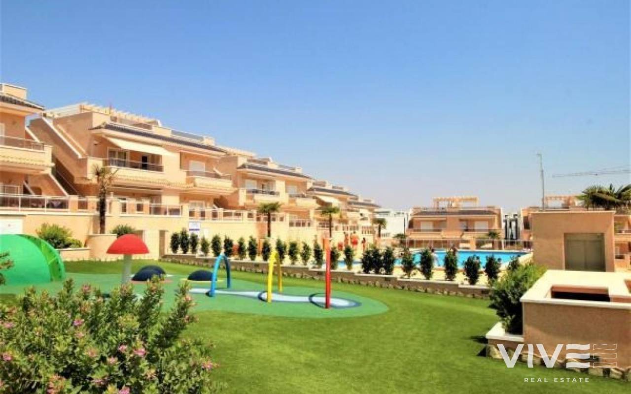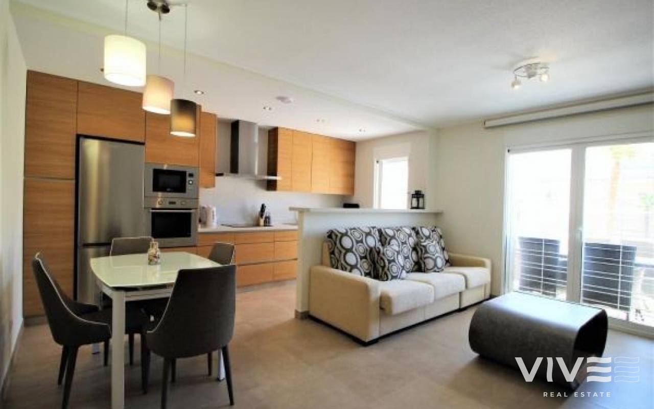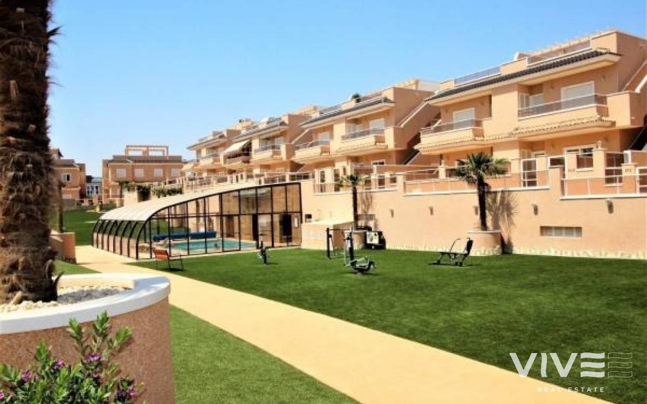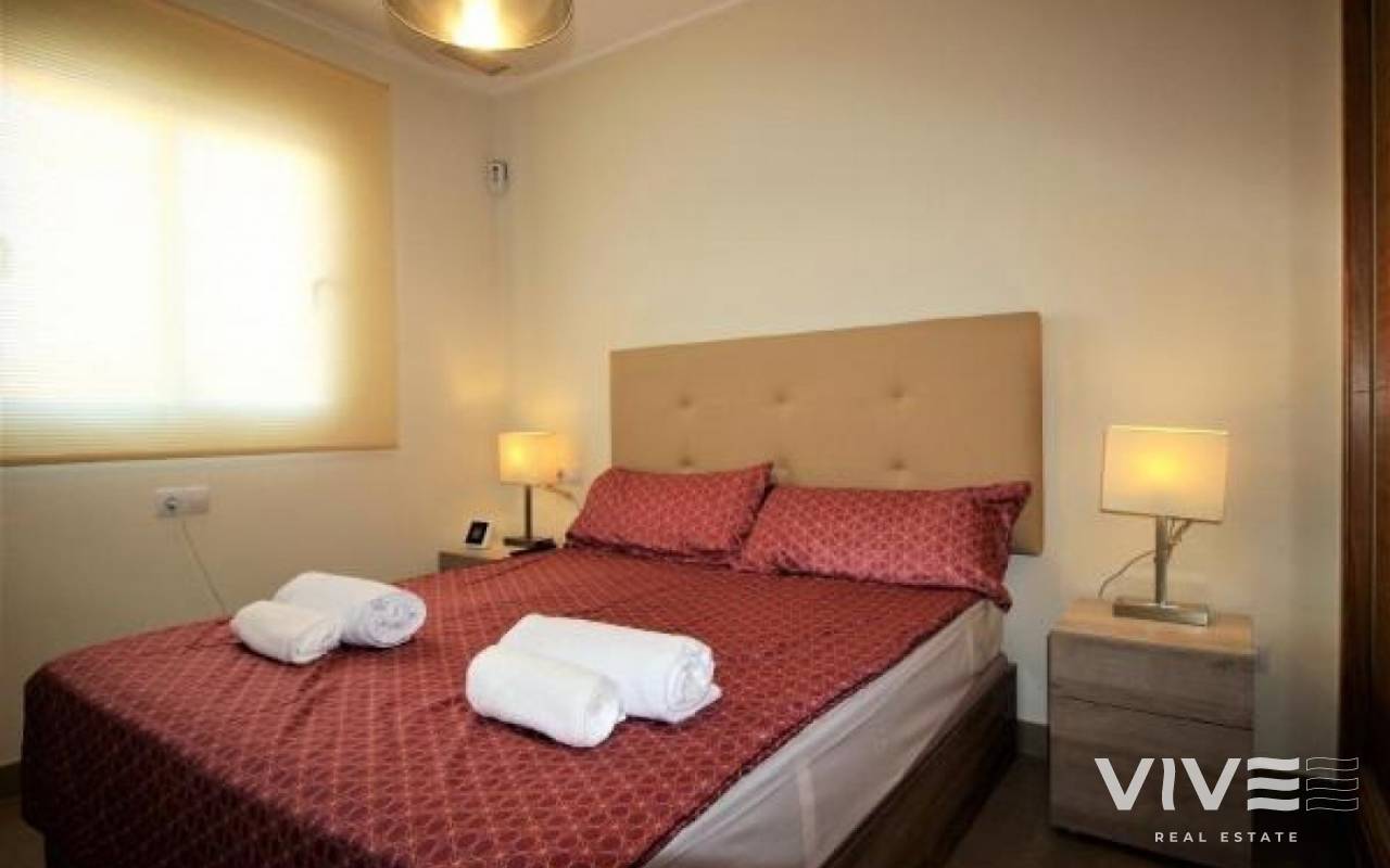 VISTA AZUL Bungalow en planta baja con dos dormitorios dobles con armarios empotrados y dos baños, un dormitorio tiene el  con baño en suite, cocina americana totalmente equipada, salón comedor con salida a la terraza desde la que se puede salir a las zonas comunes con piscina al aire libre, piscina cubierta climatizada, sauna, jacuzzi, parque infantil y zonas verdes.