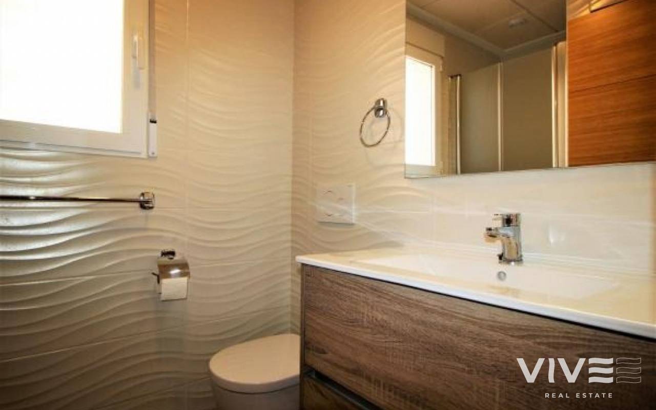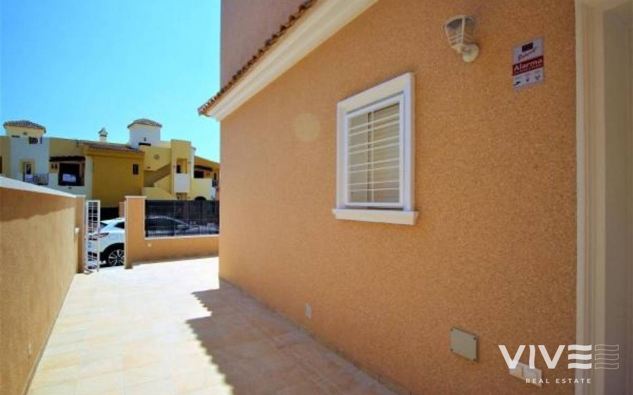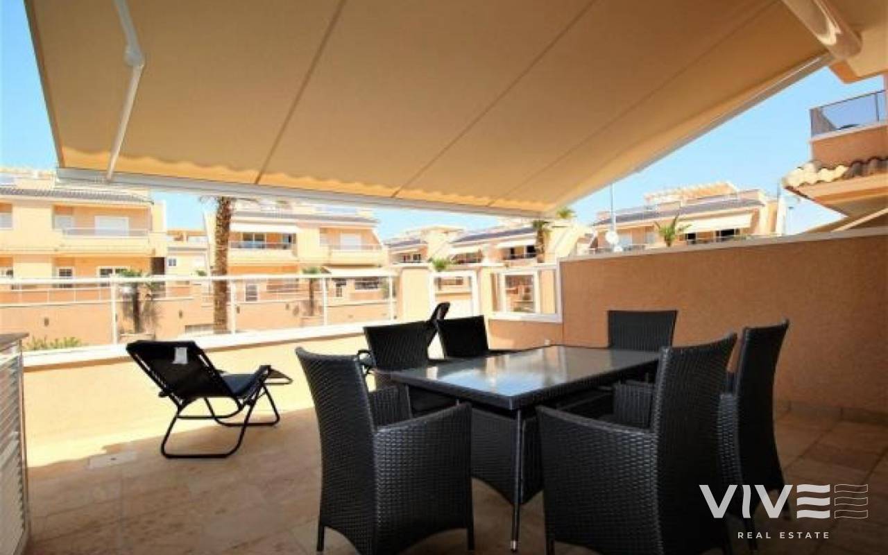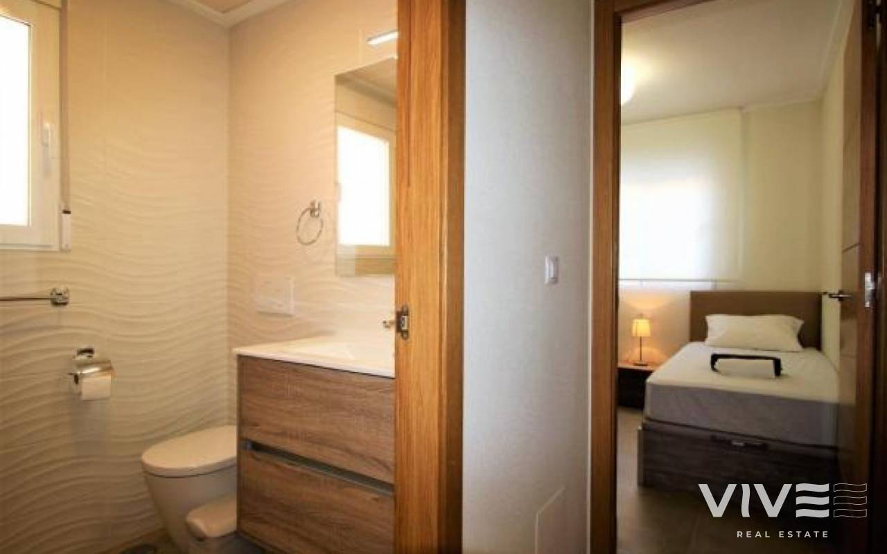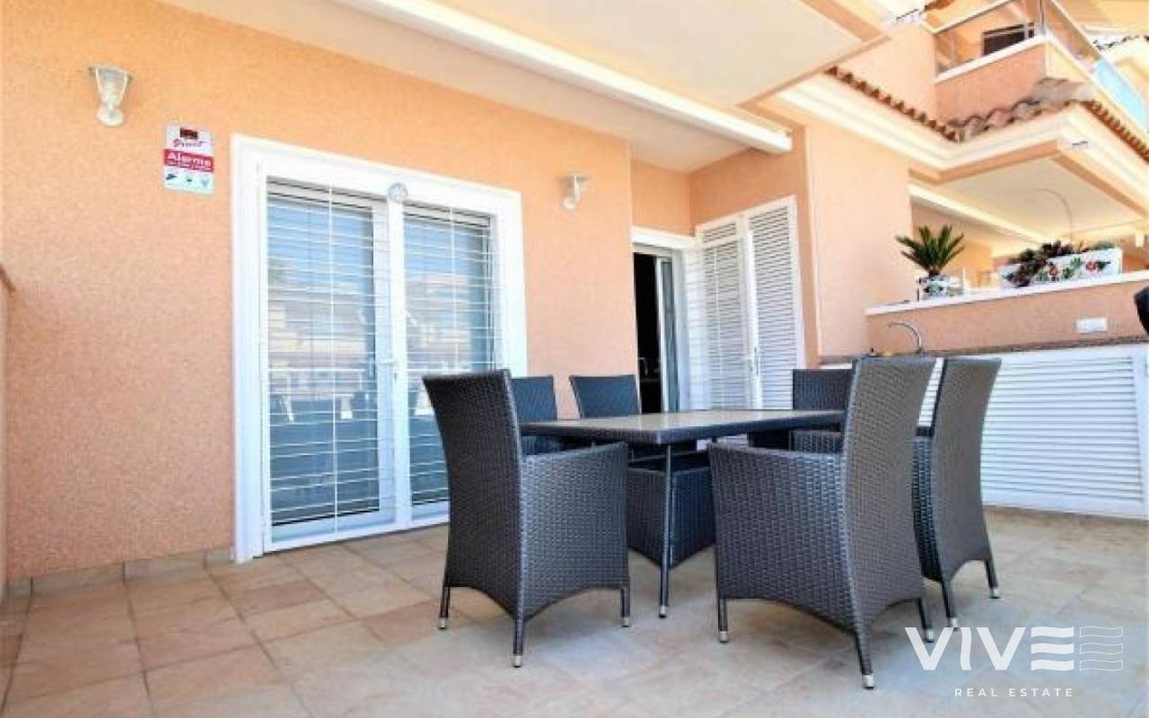 VISTA AZUL Bungalow en planta baja con dos dormitorios dobles con armarios empotrados y dos baños, un dormitorio tiene el  con baño en suite, cocina americana totalmente equipada, salón comedor con salida a la terraza desde la que se puede salir a las zonas comunes con piscina al aire libre, piscina cubierta climatizada, sauna, jacuzzi, parque infantil y zonas verdes.