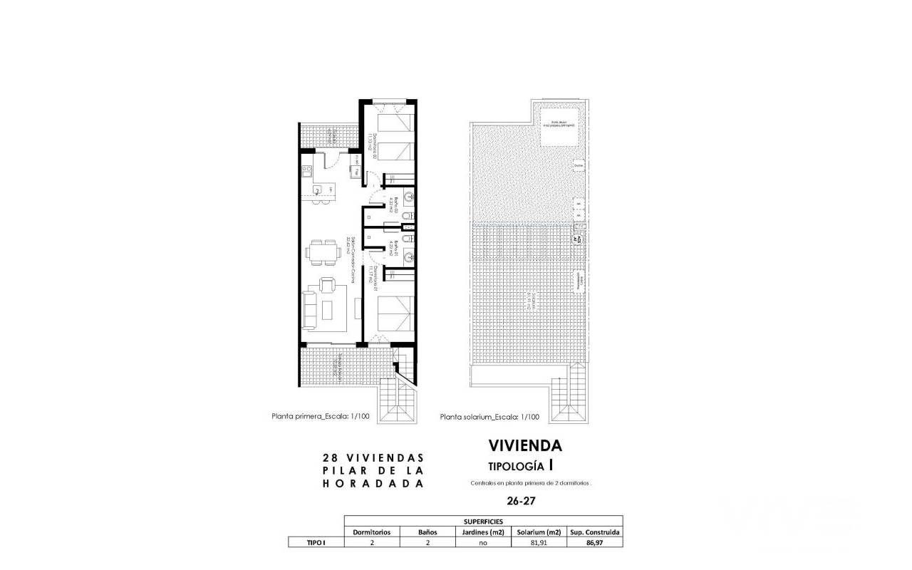 Bungalows de Obra Nueva con Solárium o Jardín en Pilar de la Horadada Moderno Residencial en la Costa Blanca Sur Ubicado en el encantador municipio de Pilar de la Horadada, este nuevo residencial de bungalows ofrece un estilo de vida cómodo y mediterráneo en una de las zonas más atractivas de la Costa Blanca. Pilar de la Horadada es conocido por su ambiente acogedor, su excelente clima y sus extensas playas de arena fina como Las Higuericas y Mil Palmeras, ideales para disfrutar en familia o practicar deportes acuáticos. Distribución y Tipologías de Viviendas El complejo está compuesto por 28 modernos bungalows disponibles en versiones de 2 y 3 dormitorios, distribuidos en: Plantas bajas con jardín privado Plantas altas con solárium privado y trastero asignado Muchas de las viviendas gozan de orientación sur, lo que garantiza una excelente luminosidad, y ofrecen vistas a la piscina comunitaria o al parque contiguo. Espacios Funcionales y Bien Equipados Cada vivienda ha sido diseñada con espacios amplios y funcionales: Cocina americana integrada con amplio salón comedor Armarios empotrados Terraza privada en cada unidad Plaza de aparcamiento incluida Además, las viviendas cuentan con: Agua caliente mediante sistema de aerotermia Preinstalación de aire acondicionado Carpintería exterior de PVC con cristales dobles y persianas de aluminio Muebles de baño incluidos Zonas Comunes y Entorno Natural El residencial incluye una piscina comunitaria rodeada de zonas verdes, perfecta para disfrutar del sol y la tranquilidad. A solo 4 km de la Playa de las Higuericas, se puede acceder fácilmente caminando o en bicicleta por la agradable rambla que conecta con el mar. Excelente Ubicación y Conectividad La ubicación del residencial permite acceder a todo tipo de servicios y puntos de interés: Supermercados, tiendas, bares y restaurantes a menos de 1 km Campos de golf como Lo Romero a 6 km Centro comercial Dos Mares a 11 km Playas de Mil Palmeras y Torre de la Horadada a solo 5 minutos Aeropuerto de Murcia (Corvera) a 40 km Aeropuerto de Alicante a 65 km Tu Nueva Vida al Sol Este residencial en Pilar de la Horadada representa una excelente oportunidad para disfrutar de la vida mediterránea en una vivienda moderna y bien ubicada. Contáctanos hoy para más información o para concertar una visita y dar el paso hacia tu nuevo hogar en la Costa Blanca.
