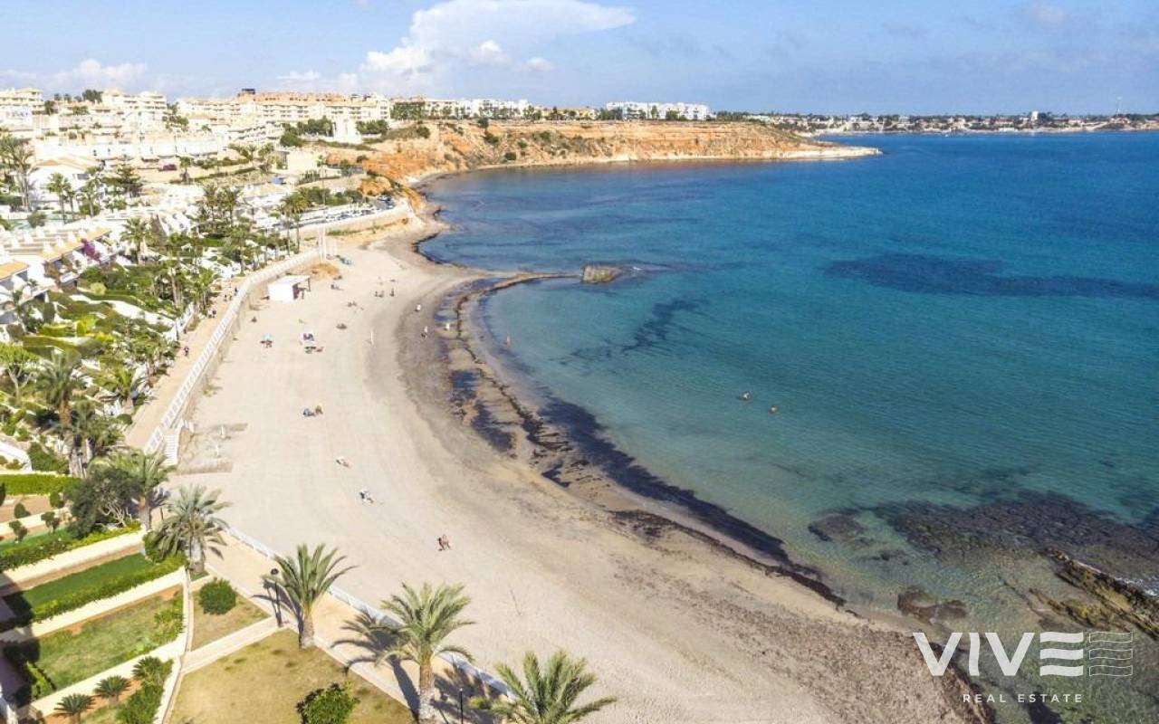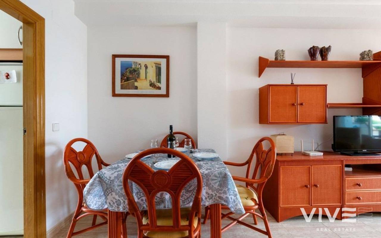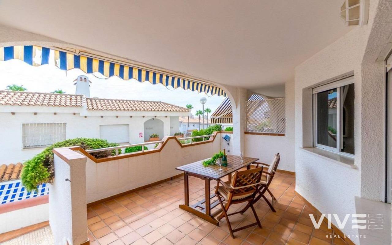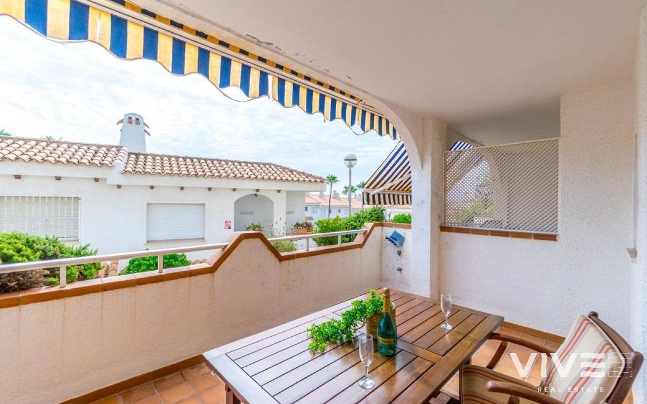 Encantador apartamento en planta baja a solo 200 metros de la playa~~Bienvenido a este bonito y acogedor apartamento situado en el exclusivo Residencial Aguamarina, un enclave típico mediterráneo con fachadas blancas, amplias zonas verdes y una magnífica piscina comunitaria.~~Ubicado en planta baja, esta vivienda cuenta con 2 dormitorios, 1 baño completo, una amplia terraza soleada ideal para disfrutar del clima durante todo el año, y un patio trasero que aporta espacio y comodidad adicional.~~La ubicación es inmejorable: a tan solo 200 metros de la playa de arena de Aguamarina y a un paso de todos los servicios esenciales —supermercado, farmacia, centro de salud, restaurantes y el precioso paseo marítimo.~~Una excelente opción tanto para vacaciones como para vivir todo el año en la costa mediterránea.