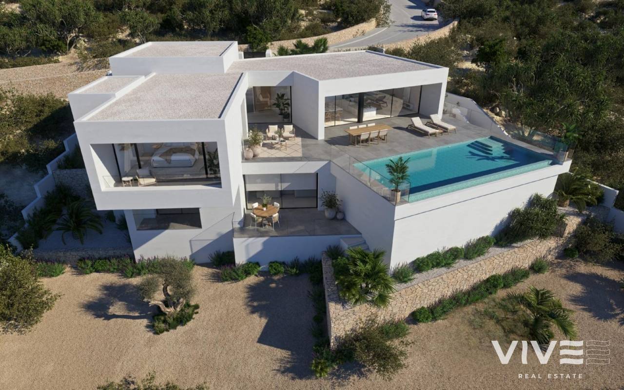 VILLA DE LUJO DE NUEVA CONSTRUCCIÓN EN CUMBRE DEL SOL Cumbre del Sol es un lugar donde se puede disfrutar tanto de la naturaleza como del sol y el mar. Este chalet de lujo ofrece tranquilidad y confort para que el propietario pueda relajarse tranquilamente con unas increíbles vistas al mar. ¿Podría ser este su futuro hogar? El diseño de la villa de nueva construcción combina de forma elegante y funcional una arquitectura verdaderamente moderna. En su fachada, caracterizada por grandes figuras geométricas creadas a base de líneas rectas y forma de cubos, domina el color blanco, que confiere a la villa un diseño elegante a la par que minimalista. Su jardín, de estilo 100% mediterráneo, cuenta con muros de piedra que ayudan a integrar la villa con su entorno. La zona de estar se encuentra en la misma planta. Una espaciosa cocina con isla central y equipada con electrodomésticos de primeras marcas, un gran salón y terraza con unas impresionantes vistas al mar Mediterráneo. El salón tiene un diseño muy cálido y acogedor. Consta de una gran estancia, que podría dividirse en dos habitaciones para mayor privacidad. En la misma planta se encuentra la suite principal con baño propio y terraza privada, donde podrá disfrutar del buen tiempo y de las vistas al mar desde la privacidad que le da estar en su propia habitación. En la planta inferior hay dos amplios dormitorios, cada uno con su propio baño y terraza, donde poder disfrutar del aire libre. También hay una pequeña sala de estar en esta planta, donde podrá leer, meditar o simplemente relajarse. La zona de terraza está coronada por una piscina infinita, donde podrá aprovechar al máximo el sol y las espectaculares vistas. Un lugar ideal para tomar un aperitivo, disfrutar de una barbacoa con amigos y familiares o simplemente echar una siesta al sol.