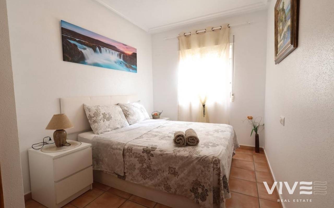 Chalet adosado en el exclusivo residencial Aldeas de Aguamarina, ubicado en Cabo Roig. La vivienda cuenta con una superficie de 72 m2 y se distribuye en 3 dormitorios, uno de ellos en planta baja, 2 baños completos, amplio salón-comedor, y una espaciosa cocina independiente con galería abierta.. . Dispone de dos terrazas, un jardín de 34 m2 con zona de barbacoa ideal para disfrutar al aire libre, y un gran solárium con vistas al mar. Se vende semi-amueblada y en buen estado de conservación.. . El residencial ofrece una preciosa piscina comunitaria y se encuentra a pocos pasos del mar y de todos los servicios. Ideal como residencia habitual o como inversión para alquiler vacacional.