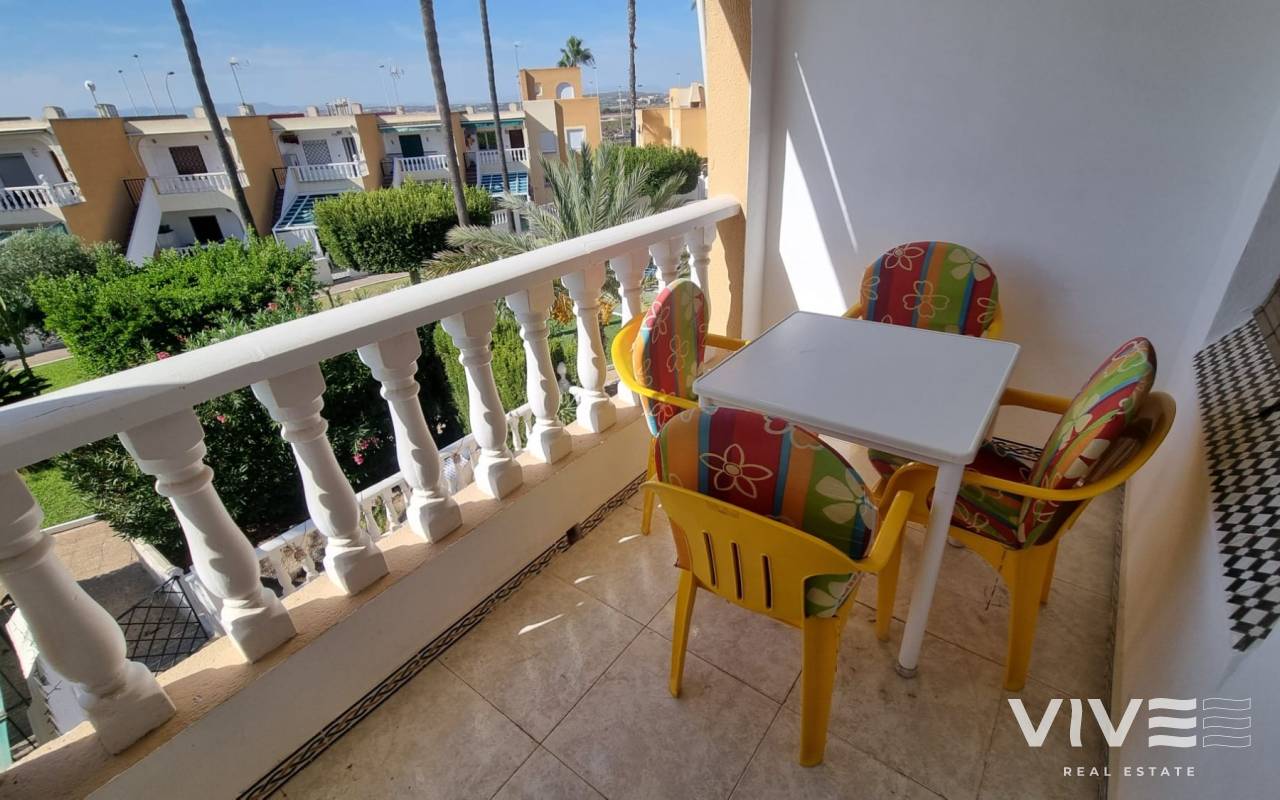 El bungalow dispone de una terraza de 7 m² con vistas a la piscina y a los jardines comunitarios, ideal para disfrutar del clima mediterráneo en cualquier época del año.