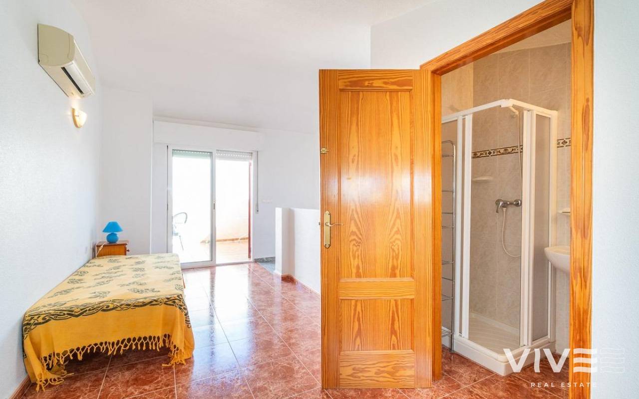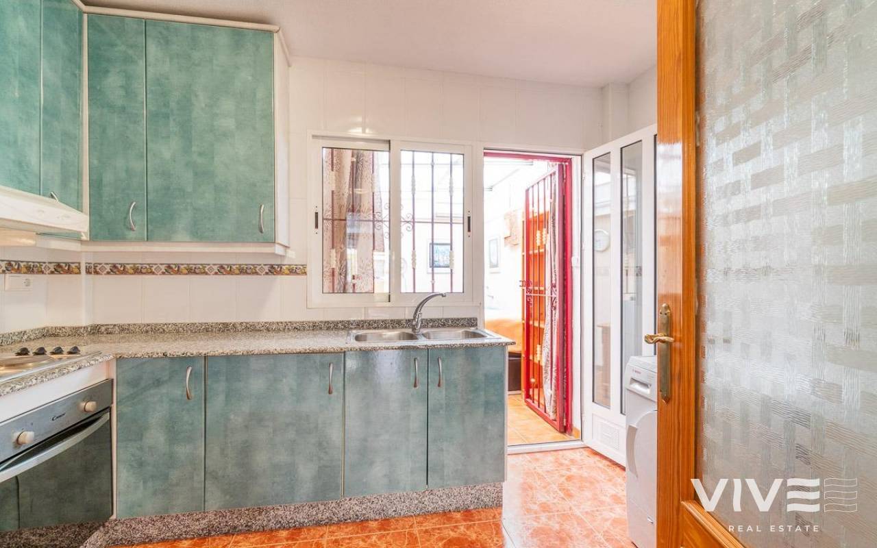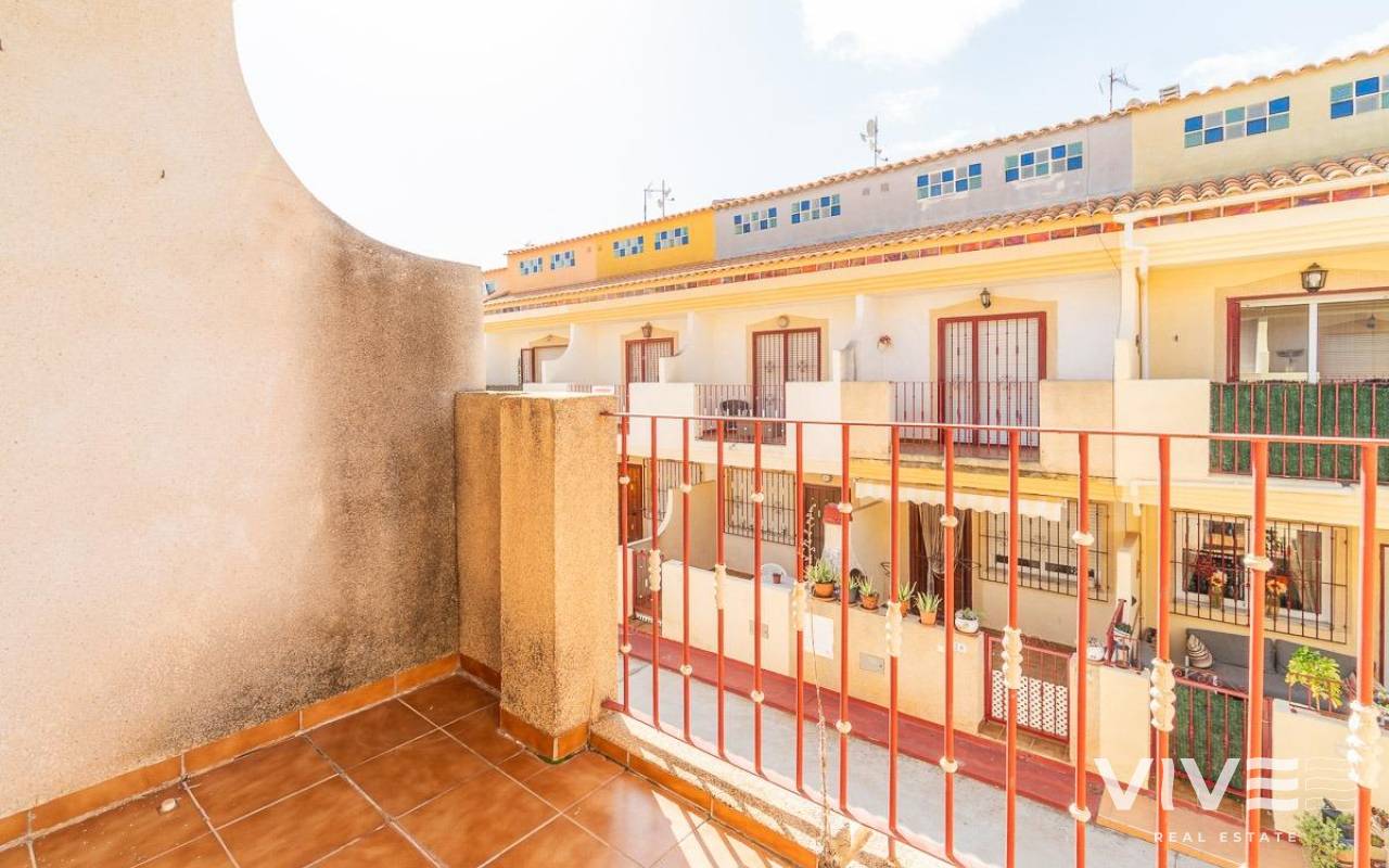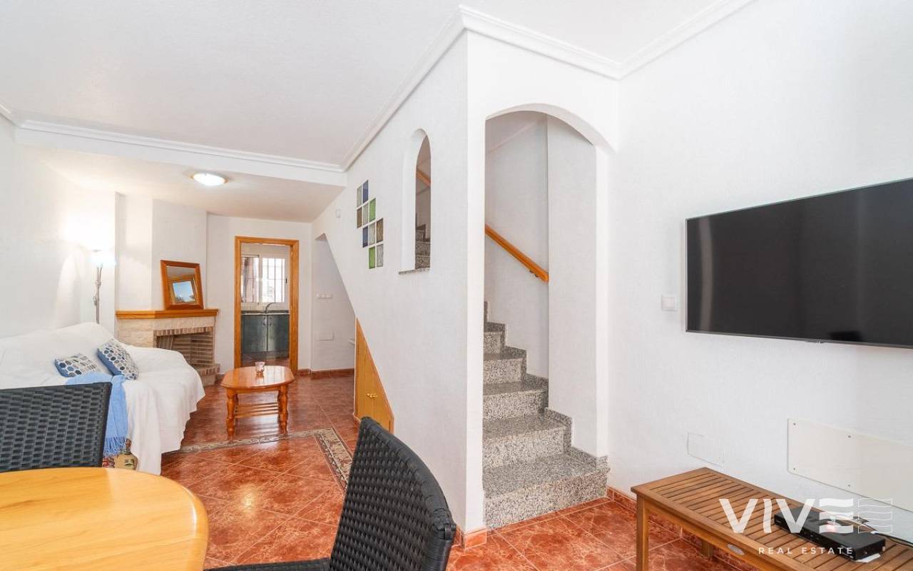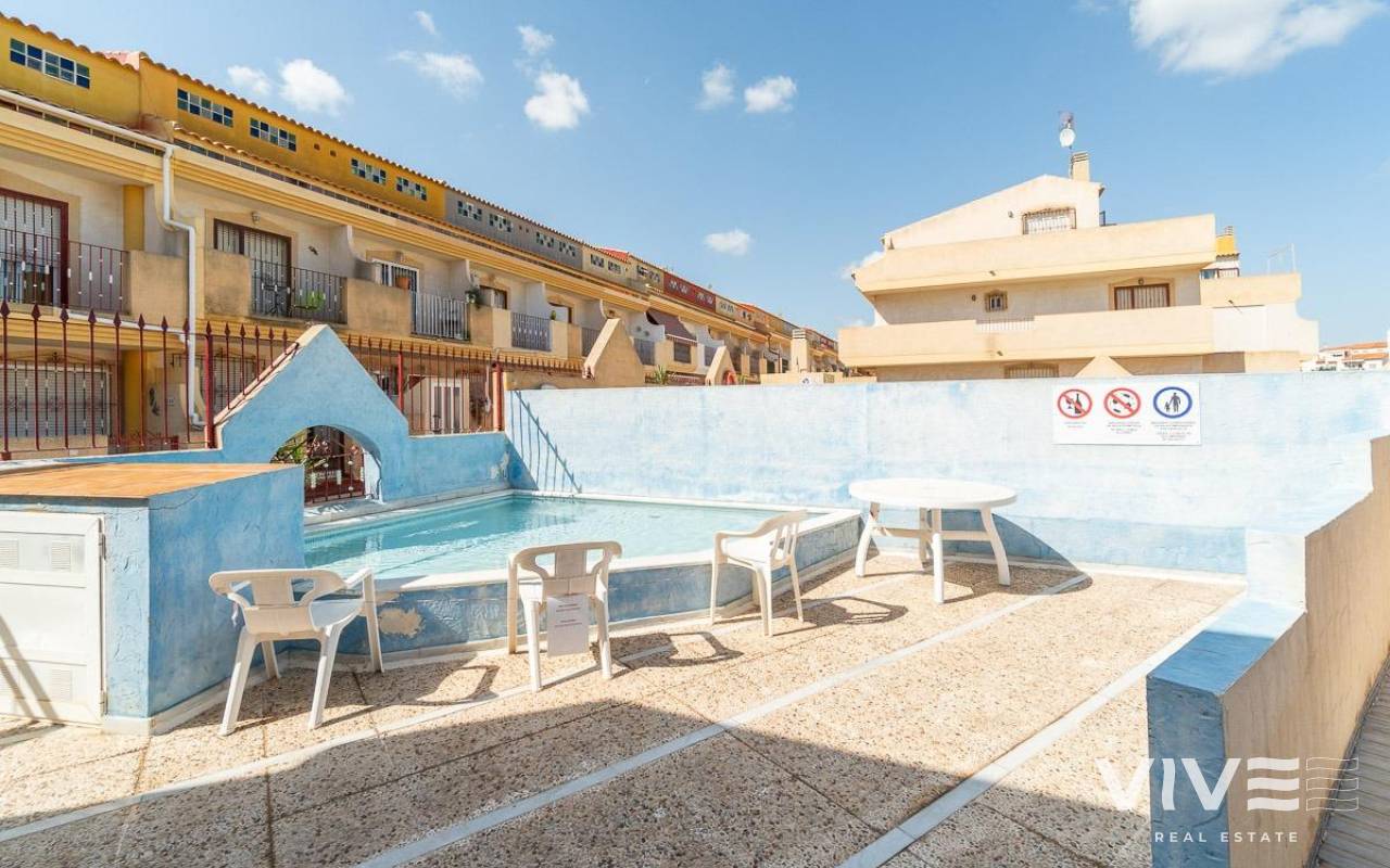 En pleno centro de Playa Flamenca, a un paseo del centro comercial Zenia Boulevard, de las playas, de zonas deportivas, de ocio y colegios, se encuentra este precioso y luminoso triplex adosado mirando al Sur.. La vivienda se encuentra dentro de un residencial vallado y con puertas automáticas, con amplias zonas de parking para el coche en las calles de acceso y con zona de piscina comunitaria en su centro, aislada y sin ruido ni tráfico alguno.. Tiene orientación Sur, por tanto con sol prácticamente todo el día y cuenta también con un solarium en su parte trasera para poder descansar a la sombra en pleno verano cuando hace demasiada calor en la parte frontal de la vivienda.. Cuenta con una terraza en su parte delantera a la entrada de la propiedad, para poder tomar el sol todo el año. Se accede a la vivienda que cuenta con un salón-comedor con chimenea, una cocina independiente para poder cocinar con la puerta cerrada y no tener olores ni grasa en el resto de la vivienda, una salida directa desde ésta a un patio cubierto con techo de aluminio y cristal, que puede ser utilizado como salón segundo, como lavadero e incluso como dormitorio de personas que no puedan subir a las plantas superiores ya que cuenta con un cuarto de aseo con ducha.. En planta primera a la que se accede a través de una escalera interior, cuenta con dos dormitorios con armarios empotrados y uno de ellos con balcón, y un cuarto de baño completo con ducha de obra, teniendo en la tercera y última planta superior una tercera habitación abuhardillada con cuarto de baño con ducha perfecta para que niños o adolescentes hagan su vida porque cuenta con un solarium-terraza con salida únicamente desde ésta.. La vivienda está amueblada, tiene todos los electrodomésticos en la cocina y en perfectas condiciones con todo lo necesario para entrar a vivir inmediatamente en ella.. Sea como vivienda vacacional o para vivir todo el año, merece la pena una visita para comprobar sus múltiples ventajas y utilidades. Especialistas en Orihuela Costa