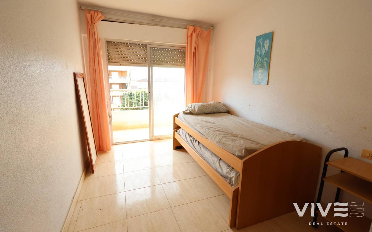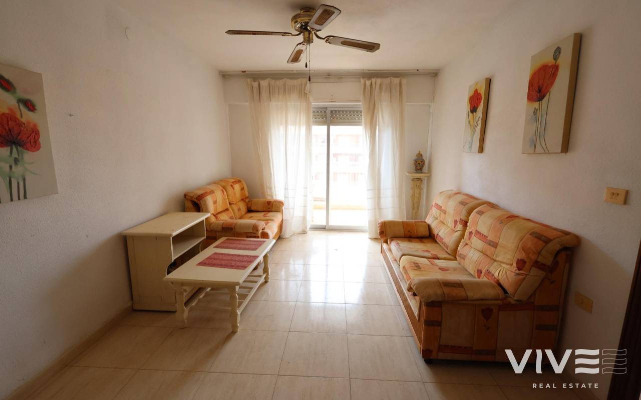Punta Prima Apartamento en cuarta planta con ascensor, orientado al sur y ubicado frente a la piscina comunitaria, a tan solo 300 metros de la playa.. . Con una superficie de aproximadamente 70 m2, esta vivienda es ideal tanto para inversores como para quienes desean reformar y personalizar su hogar a su gusto. Dispone de 2 dormitorios con acceso directo a la terraza, un baño completo, un aseo, cocina americana y un luminoso salón-comedor también con salida a la terraza.. . Además, incluye plaza de garaje en el mismo edificio. Una excelente oportunidad en una de las zonas más demandadas de la costa.