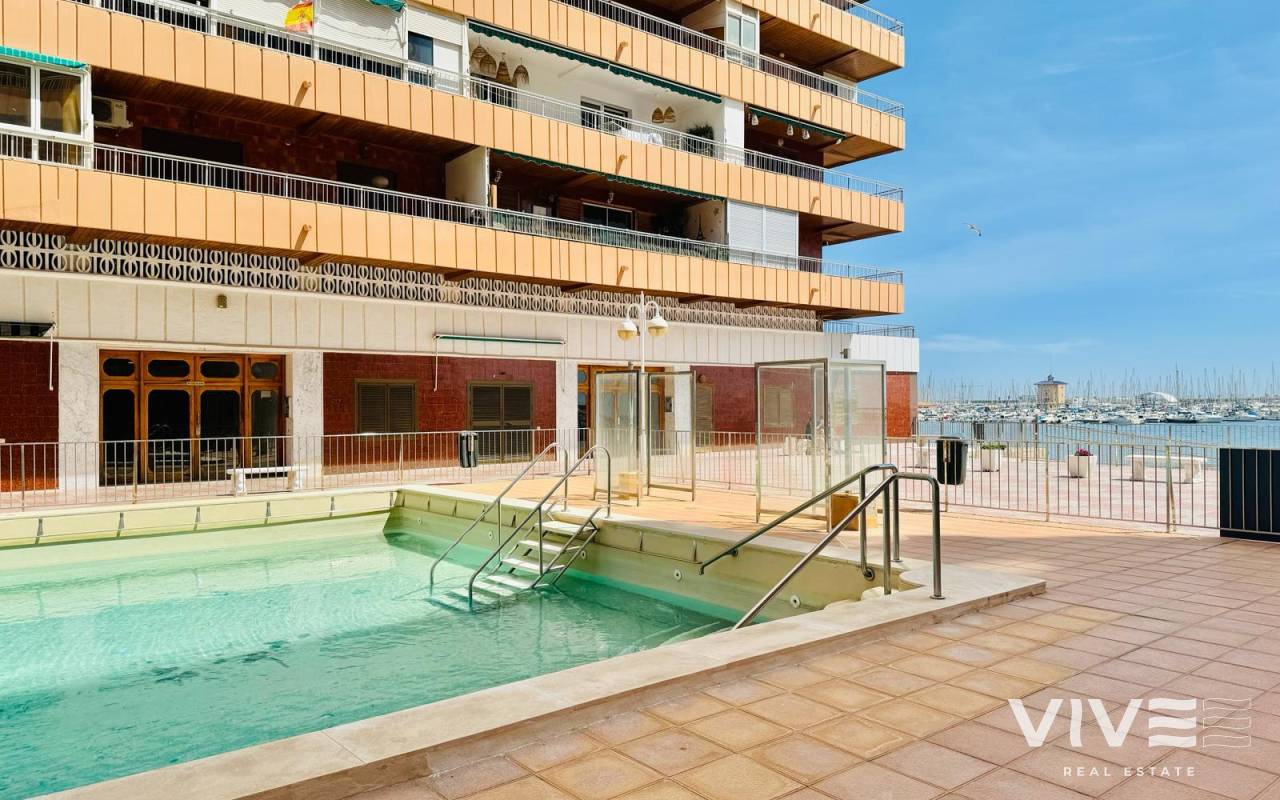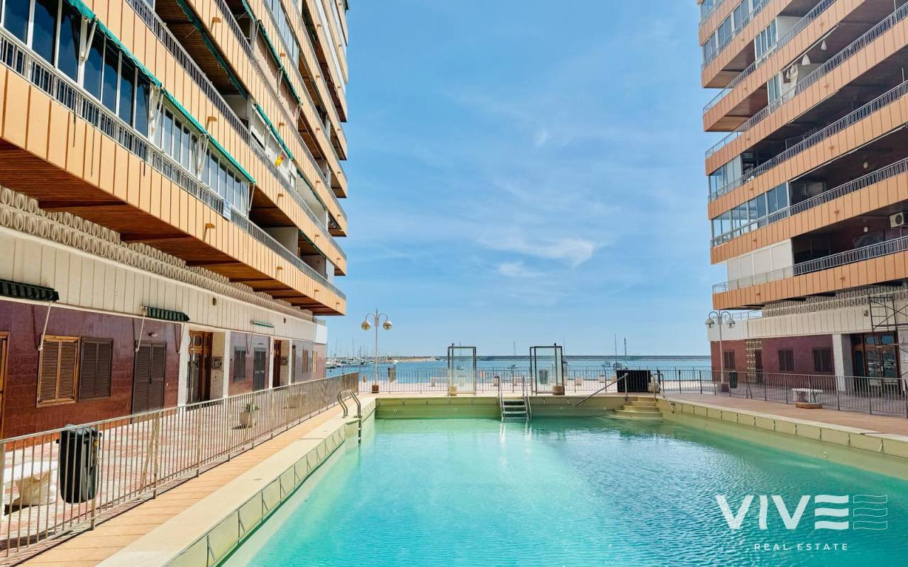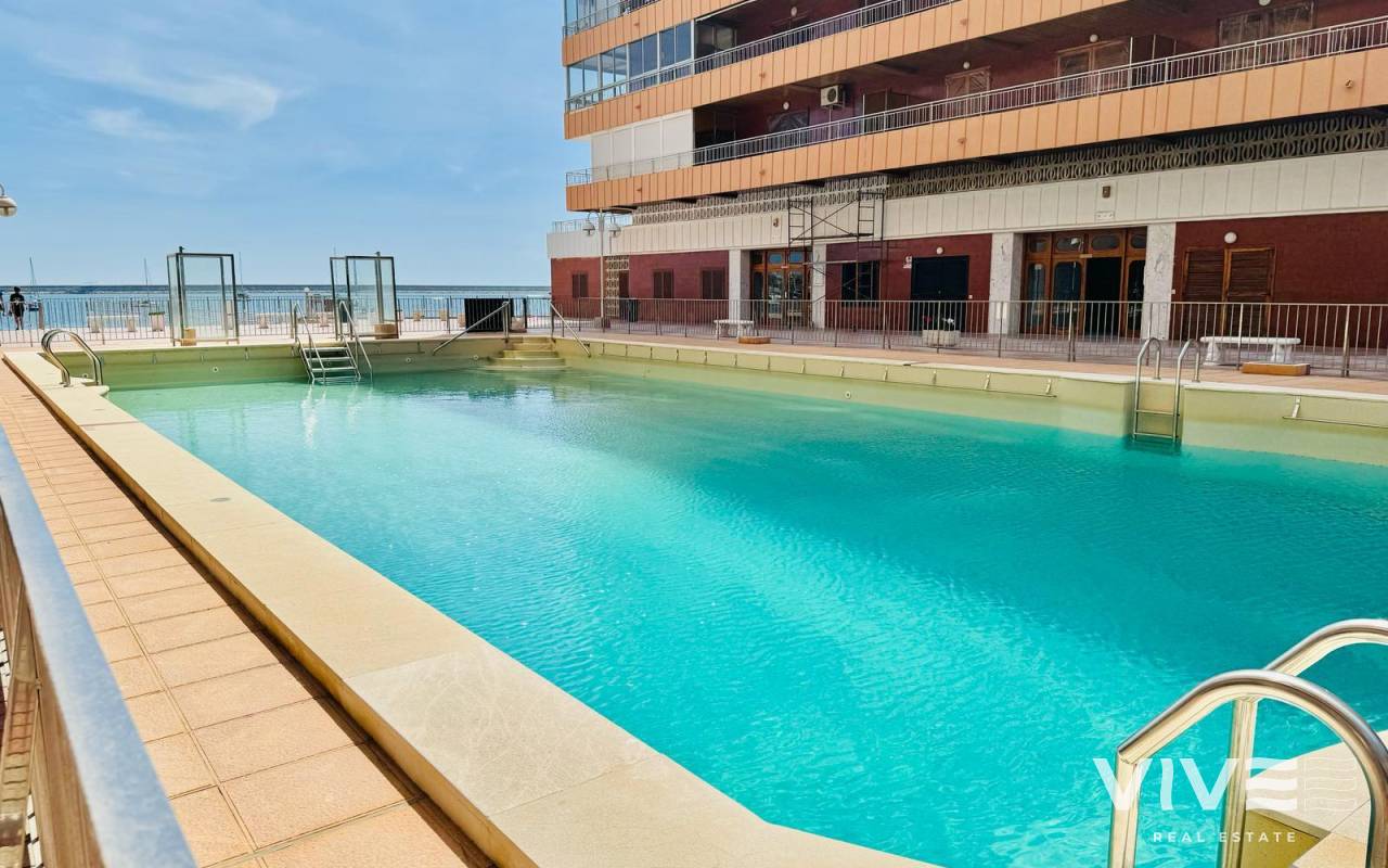 Vive el Mediterráneo en primera línea amplitud, luz y terraza frente al mar en El AcequiónEste apartamento de 94 m² en primera línea de la playa del Acequión, en Torrevieja, es una invitación directa a disfrutar del mar como parte de tu día a día. Construido en 1980 y en buen estado, ofrece una distribución cómoda y funcional, ideal tanto como residencia habitual como para escapadas junto al mar.Su orientación sur garantiza una magnífica entrada de luz natural durante todo el día, aportando calidez y bienestar a cada estancia. Dispone de 3 habitaciones y 2 baños, una cocina independiente y un salón amplio que conecta con una terraza de 15 m², perfecta para desayunos al sol o tardes de descanso con vistas al mar. La vivienda se entrega amueblada y con electrodomésticos, lista para entrar a vivir. Además, forma parte de una comunidad con piscina comunitaria, un valor añadido para disfrutar en familia o con amigos. Características principales94 m² construidos3 habitaciones 2 bañosOrientación surTerraza de 20 m²Piscina comunitariaVistas al mar y primera línea de playaSu ubicación es estratégica rodeada de bares, restaurantes, farmacias, supermercados y centros comerciales, y a aproximadamente 45 km del Aeropuerto de Alicante, lo que facilita conexiones nacionales e internacionales. IBI..............................330.-€COMUNIDAD............136.-€ TRIMESTRALES.Una propiedad que combina ubicación, luz y calidad de vida. Contáctanos hoy y agenda tu visita.