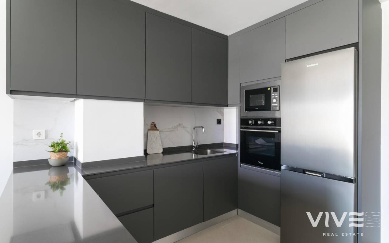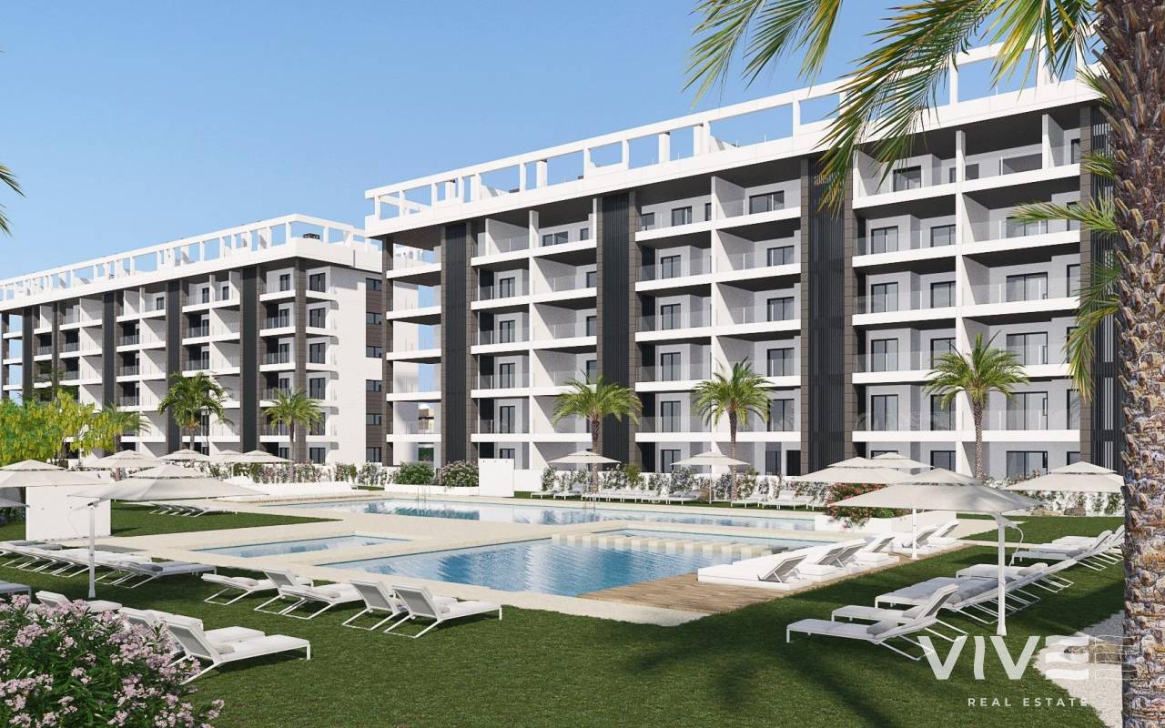 URBANIZACION CERRADA DE OBRA NUEVA EN TORREVIEJA A SOLO 700M DE LA PLAYA Complejo residencial de nueva construcción de 362 apartamentos con amplias zonas comunitarias en Torrevieja. Puede elegir entre lujosos apartamentos de 2 dormitorios y 2 baños, áticos de 3 dormitorios y 2 baños con solarium privado y apartamentos de 2 dormitorios y 2 baños en planta baja con jardín privado. -Diseños modernos y acabados y materiales de calidad -Casi todos los apartamentos tienen vistas al mar -Todos los apartamentos cuentan con amplias terrazas frontales orientadas a las zonas comunitarias -Zonas comunitarias con dos piscinas para adultos, piscina para niños, zona infantil, gimnasio, zona deportiva y spa, aparcamiento de bicicletas y zona de aparcamiento de vehículos -700 metros hasta la playa de La Mata, 10 minutos andando -Enfrente del Centro Comercial Torremarina con Mercadona, restaurantes, cafeterías y otras tiendas Torrevieja es una ciudad española de la provincia de Alicante, en la Costa Blanca. Es conocida por su clima y su costa típicamente mediterráneos. Cuenta con paseos marítimos con complejos turísticos a lo largo de sus playas de arena. El pequeño Museo del Mar y la Sal alberga exposiciones sobre la historia pesquera y salinera de la ciudad. En el interior, el Parque Natural de las Lagunas de La Mata-Torrevieja cuenta con senderos y dos lagunas saladas, una rosa y otra verde. El aeropuerto de Alicante se encuentra a 40 minutos y el de Murcia a una hora.