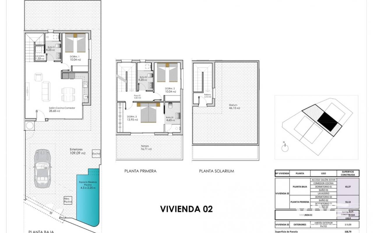 4 VILLAS PAREADAS DE OBRA NUEVA EN PILAR DE LA HORADADA Obra nueva de 4 villas pareadas situadas en Pilar de la Horadada. Villas construidas en 2 plantas y con solarium privado, dispone de 3 dormitorios, 3 baños, cocina americana con el salón, jardín con piscina privada y plaza de garaje. Villas situadas a pocos metros de todos los servicios y del centro. Pilar de la Horadada es un típico pueblo español en la parte más meridional de la Costa Blanca. La gran calle principal tiene supermercados, muchas tiendas, restaurantes y bares y algunas plazas encantadoras. Las hermosas playas de Torre de la Horadada y Mil Palmeras con paseo marítimo de arena fina está a sólo 5 minutos. En Pilar de la Horadada también hay una red bien desarrollada de carriles bici y senderos para caminar, y también hay una gran oferta de diversas actividades deportivas. El campo de golf Lo Romero, de 18 hoyos, se encuentra a un corto trayecto en coche. Los aeropuertos de Corvera (Murcia) y Alicante se encuentran a 40 y 55 minutos respectivamente.