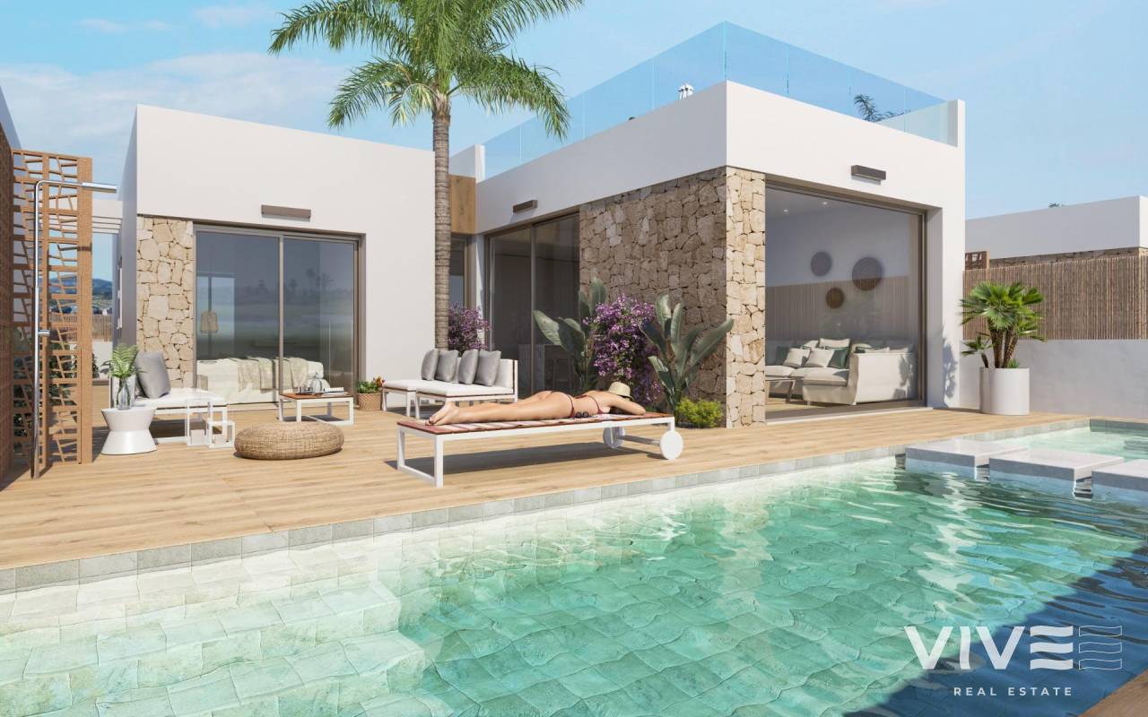 Villas de nueva construcción en primera línea de golf en Los Alcázares, Costa Cálida Vida exclusiva cerca de la playa y el golf Esta nueva promoción residencial en Los Alcázares ofrece una oportunidad única para disfrutar de un estilo de vida moderno en una de las zonas más deseadas de la Costa Cálida. Situada a solo 1,2 km de la playa y directamente en primera línea del prestigioso campo de golf La Serena, la promoción combina la vida costera con la tranquilidad de un complejo de golf. El encantador centro de Los Alcázares se encuentra a poca distancia, lo que permite acceder fácilmente a tiendas, restaurantes, cafeterías y servicios esenciales. Ubicación privilegiada con excelentes conexiones Los Alcázares es un lugar ideal para aquellos que buscan invertir en una nueva propiedad junto al Mediterráneo. La zona se encuentra a solo 25 minutos del aeropuerto de Murcia y a unos 55 minutos del aeropuerto de Alicante. Gracias a las excelentes conexiones por autopista, los residentes pueden llegar rápidamente a ciudades cercanas como Cartagena (20 km), Murcia (40 km) y Alicante (80 km), así como a otras hermosas playas a lo largo de la Costa Cálida y la Costa Blanca. Apartamentos y villas diseñados para el confort La promoción incluye 13 apartamentos contemporáneos de 2, 3 o 4 dormitorios y 4 exclusivas villas de una sola planta con 3 dormitorios en primera línea de golf. Cada propiedad combina un diseño moderno con acabados de alta calidad y distribuciones funcionales. Las villas ofrecen parcelas privadas con jardines y piscinas, y la opción de un solárium privado para un toque extra de lujo. Todas las viviendas disfrutan de impresionantes vistas al campo de golf y al Mar Menor. Características de alta calidad Todas las viviendas han sido diseñadas pensando en el estilo y la comodidad. Las características principales incluyen: Baños totalmente equipados con muebles y mamparas de ducha Preinstalación de aire acondicionado por conductos Persianas motorizadas en los dormitorios Piscina privada Aparcamiento en la parcela Golf y estilo de vida costero Situada en el campo de golf La Serena, famoso por su exuberante paisaje y sus obstáculos de agua en 16 de sus 18 hoyos, esta urbanización es un paraíso para los amantes del golf. Al mismo tiempo, los residentes pueden disfrutar de acceso peatonal directo al centro de Los Alcázares y a las cálidas aguas del Mar Menor, la laguna salada más grande de Europa. Con sus olas tranquilas, arena fina y condiciones ideales para navegar, nadar y practicar deportes acuáticos, la zona es perfecta tanto para relajarse como para vivir aventuras. Su hogar mediterráneo le espera Tanto si es un entusiasta del golf, un amante de los deportes acuáticos o simplemente busca un refugio tranquilo en la costa, estas villas de nueva construcción en Los Alcázares ofrecen el equilibrio perfecto entre lujo, naturaleza y estilo de vida. Póngase en contacto con nosotros hoy mismo para concertar una visita y asegurarse su nueva casa en la Costa Cálida.