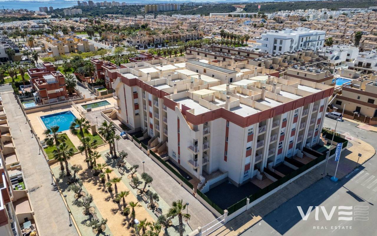 Complejo Residencial Regenerado en Lomas de Cabo Roig - Apartamentos Reformados Apartamentos en una ubicación privilegiada Descubra esta oportunidad exclusiva de poseer un apartamento renovado en Lomas de Cabo Roig, una zona muy solicitada de Orihuela Costa. Este complejo residencial, construido originalmente en 2008, está siendo renovado en algunas unidades y se entregará en junio de 2025. Una casa piloto está disponible para su visualización, lo que le permite ver la calidad de los acabados de primera mano. Opciones inmobiliarias para todas las necesidades Esta promoción ofrece 27 apartamentos reformados, con una gran variedad de distribuciones: Viviendas de 1 y 2 dormitorios, ideales para vacaciones o inversión. Apartamentos en planta baja con jardín privado, perfectos para vivir al aire libre. Apartamentos de planta media con amplias terrazas, ideales para disfrutar del clima mediterráneo. Áticos con solárium privado, que ofrecen vistas abiertas y la máxima privacidad. Cada vivienda se entrega con mamparas de ducha en los baños y cocinas totalmente equipadas con electrodomésticos, garantizando una solución llave en mano para los compradores. Servicios comunitarios exclusivos El complejo residencial está diseñado para la comodidad y la relajación, con: Una piscina comunitaria rodeada de hermosos jardines paisajísticos. Ascensor para facilitar el acceso a todas las plantas. Plazas de aparcamiento subterráneo opcionales disponibles por un coste adicional. Una ubicación inmejorable en Orihuela Costa Lomas de Cabo Roig es una prestigiosa zona residencial situada a sólo 2 km de la costa de Cabo Roig, hogar de algunas de las playas más hermosas de Orihuela Costa. La zona está bien comunicada por carretera y ofrece una amplia gama de servicios, incluyendo tiendas, restaurantes, supermercados y centros comerciales. Distancias a puntos clave de interés: Playas de Cabo Roig y Campoamor - 5 minutos en coche. Centro Comercial Zenia Boulevard - 5 km. Campo de Golf Villamartín - 4 km. Aeropuerto de Alicante - 30 minutos en coche. Aeropuerto Murcia-Corvera - 1 hora en coche. Una inversión inteligente en la Costa Blanca Con su excelente ubicación, apartamentos totalmente renovados y servicios de primer nivel, esta promoción es una oportunidad ideal para invertir, vivir de vacaciones o como residencia permanente. No deje pasar esta oportunidad única de poseer una vivienda en una de las zonas más deseadas de la Costa Blanca a un precio inmejorable. Póngase en contacto con nosotros para más información o para concertar una visita.