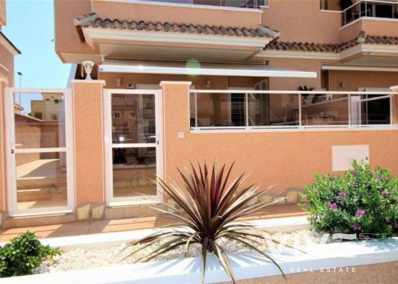 Bungalow en planta baja con un pequeño jardin, terraza acristalada con salida a la piscina, dos dormitorios con armarios empotrados, dos baños completos, unpo de ellos en suite, cocina americana totalmente equipada, salon comedor con salida a la terraza. Residencial con piscina, jacuzzi, zonas ajardinadas, parque infantil y parking. Esta situado en la zona de Los Altos ( Torrevieja), al lado de todo tipo de servicios, hospital, colegios, etc y cerca de la playa de Punta Prima.