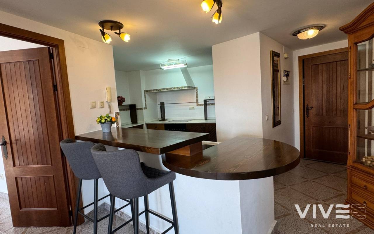 La vivienda se distribuye en 1 dormitorio, 1 baño completo, cocina americana, y un luminoso salón con chimenea que da acceso a una terraza con vistas despejadas ( también se puede acceder a la terraza desde el dormitorio). Desde la terraza, una escalera conduce al solárium privado, un espacio perfecto para relajarse o disfrutar de las vistas al mar, al jardín comunitario con palmeras y a la piscina.