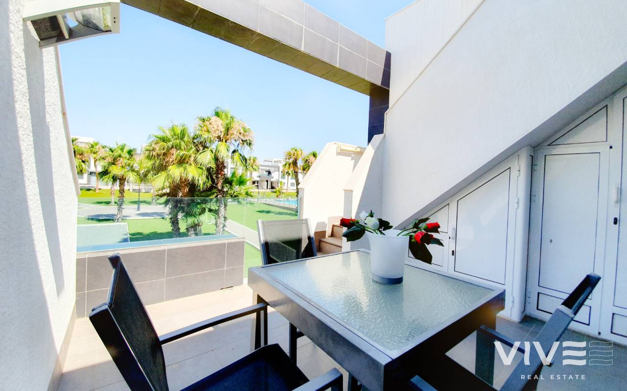 Top floor bungalow with private solarium in a residential area with swimming pool, green areas and playground.