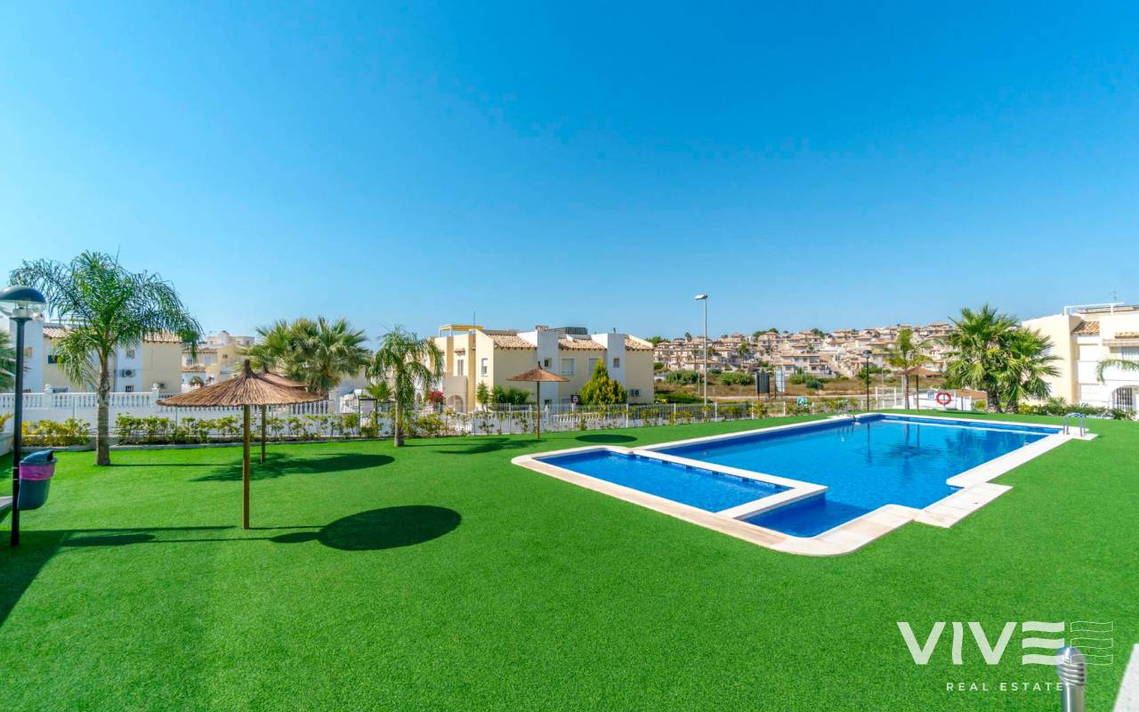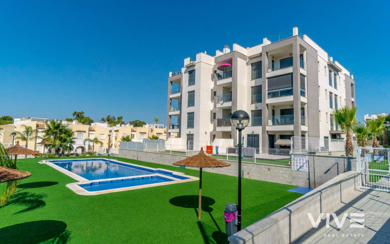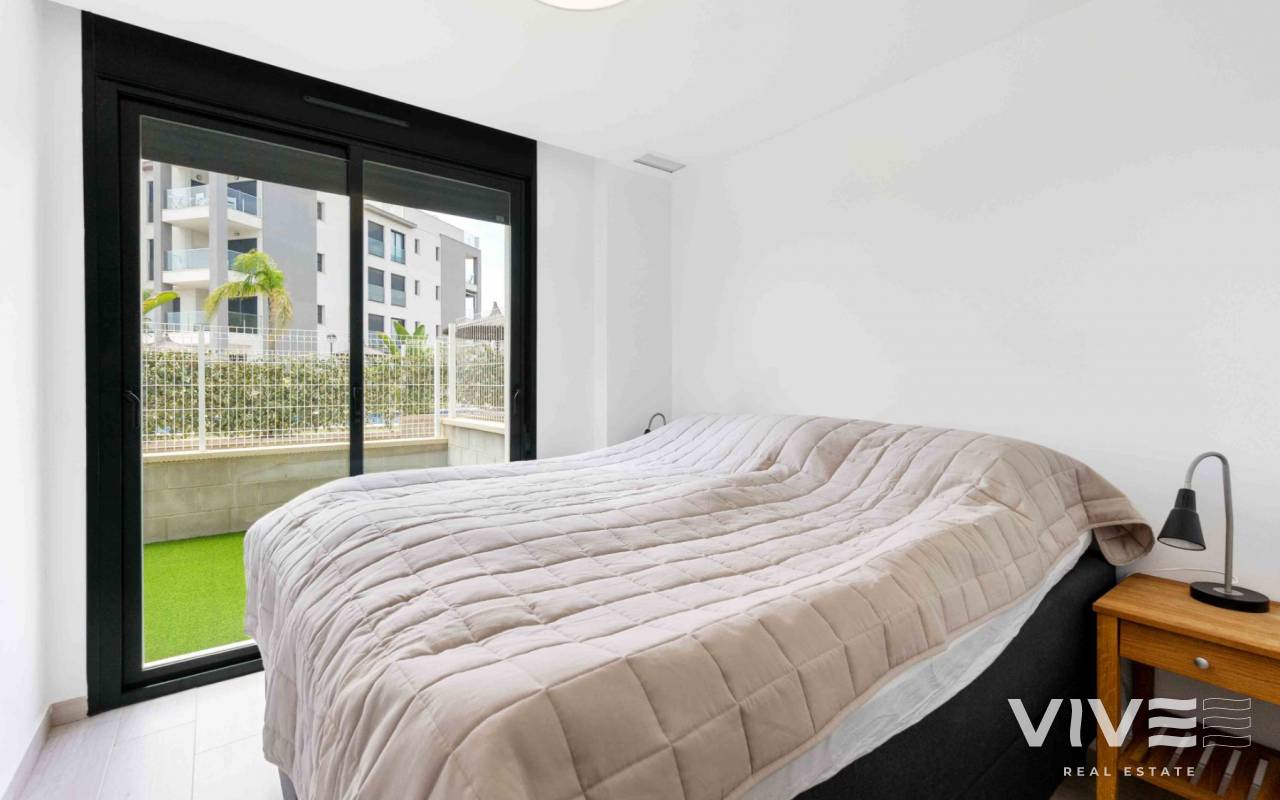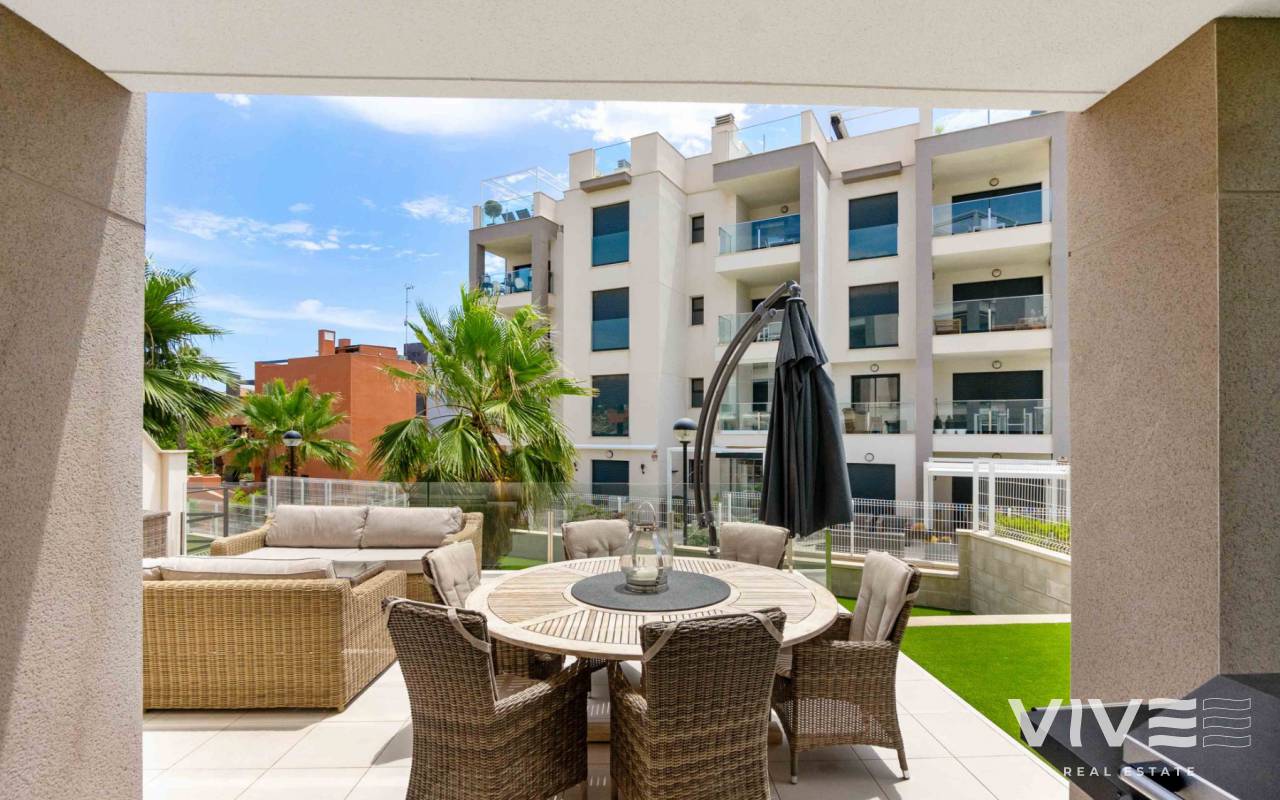 Fantastic 2 bedroom corner ground floor apartment located in the newly constructed residential complex of Valentino Golf I in Villamartin, just a short walk to the famous Villamartin Plaza & golf course. The property is in excellent condition. The apartment boasts a large corner garden of 83 m2 with artificial grass and a terrace of 53 m2. The apartment has fantastic location just in front of the swimming pool area. You have a door from the garden to the pool area. This apartment is perfect for a family with children’s. The living accommodation of this beautiful apartment comprises of a spacious lounge-dining area with modern open kitchen, 2 bedrooms with fitted wardrobes, and a family bathroom. The master bedroom benefits from its own en-suite bathroom with walk-in shower. Both bedrooms have direct access out to he fantastic garden. The apartment was built only 3 years ago, and has been well cared for by the current (and only) owners. There is also energy efficient LED lighting throughout the apartment. Underfloor heating in both bathrooms. The apartment is sold partially furnished with air-conditioning throughout. The apartment is also sold with a private underground parking space included in the price. Valentino Golf offers wonderful facilities including the use of 3 communal pools, paddle court and a children's play area, all situated in a secure gated community. Located less than a 10 minutes walk to the famous Villamartin Plaza and golf course, which hosts a variety of bars, restaurants, shops, and a supermarket. There is also a local bus stop nearby with routes towards the beaches and the famous Zenia Boulevard shopping mall, which are less than an 8 minutes drive away.