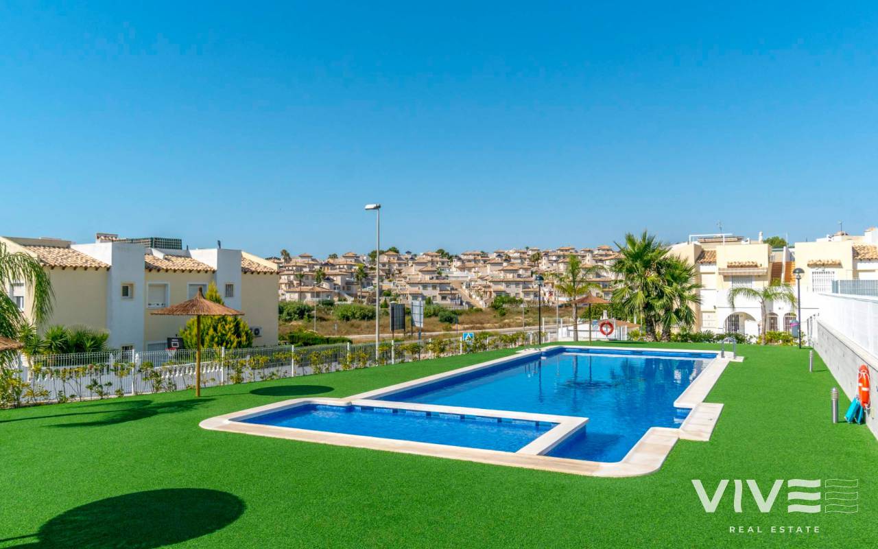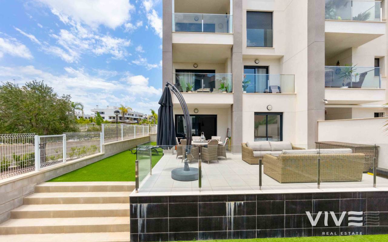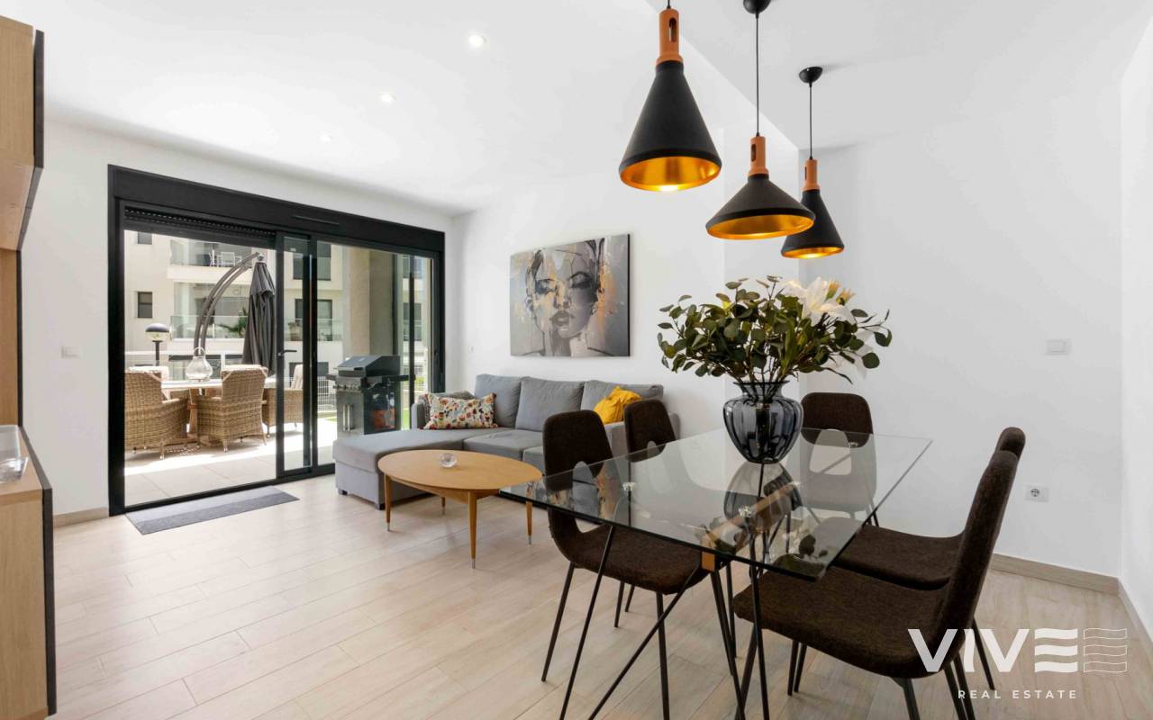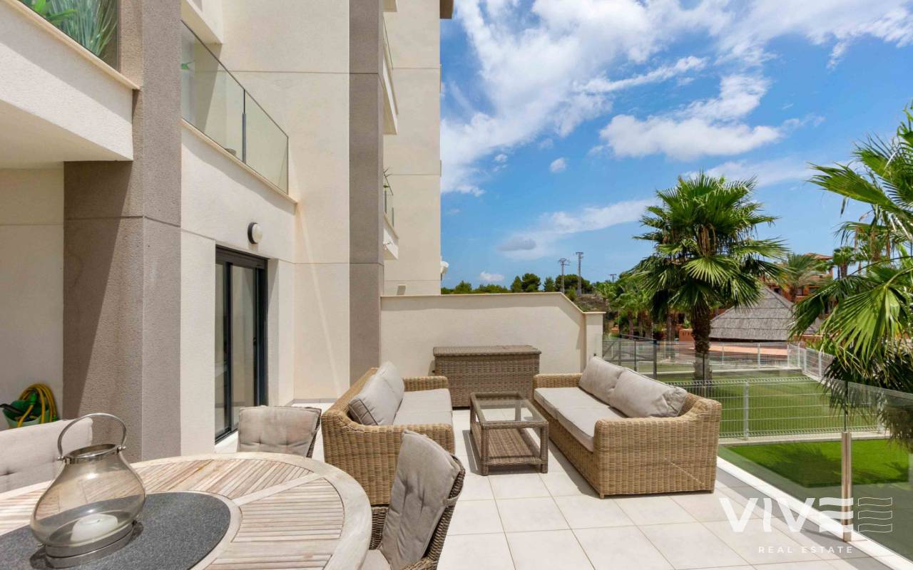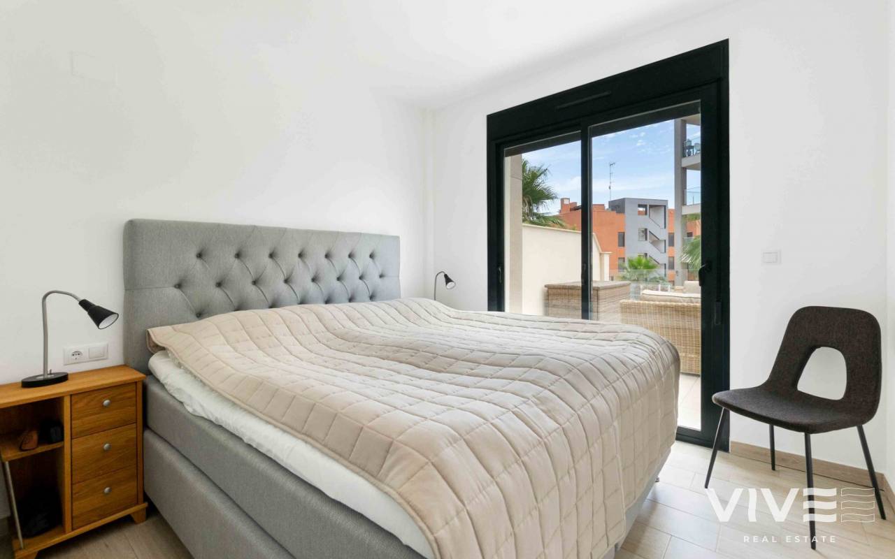 Fantastic 2 bedroom corner ground floor apartment located in the newly constructed residential complex of Valentino Golf I in Villamartin, just a short walk to the famous Villamartin Plaza & golf course. The property is in excellent condition. The apartment boasts a large corner garden of 83 m2 with artificial grass and a terrace of 53 m2. The apartment has fantastic location just in front of the swimming pool area. You have a door from the garden to the pool area. This apartment is perfect for a family with children’s. The living accommodation of this beautiful apartment comprises of a spacious lounge-dining area with modern open kitchen, 2 bedrooms with fitted wardrobes, and a family bathroom. The master bedroom benefits from its own en-suite bathroom with walk-in shower. Both bedrooms have direct access out to he fantastic garden. The apartment was built only 3 years ago, and has been well cared for by the current (and only) owners. There is also energy efficient LED lighting throughout the apartment. Underfloor heating in both bathrooms. The apartment is sold partially furnished with air-conditioning throughout. The apartment is also sold with a private underground parking space included in the price. Valentino Golf offers wonderful facilities including the use of 3 communal pools, paddle court and a children's play area, all situated in a secure gated community. Located less than a 10 minutes walk to the famous Villamartin Plaza and golf course, which hosts a variety of bars, restaurants, shops, and a supermarket. There is also a local bus stop nearby with routes towards the beaches and the famous Zenia Boulevard shopping mall, which are less than an 8 minutes drive away.