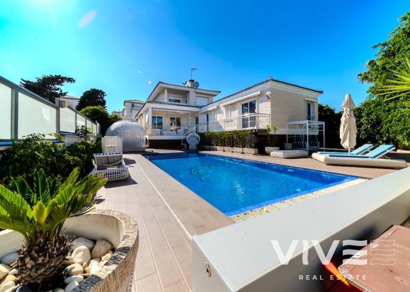 FANTASTIC MEDITERRANEAN VILLA 60 m TO THE BEACH AND WITH SEA VIEWS!!!! A unique opportunity - to buy a modern house 1 minute from the beach with direct sea views, in the best part of the town of Torrevieja - La Mata, area with very well developed infrastructure. It is a small fishing village with all the necessary services for day to day life, with 9 km of fine sandy beaches and with a climate that offers you 300 days of sunshine a year with an average temperature of 20ºC. Detached villa in an area of wide avenues and unbeatable location, with a plot of 320 m² and private swimming pool. Total constructed area of 310 m². Consists of 4 double bedrooms (2 en suite), 4 bathrooms, 2 living rooms and kitchen, plus private parking, terraces and solarium with sea views. La Mata is connected by bus with Torrevieja and Alicante. There are 2 hospitals nearby. Golf courses 6 km. Alicante airport 42 km.