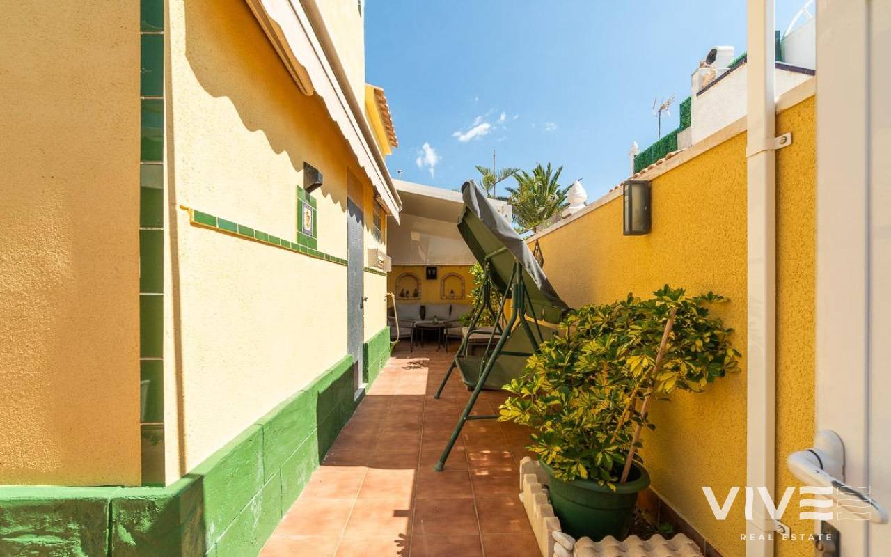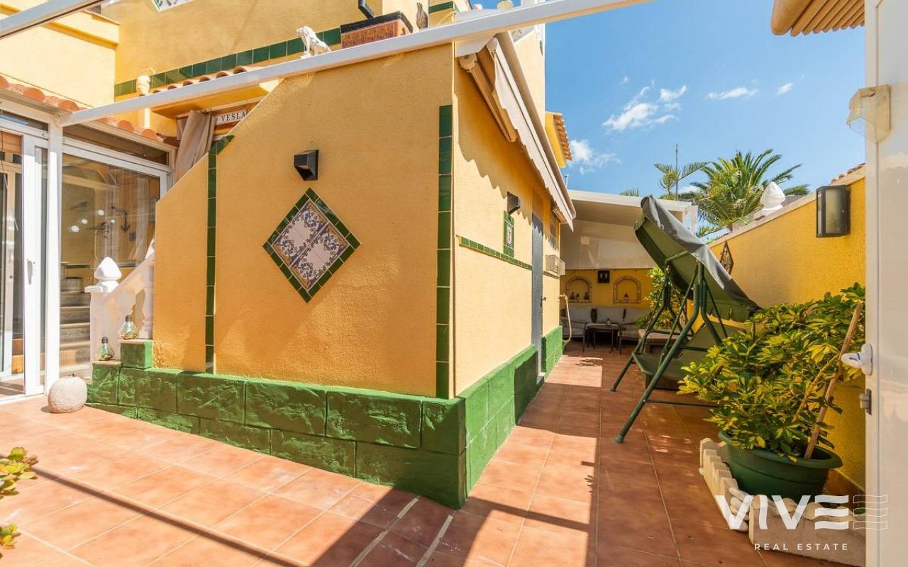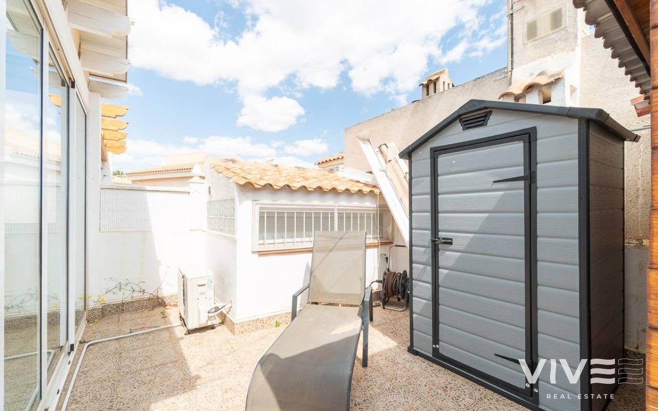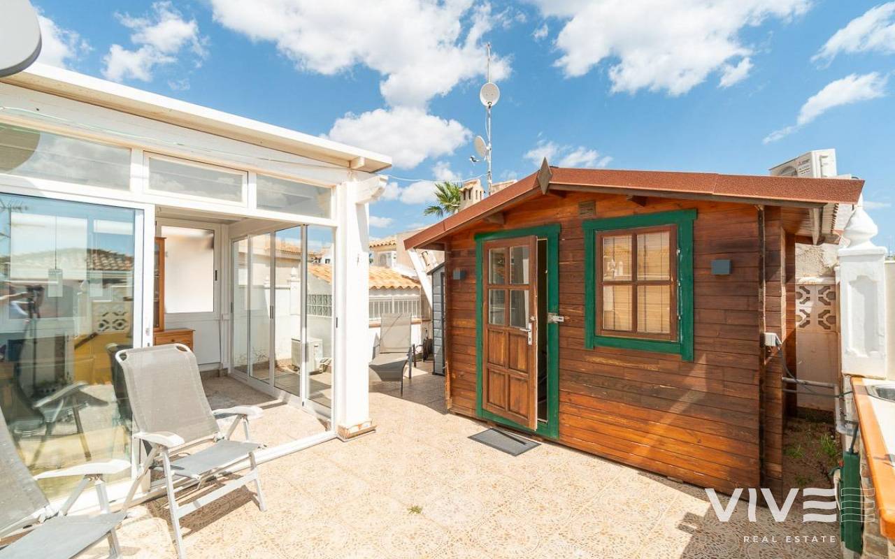 This charming townhouse in Playa Flamenca is a haven of peace and comfort, where every day feels like a holiday by the sea. Located in a well-maintained and peaceful community, it is less than 500 meters from the beaches of Playa Flamenca and the coves of La Mosca, where the sound of the waves creates a perfect setting.. . Just a short walk away, La Mosca Shopping Center and La Zenia Boulevard offer everything you need: shops, restaurants with diverse flavors, supermarkets, and essential services. And as the evening falls, the nearby bars and terraces invite you to enjoy the best Mediterranean atmosphere.. . Inside the house, natural light fills every space, creating a cozy and serene ambiance. Its private garden is a small paradise, featuring a charming wooden house that adds warmth and character. The solarium includes a glass-enclosed room, a versatile space ideal as a chill-out area or a third bedroom, perfect for unwinding and feeling the sea breeze.. . Nights here are special, filled with laughter and conversation around the barbecue on the terrace, sharing unforgettable moments with family and friends. And when the heat rises, the community pool with large green areas becomes the perfect place to cool off and relax.. . A home designed for those seeking quality of life, tranquility, and the beauty of the Mediterranean just around the corner. A place where every sunrise brings new experiences and memories to cherish.. .