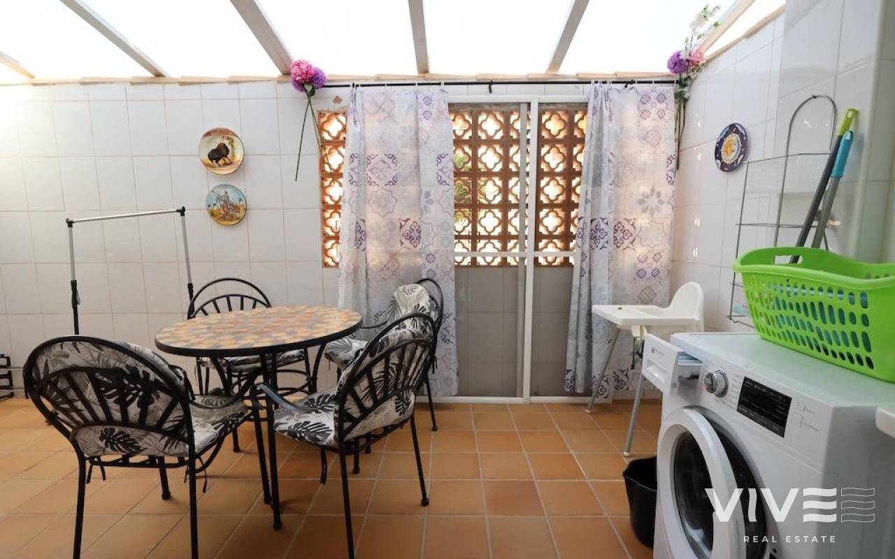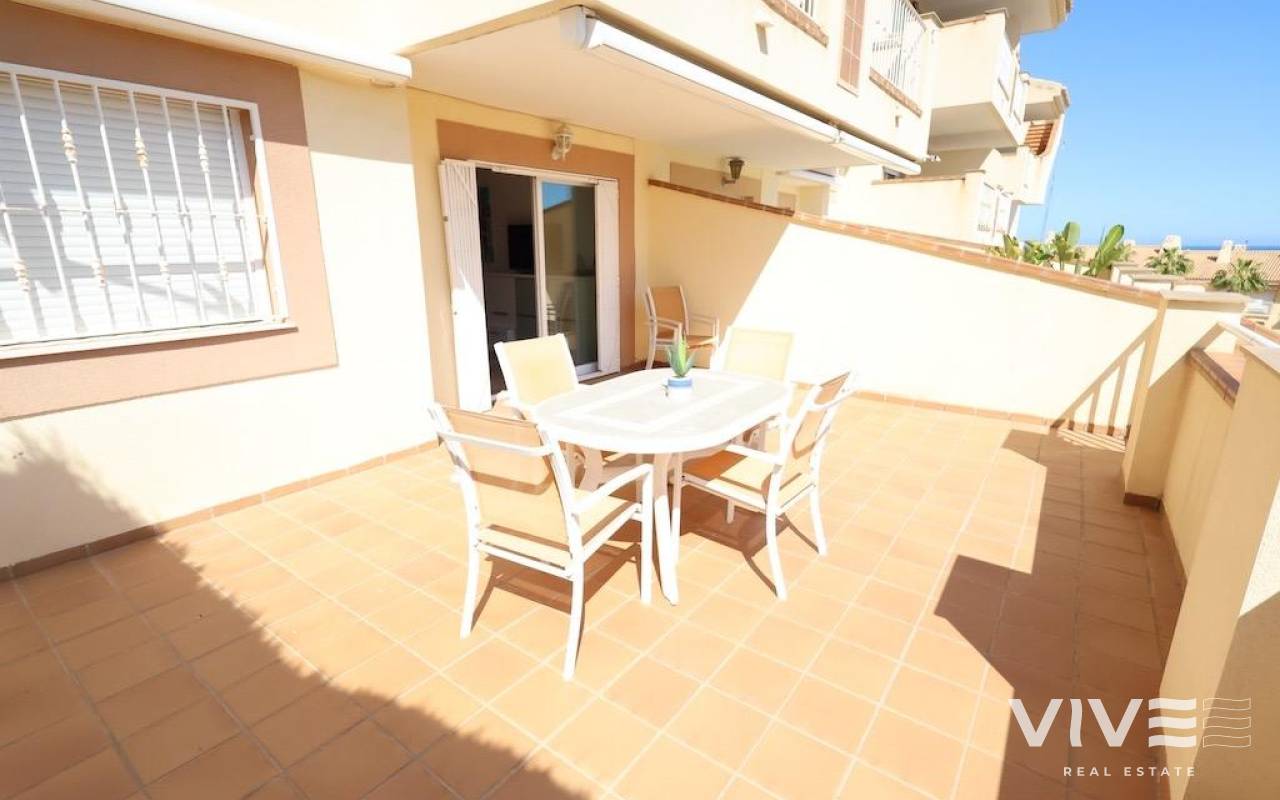 Aguamarina in Campoamor. Corner ground floor apartment , south facing with sea views and facing the communal pool with a large 20 m2 terrace, with direct access to the pool, the house has 70 m2 with 2 bedrooms and 1 bathroom, large independent kitchen with access to the covered patio, the house is sold furnished and with air conditioning and a closed garage, it is located close to all services and a few meters walk to the beach.