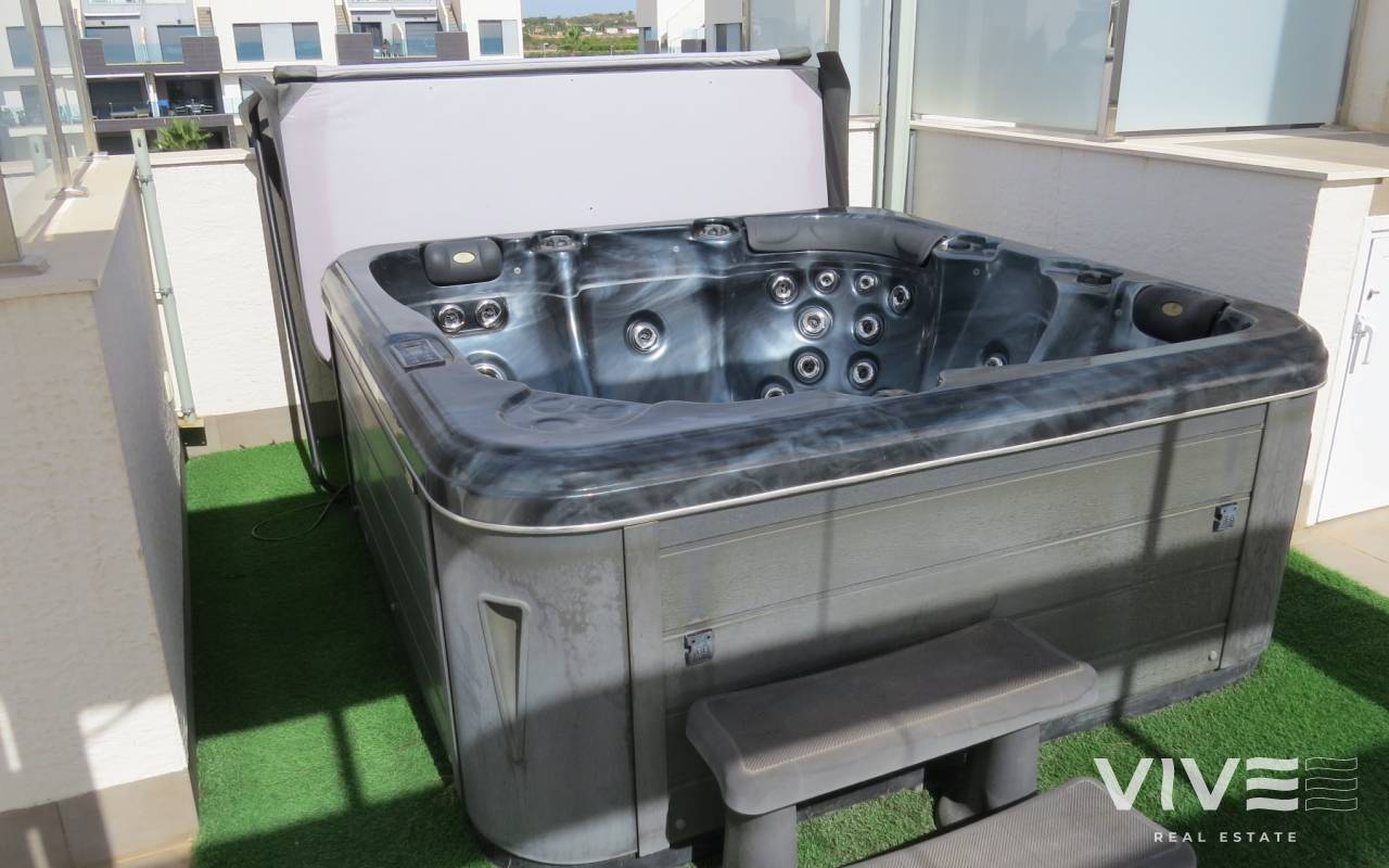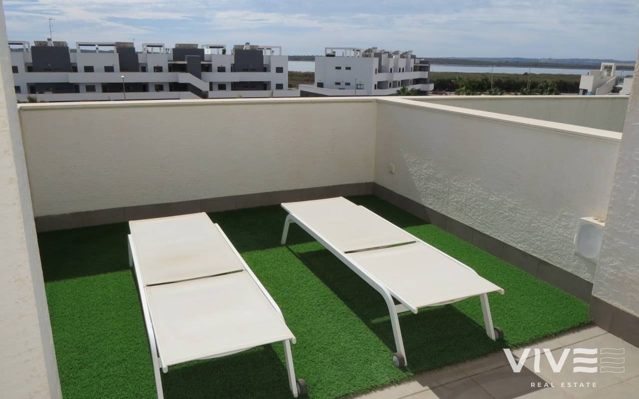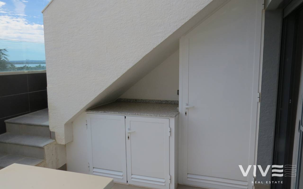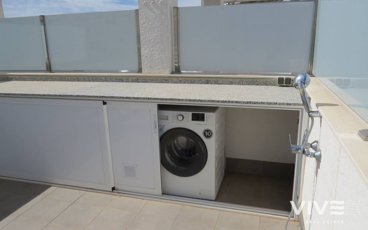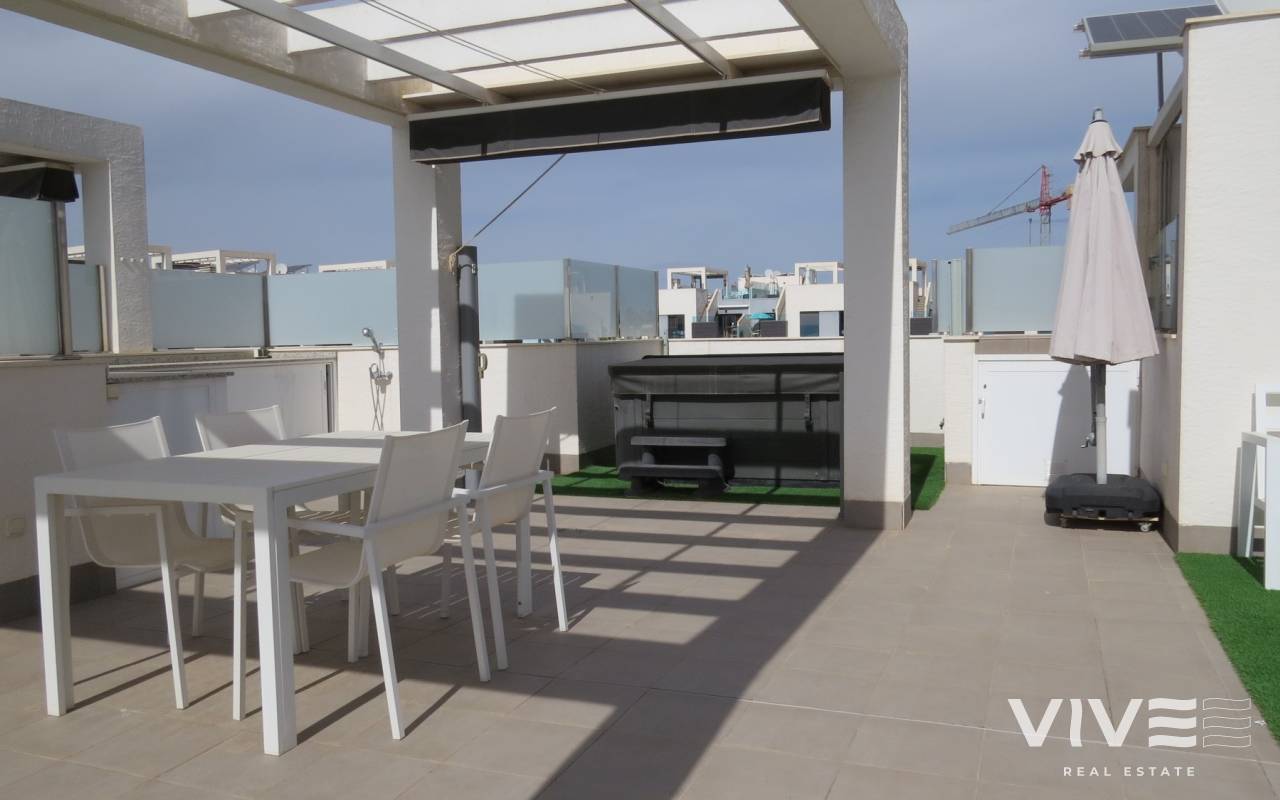 This spacious penthouse is located in a modern residential area in ‘El Raso’. An area known for its peaceful location close to everything you need for the perfect holiday or for permanent living. In the immediate vicinity you will find the beautiful sandy beaches of Guardamar del Segura, many nature reserves, the salt lakes of La Mata and Torrevieja, lots of cycling and walking potential, several golf courses and other towns, each with their own attractions. Shops, speciality stores, restaurants, cafes, shopping centres, etc. are all within easy reach. The urbanisation has a luxurious feel with its beautiful finish and numerous facilities. There are 2 large swimming pools, a playground for the little ones, a petanque court, table tennis, mini golf, a gym, sauna and jacuzzi, all available for use. There is also an underground car park for your car. The house itself is very well maintained and equipped with every comfort including energy-efficient air conditioning (hot/cold), a ventilation system, shutters and fly screens on all windows, fitted wardrobes, an electric awning with LED lighting, a wine fridge under the kitchen island and separate heating in the bathrooms. This house is divided into a spacious living room with open kitchen, 1 master bedroom with ensuite bathroom, 2 guest rooms and a family bathroom. There is certainly no lack of outdoor space either! There is a cosy terrace at the extension of the living room with fitted wardrobes for extra storage under the stairs leading to the large solarium. Here you will find a spacious outdoor kitchen and various seating areas to enjoy the Spanish climate. In addition, this property also offers curtains, garden furniture, indirect LED lighting in various places and a private jacuzzi, which are included in the price of the property. There is also the option to purchase a large storage room APPART for an ADDITIONAL PRICE. In short, a great opportunity to become the owner of your own place in the Spanish sun! Suma: 308 euros/year Community fees: 1400 euros/year