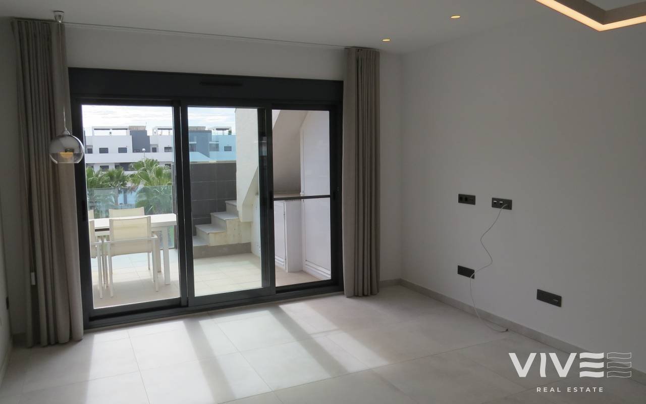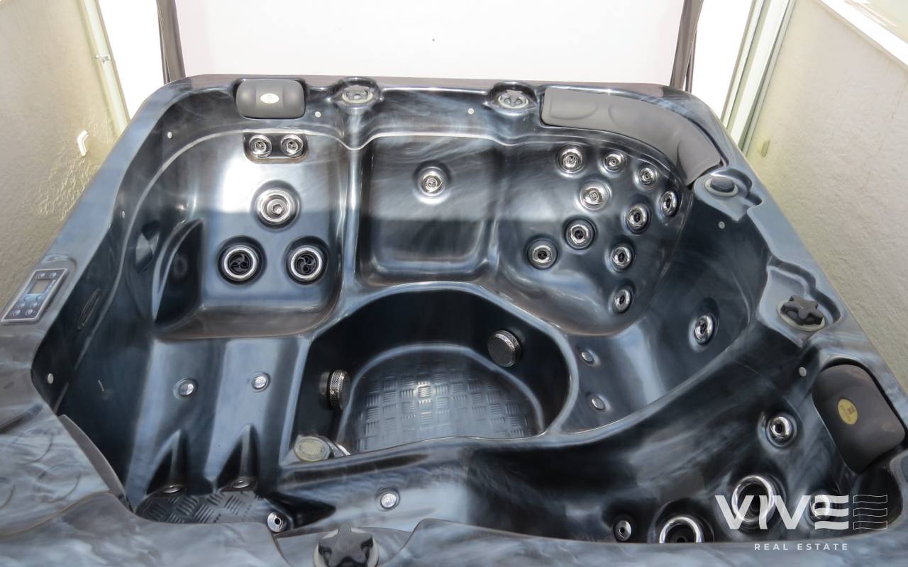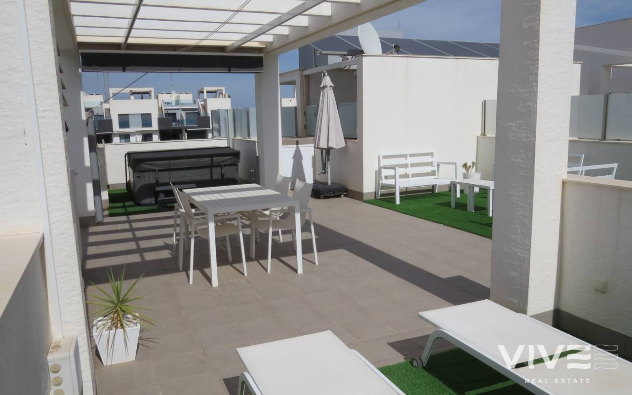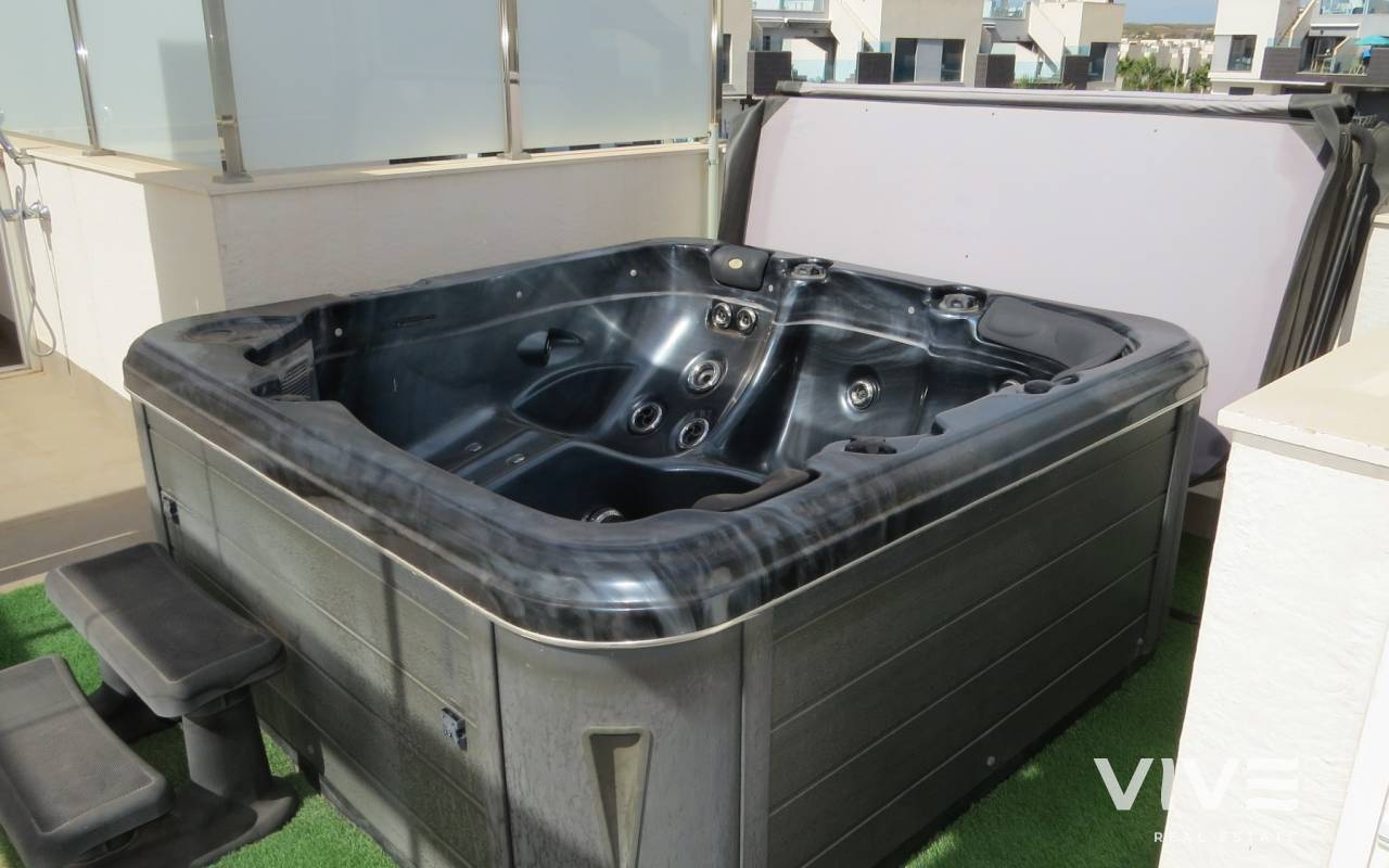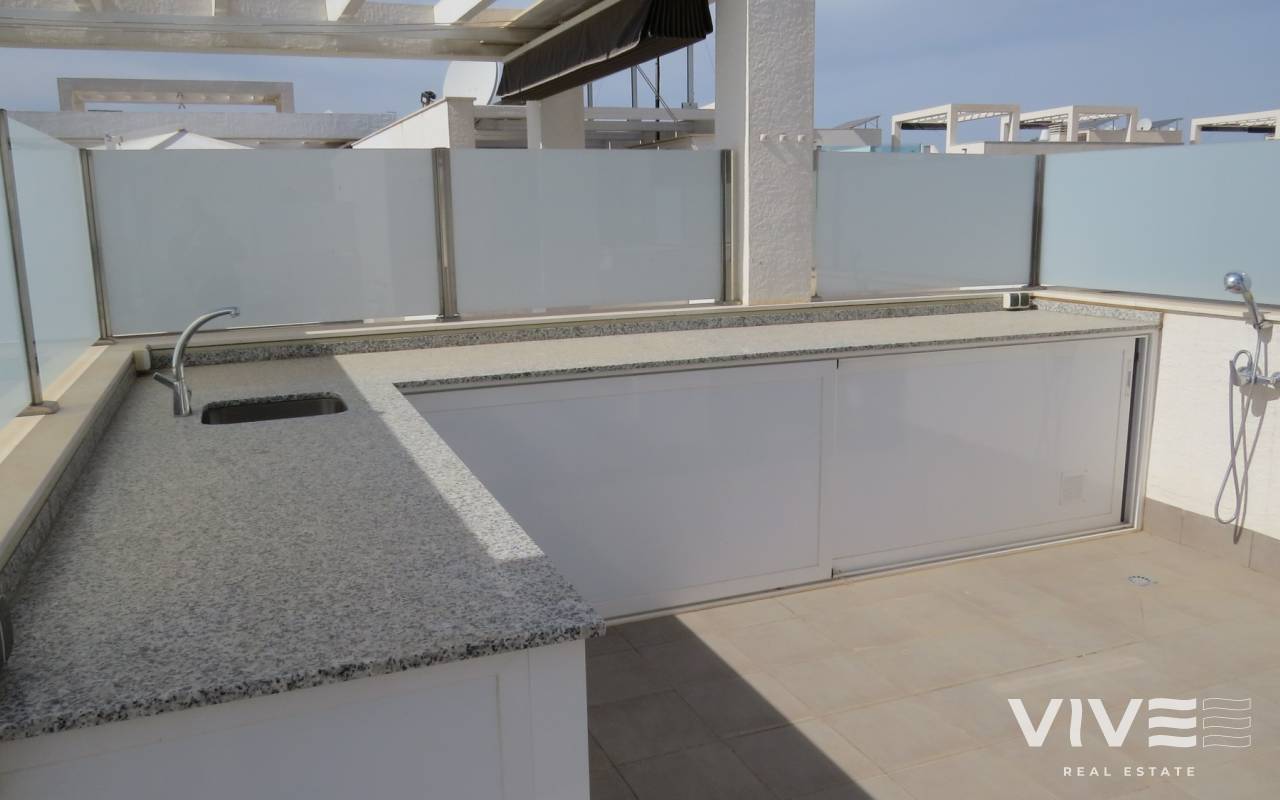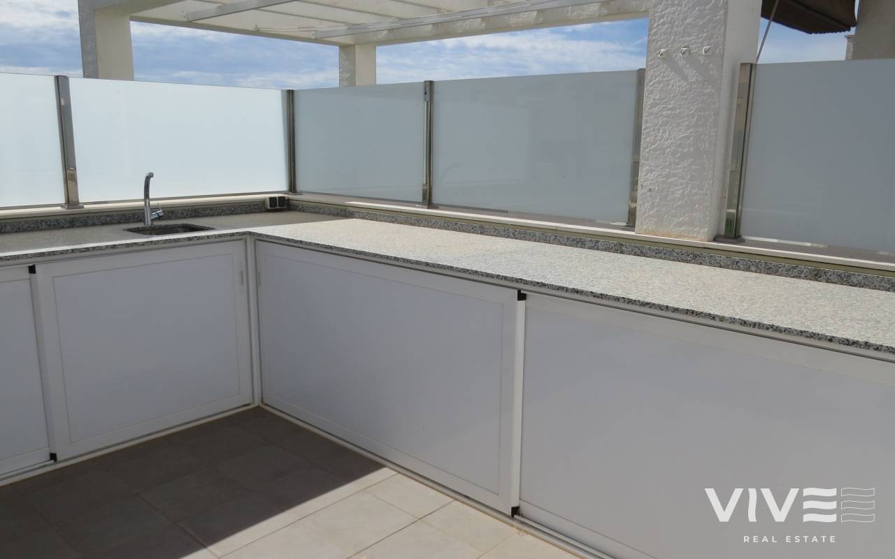 This spacious penthouse is located in a modern residential area in ‘El Raso’. An area known for its peaceful location close to everything you need for the perfect holiday or for permanent living. In the immediate vicinity you will find the beautiful sandy beaches of Guardamar del Segura, many nature reserves, the salt lakes of La Mata and Torrevieja, lots of cycling and walking potential, several golf courses and other towns, each with their own attractions. Shops, speciality stores, restaurants, cafes, shopping centres, etc. are all within easy reach. The urbanisation has a luxurious feel with its beautiful finish and numerous facilities. There are 2 large swimming pools, a playground for the little ones, a petanque court, table tennis, mini golf, a gym, sauna and jacuzzi, all available for use. There is also an underground car park for your car. The house itself is very well maintained and equipped with every comfort including energy-efficient air conditioning (hot/cold), a ventilation system, shutters and fly screens on all windows, fitted wardrobes, an electric awning with LED lighting, a wine fridge under the kitchen island and separate heating in the bathrooms. This house is divided into a spacious living room with open kitchen, 1 master bedroom with ensuite bathroom, 2 guest rooms and a family bathroom. There is certainly no lack of outdoor space either! There is a cosy terrace at the extension of the living room with fitted wardrobes for extra storage under the stairs leading to the large solarium. Here you will find a spacious outdoor kitchen and various seating areas to enjoy the Spanish climate. In addition, this property also offers curtains, garden furniture, indirect LED lighting in various places and a private jacuzzi, which are included in the price of the property. There is also the option to purchase a large storage room APPART for an ADDITIONAL PRICE. In short, a great opportunity to become the owner of your own place in the Spanish sun! Suma: 308 euros/year Community fees: 1400 euros/year