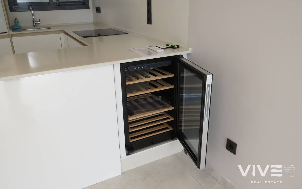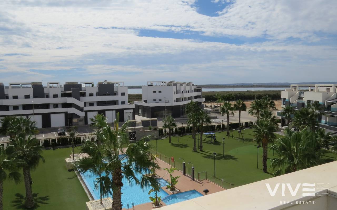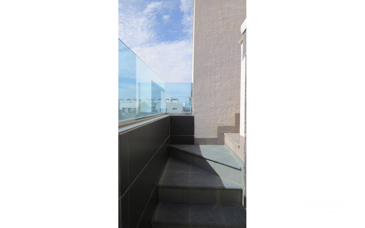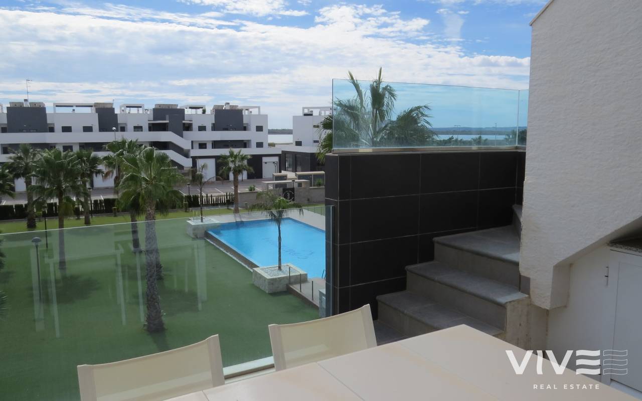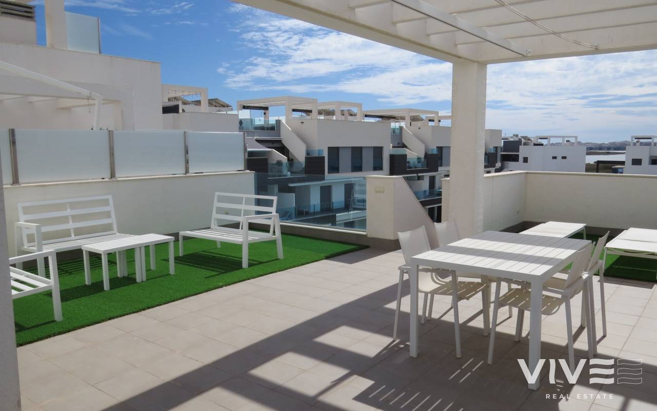 This spacious penthouse is located in a modern residential area in ‘El Raso’. An area known for its peaceful location close to everything you need for the perfect holiday or for permanent living. In the immediate vicinity you will find the beautiful sandy beaches of Guardamar del Segura, many nature reserves, the salt lakes of La Mata and Torrevieja, lots of cycling and walking potential, several golf courses and other towns, each with their own attractions. Shops, speciality stores, restaurants, cafes, shopping centres, etc. are all within easy reach. The urbanisation has a luxurious feel with its beautiful finish and numerous facilities. There are 2 large swimming pools, a playground for the little ones, a petanque court, table tennis, mini golf, a gym, sauna and jacuzzi, all available for use. There is also an underground car park for your car. The house itself is very well maintained and equipped with every comfort including energy-efficient air conditioning (hot/cold), a ventilation system, shutters and fly screens on all windows, fitted wardrobes, an electric awning with LED lighting, a wine fridge under the kitchen island and separate heating in the bathrooms. This house is divided into a spacious living room with open kitchen, 1 master bedroom with ensuite bathroom, 2 guest rooms and a family bathroom. There is certainly no lack of outdoor space either! There is a cosy terrace at the extension of the living room with fitted wardrobes for extra storage under the stairs leading to the large solarium. Here you will find a spacious outdoor kitchen and various seating areas to enjoy the Spanish climate. In addition, this property also offers curtains, garden furniture, indirect LED lighting in various places and a private jacuzzi, which are included in the price of the property. There is also the option to purchase a large storage room APPART for an ADDITIONAL PRICE. In short, a great opportunity to become the owner of your own place in the Spanish sun! Suma: 308 euros/year Community fees: 1400 euros/year