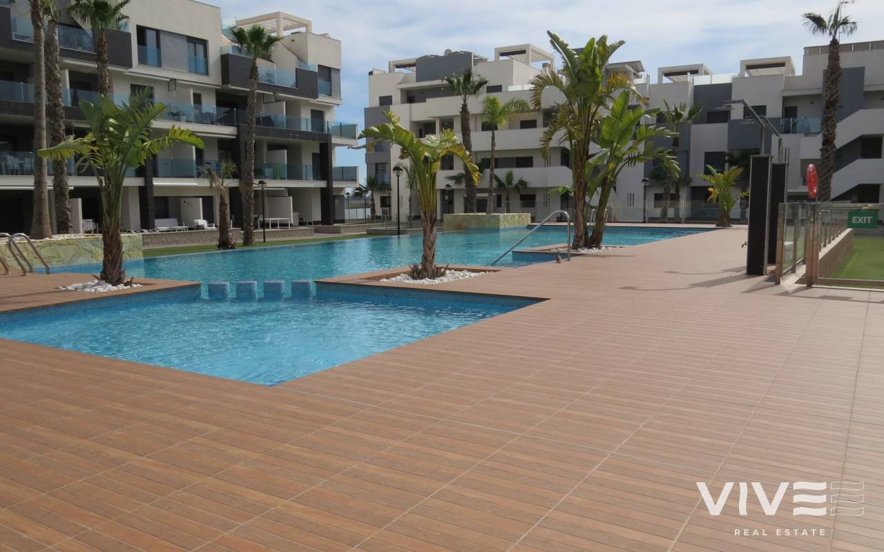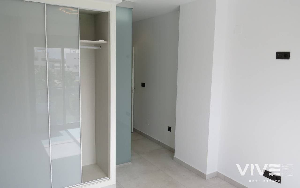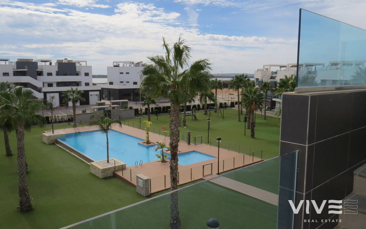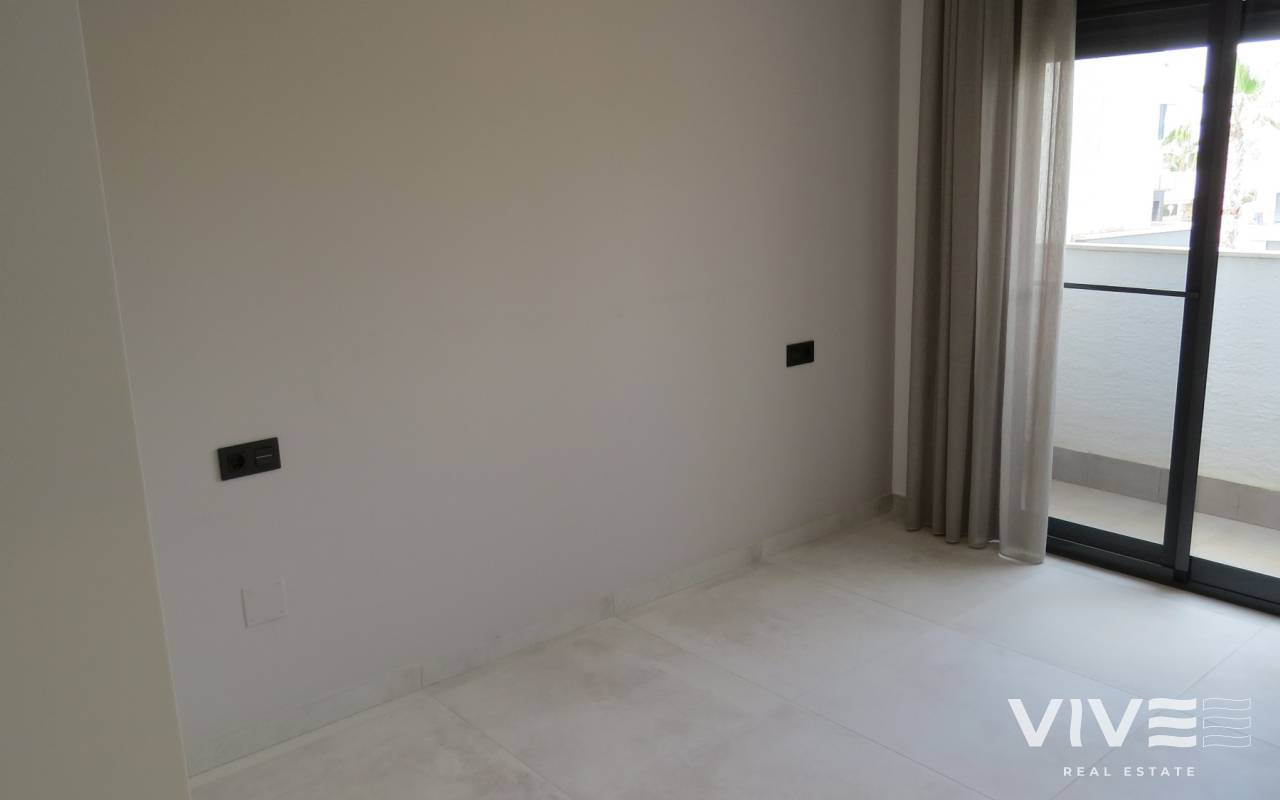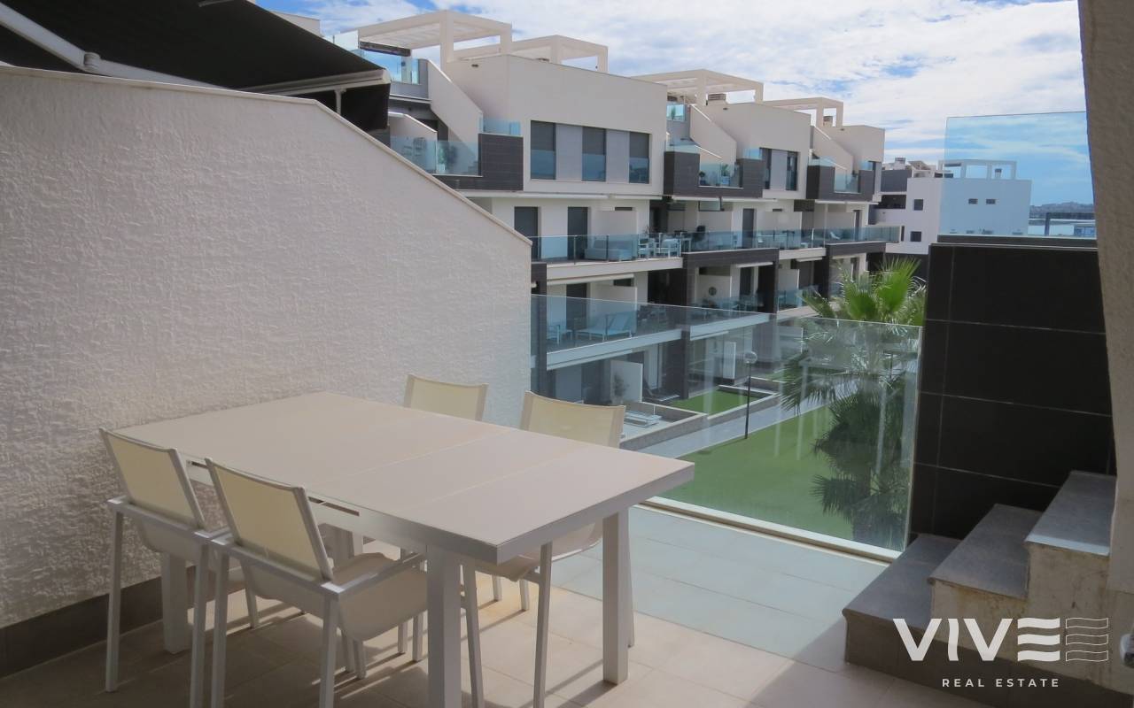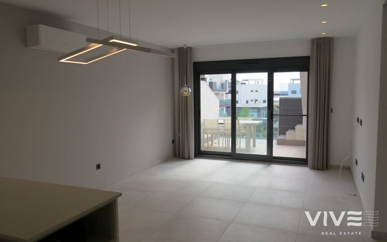 This spacious penthouse is located in a modern residential area in ‘El Raso’. An area known for its peaceful location close to everything you need for the perfect holiday or for permanent living. In the immediate vicinity you will find the beautiful sandy beaches of Guardamar del Segura, many nature reserves, the salt lakes of La Mata and Torrevieja, lots of cycling and walking potential, several golf courses and other towns, each with their own attractions. Shops, speciality stores, restaurants, cafes, shopping centres, etc. are all within easy reach. The urbanisation has a luxurious feel with its beautiful finish and numerous facilities. There are 2 large swimming pools, a playground for the little ones, a petanque court, table tennis, mini golf, a gym, sauna and jacuzzi, all available for use. There is also an underground car park for your car. The house itself is very well maintained and equipped with every comfort including energy-efficient air conditioning (hot/cold), a ventilation system, shutters and fly screens on all windows, fitted wardrobes, an electric awning with LED lighting, a wine fridge under the kitchen island and separate heating in the bathrooms. This house is divided into a spacious living room with open kitchen, 1 master bedroom with ensuite bathroom, 2 guest rooms and a family bathroom. There is certainly no lack of outdoor space either! There is a cosy terrace at the extension of the living room with fitted wardrobes for extra storage under the stairs leading to the large solarium. Here you will find a spacious outdoor kitchen and various seating areas to enjoy the Spanish climate. In addition, this property also offers curtains, garden furniture, indirect LED lighting in various places and a private jacuzzi, which are included in the price of the property. There is also the option to purchase a large storage room APPART for an ADDITIONAL PRICE. In short, a great opportunity to become the owner of your own place in the Spanish sun! Suma: 308 euros/year Community fees: 1400 euros/year