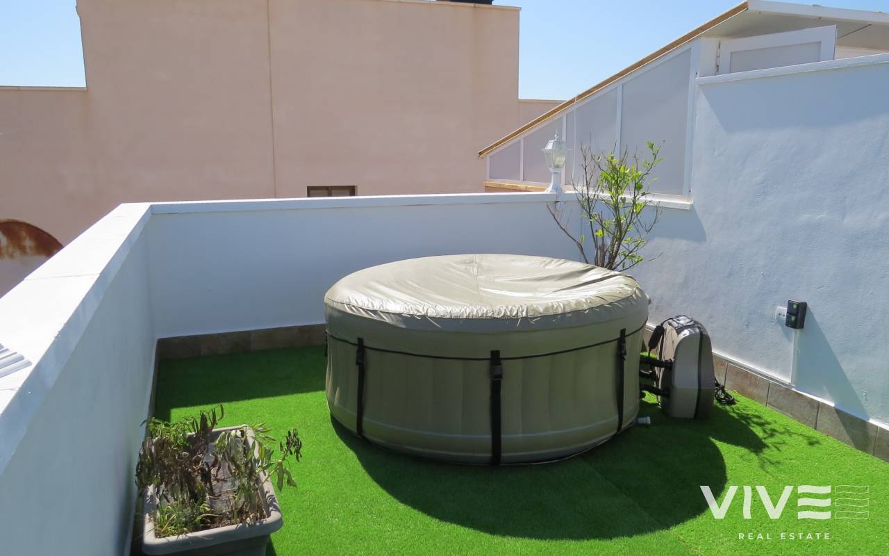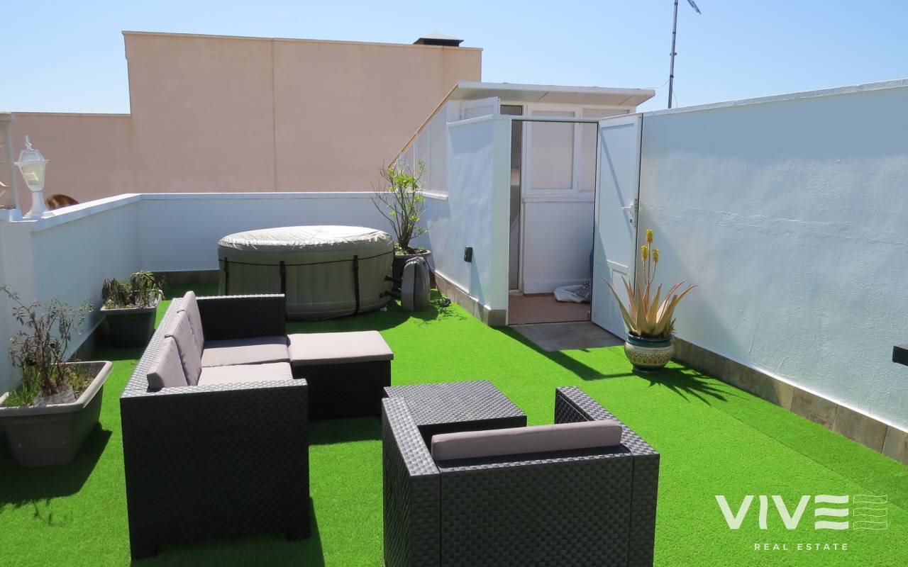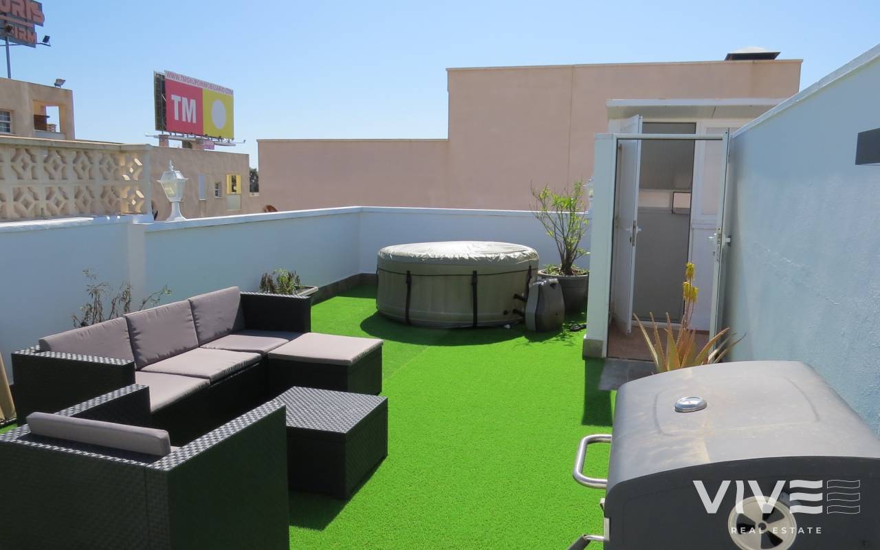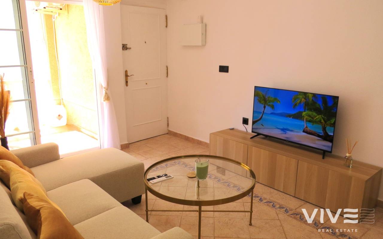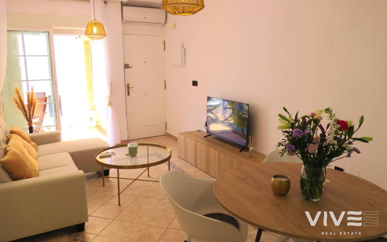 This recently renovated apartment offers a great location in the heart of the La Zenia area, where everything is within easy reach. Shops, bars, restaurants, specialty shops, La Zenia Boulevard shopping centre, and so much more... and of course the beautiful sandy beaches that are only a few minutes' walk away! In addition, the Orihuela Costa region on the southern Costa Blanca has many other charming towns, seaside resorts, golf courses, nature reserves, etc. to offer. The apartment itself is located on the first floor. Upon entering the property, you are welcomed by a cosy living room with an open kitchen. The living room gives direct access to a covered terrace with sun awnings. This property also offers two double bedrooms and a family bathroom. The sun-drenched private solarium is accessible via the staircase and offers plenty of extra outdoor space to enjoy the Spanish climate. This property also has many additional advantages that make it even more attractive! It has been recently renovated with a new kitchen and bathroom, new air conditioning (hot/cold), new electrical appliances and has been completely repainted. What's more, it is sold fully furnished, including garden furniture and a jacuzzi! In short, the perfect holiday home or permanent residence READY TO MOVE IN! Contact us quickly for a visit! Suma: 150 euro/year Community fees: 100 euro/year
