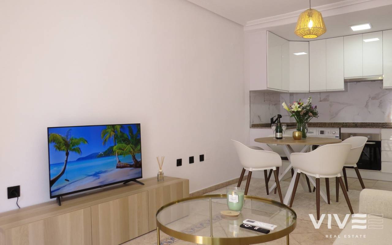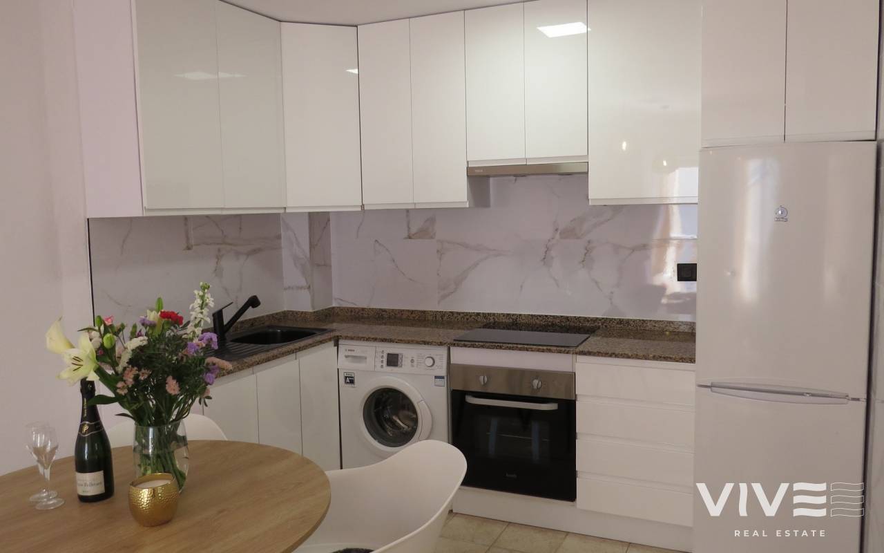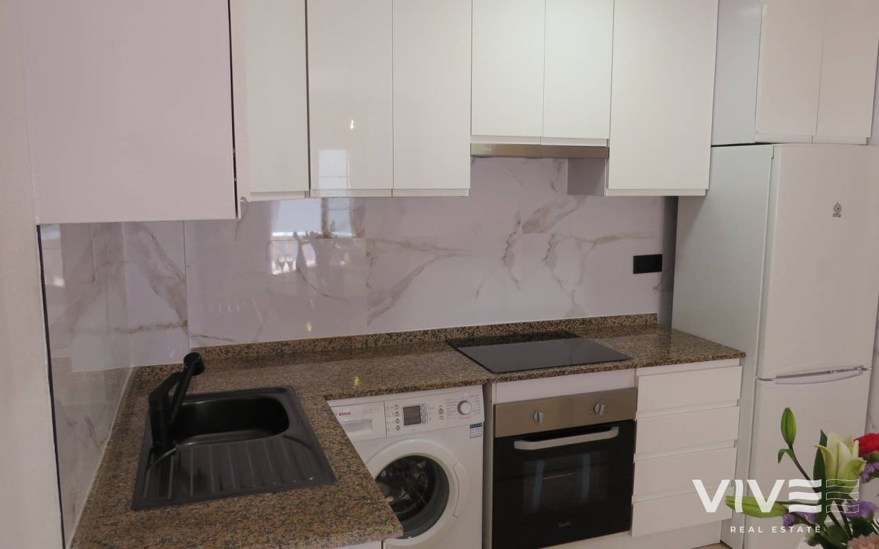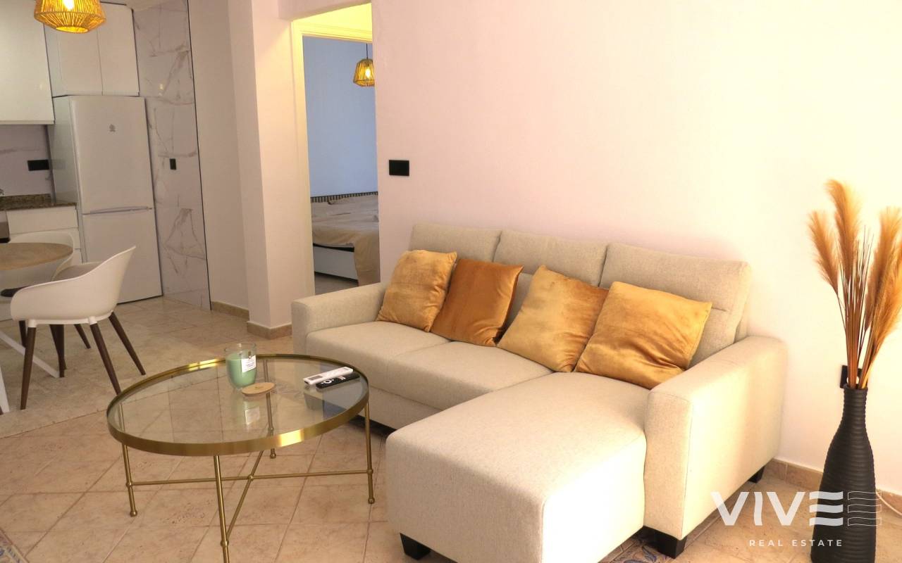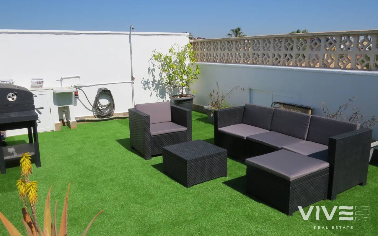 This recently renovated apartment offers a great location in the heart of the La Zenia area, where everything is within easy reach. Shops, bars, restaurants, specialty shops, La Zenia Boulevard shopping centre, and so much more... and of course the beautiful sandy beaches that are only a few minutes' walk away! In addition, the Orihuela Costa region on the southern Costa Blanca has many other charming towns, seaside resorts, golf courses, nature reserves, etc. to offer. The apartment itself is located on the first floor. Upon entering the property, you are welcomed by a cosy living room with an open kitchen. The living room gives direct access to a covered terrace with sun awnings. This property also offers two double bedrooms and a family bathroom. The sun-drenched private solarium is accessible via the staircase and offers plenty of extra outdoor space to enjoy the Spanish climate. This property also has many additional advantages that make it even more attractive! It has been recently renovated with a new kitchen and bathroom, new air conditioning (hot/cold), new electrical appliances and has been completely repainted. What's more, it is sold fully furnished, including garden furniture and a jacuzzi! In short, the perfect holiday home or permanent residence READY TO MOVE IN! Contact us quickly for a visit! Suma: 150 euro/year Community fees: 100 euro/year