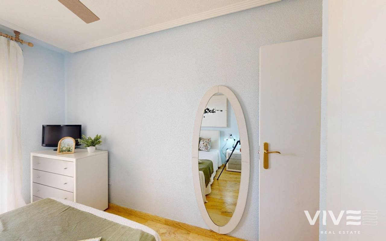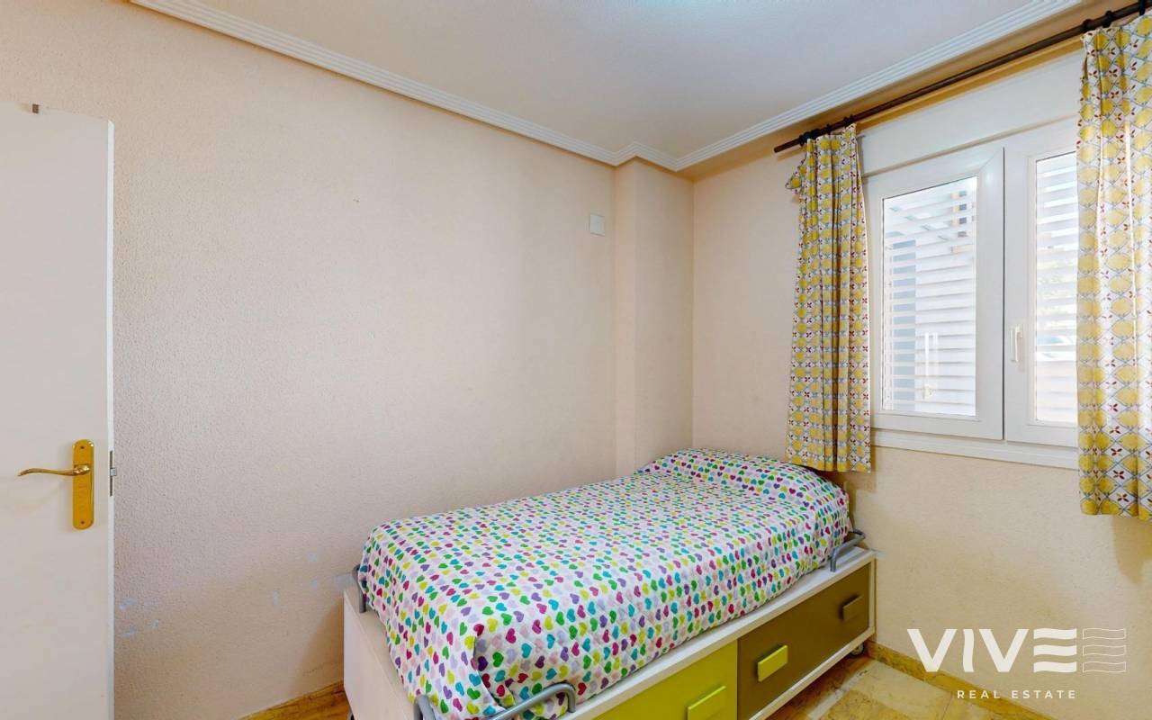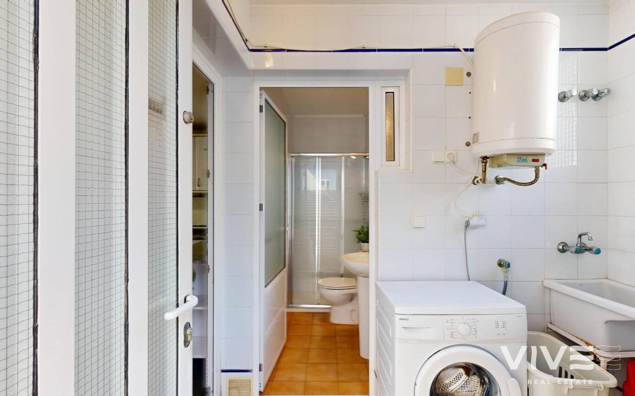 This magnificent bungalow is located in the Calas de Campoamor Residential Complex, a short walk from the beach. The south-facing, all-exterior home has an entrance from two streets, enjoying cross-ventilation that ensures a cool and comfortable stay throughout the day. Entering from the main avenue, you have access to a porch with access to the laundry area and a full bathroom. This area leads to a spacious kitchen with plenty of storage space. It connects to the living-dining room, which opens directly onto the south-facing terrace and to an exclusive, private area of the complex, providing complete privacy and also access to the home. It has two spacious bedrooms: the master bedroom also faces south with a large window, and the second bedroom has enough space for a queen-size bed and a bunk bed that folds away completely, leaving the entire room free for use. Both bedrooms have large built-in wardrobes. There is also a second bathroom with a walk-in shower. The home boasts high-quality finishes, marble floors, double-glazed windows and aluminum shutters, security systems, white lacquered doors, air conditioning, a terrace awning, and fans. To top it all off, this fantastic home also comes with a large garage and a storage room on the same property. It's one of the best residential areas in Campoamor, with a large, well-maintained communal pool and access to Aguamarina Beach from the complex.
