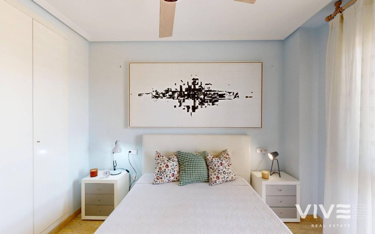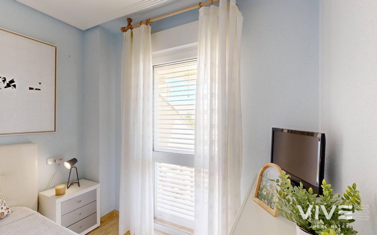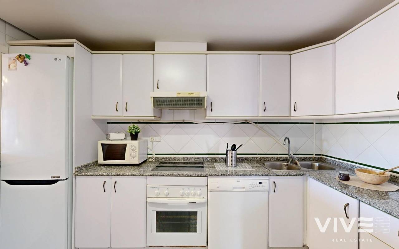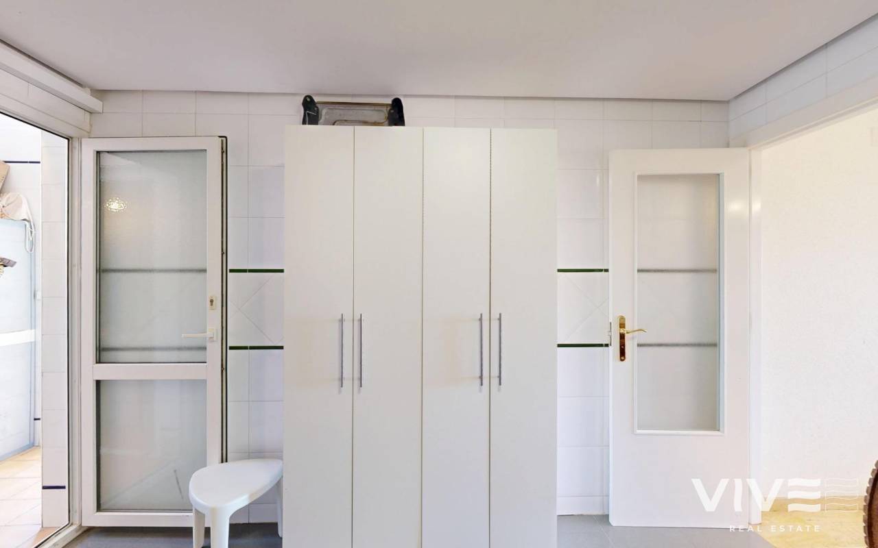 This magnificent bungalow is located in the Calas de Campoamor Residential Complex, a short walk from the beach. The south-facing, all-exterior home has an entrance from two streets, enjoying cross-ventilation that ensures a cool and comfortable stay throughout the day. Entering from the main avenue, you have access to a porch with access to the laundry area and a full bathroom. This area leads to a spacious kitchen with plenty of storage space. It connects to the living-dining room, which opens directly onto the south-facing terrace and to an exclusive, private area of the complex, providing complete privacy and also access to the home. It has two spacious bedrooms: the master bedroom also faces south with a large window, and the second bedroom has enough space for a queen-size bed and a bunk bed that folds away completely, leaving the entire room free for use. Both bedrooms have large built-in wardrobes. There is also a second bathroom with a walk-in shower. The home boasts high-quality finishes, marble floors, double-glazed windows and aluminum shutters, security systems, white lacquered doors, air conditioning, a terrace awning, and fans. To top it all off, this fantastic home also comes with a large garage and a storage room on the same property. It's one of the best residential areas in Campoamor, with a large, well-maintained communal pool and access to Aguamarina Beach from the complex.