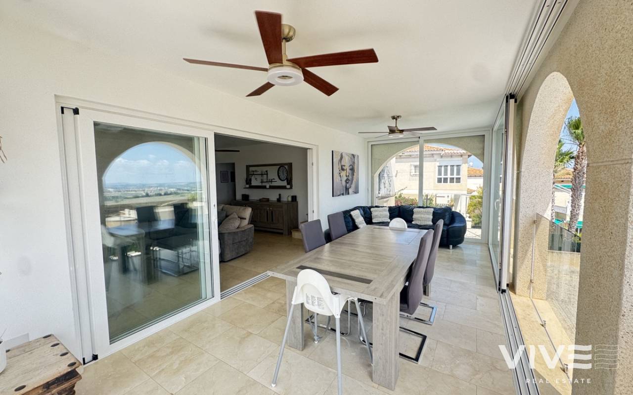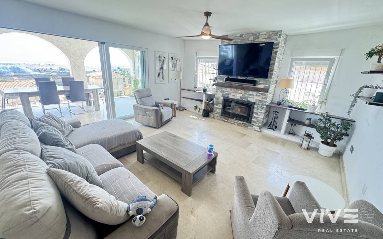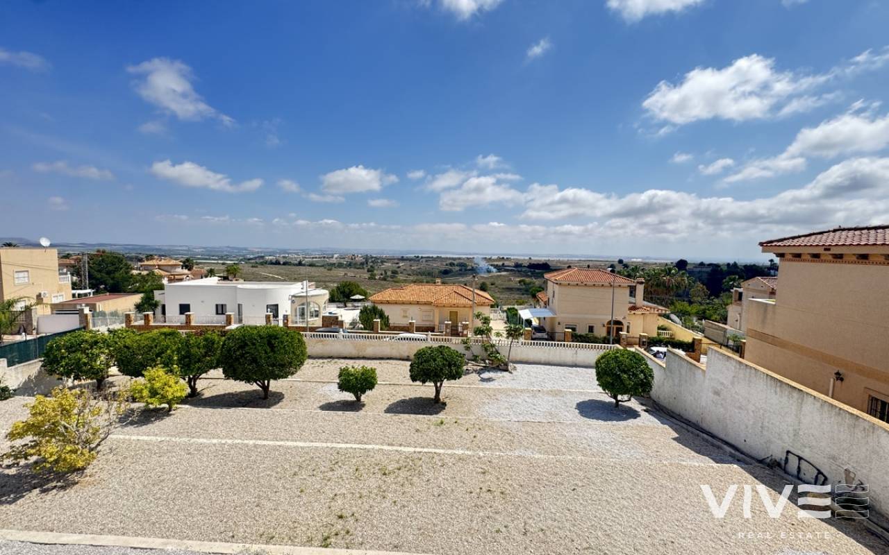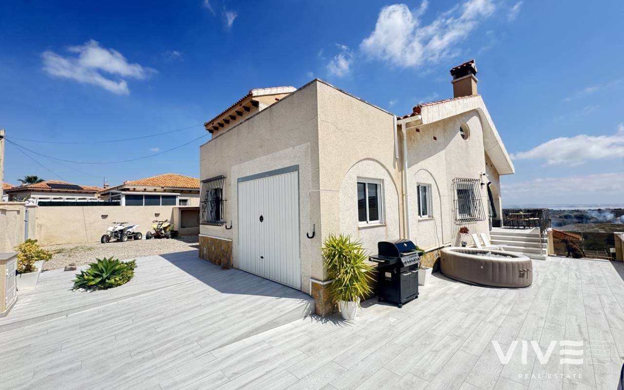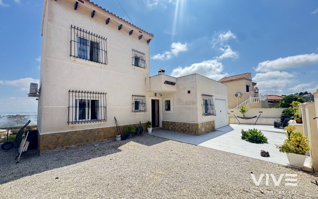 Stunning Villa with Panoramic Views. Discover the ultimate living experience in this stunning villa, situated on a vast 967m2 plot in the exclusive Villas Maria urbanization, Ciudad de las Comuniciones, San Miguel de Salinas. Offering Panoramic Views and Spacious Living This impressive property boasts breathtaking, sweeping views of the salt lake and Mediterranean Sea from the lounge and adjacent terrace, offering a truly unique perspective. With three levels and a garage, this villa provides ample space for relaxation and entertainment. Interior - Spacious lounge/dining area with fireplace and direct access to the garden - Separate kitchen with utility area and appliances. - 3 double/twin bedrooms and family bathroom on the main floor - Main bedroom with private sun terrace and stunning views - Additional large attic-style bedroom with multi-use area Modernized Lower Floor - Large laundry room with direct access to the garden - Bedroom, office, and additional storage area providing flexibility and functionality Garden and Pool Potential - Large garden with potential for landscaping and private pool installation - Bounded by two streets and a footpath, offering added privacy and potential for future development - Tiled garden and large fish pond at the main entrance, creating a serene ambiance Prime Location - 15-minute drive to the beautiful white sand beaches of Mil Palmeras, Campoamor, and La Zenia - 5-minute drive to the town center of San Miguel de Salinas, with its charming shops and restaurants