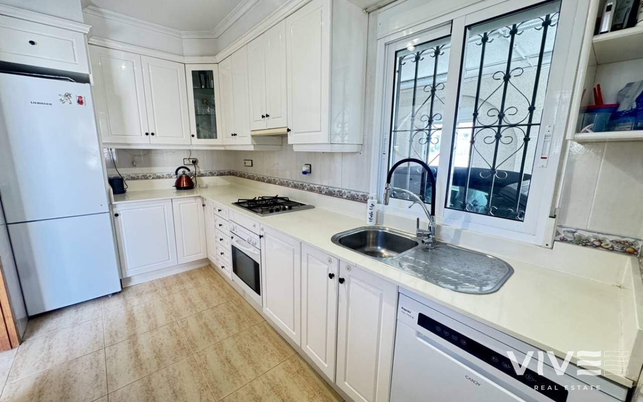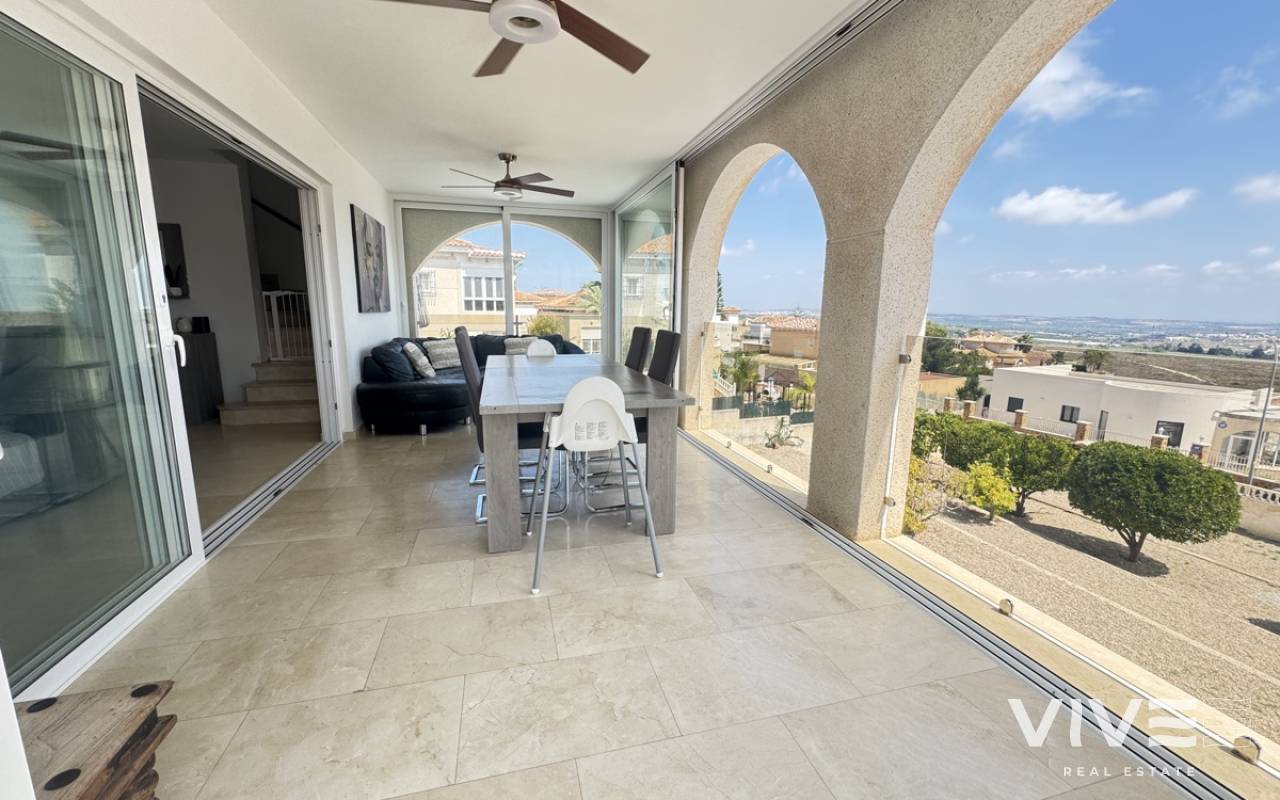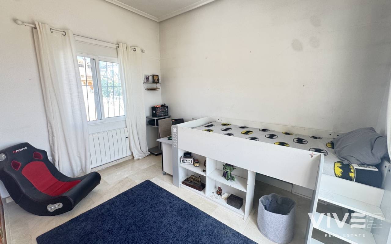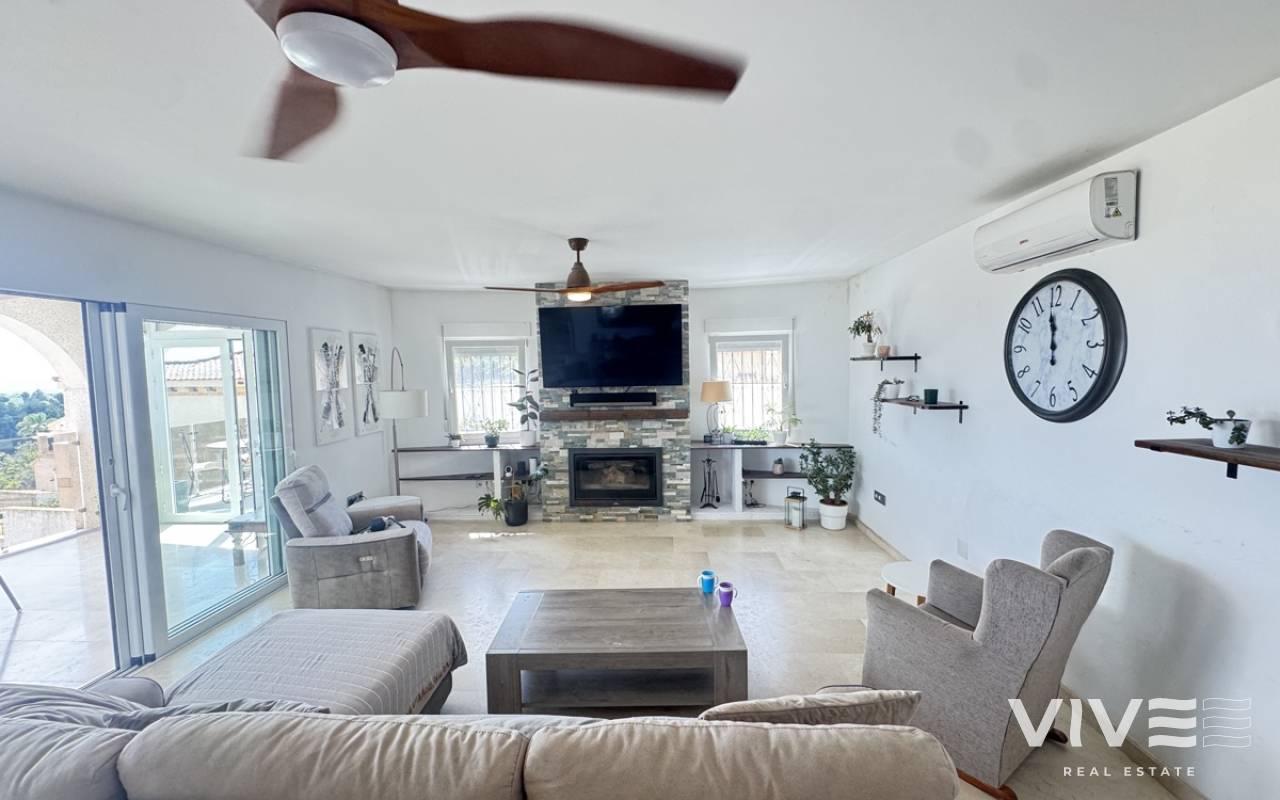 Stunning Villa with Panoramic Views. Discover the ultimate living experience in this stunning villa, situated on a vast 967m2 plot in the exclusive Villas Maria urbanization, Ciudad de las Comuniciones, San Miguel de Salinas. Offering Panoramic Views and Spacious Living This impressive property boasts breathtaking, sweeping views of the salt lake and Mediterranean Sea from the lounge and adjacent terrace, offering a truly unique perspective. With three levels and a garage, this villa provides ample space for relaxation and entertainment. Interior - Spacious lounge/dining area with fireplace and direct access to the garden - Separate kitchen with utility area and appliances. - 3 double/twin bedrooms and family bathroom on the main floor - Main bedroom with private sun terrace and stunning views - Additional large attic-style bedroom with multi-use area Modernized Lower Floor - Large laundry room with direct access to the garden - Bedroom, office, and additional storage area providing flexibility and functionality Garden and Pool Potential - Large garden with potential for landscaping and private pool installation - Bounded by two streets and a footpath, offering added privacy and potential for future development - Tiled garden and large fish pond at the main entrance, creating a serene ambiance Prime Location - 15-minute drive to the beautiful white sand beaches of Mil Palmeras, Campoamor, and La Zenia - 5-minute drive to the town center of San Miguel de Salinas, with its charming shops and restaurants