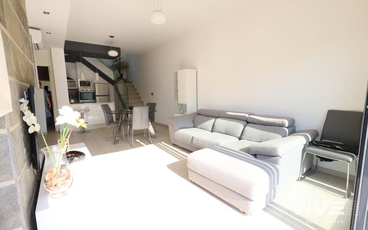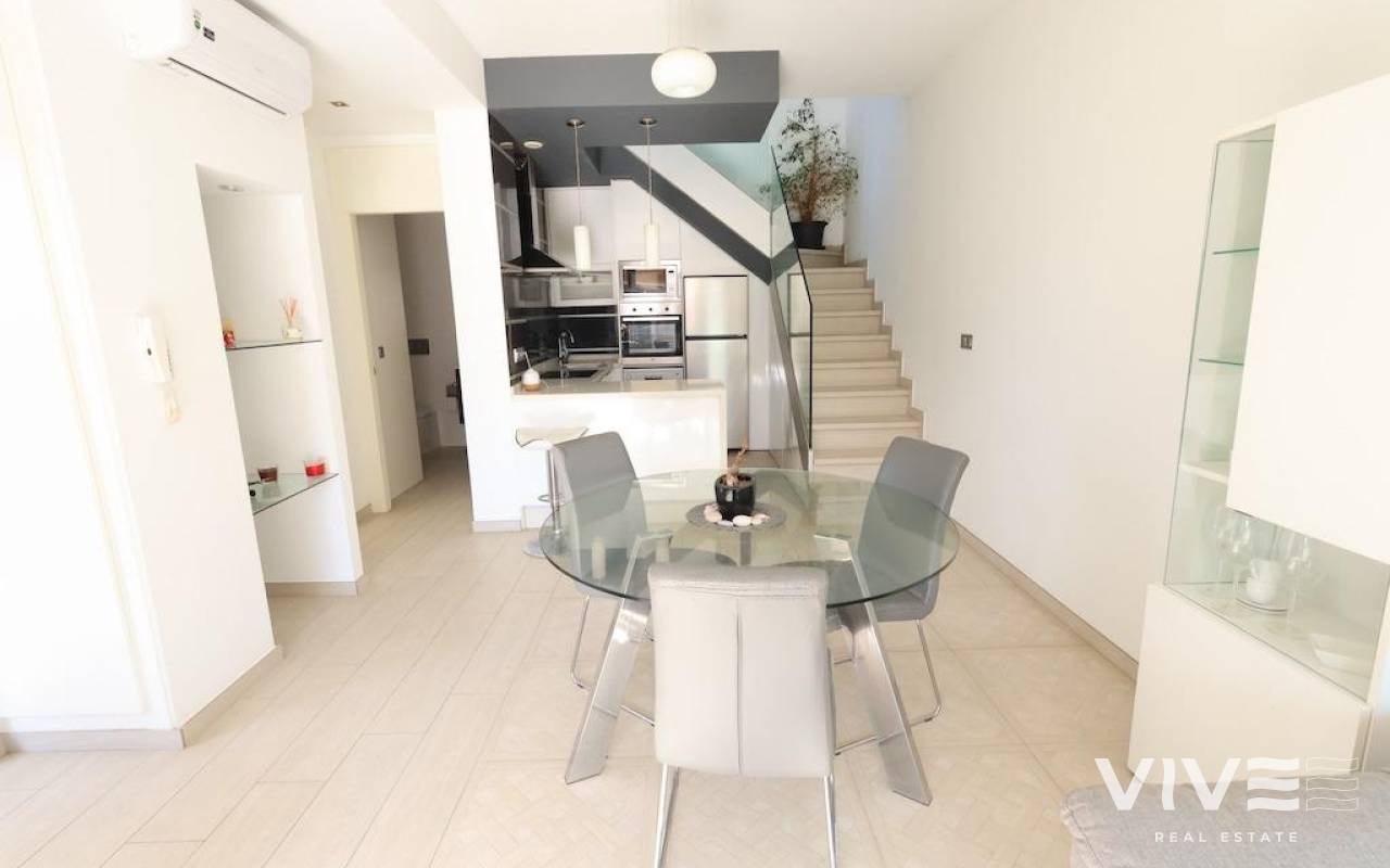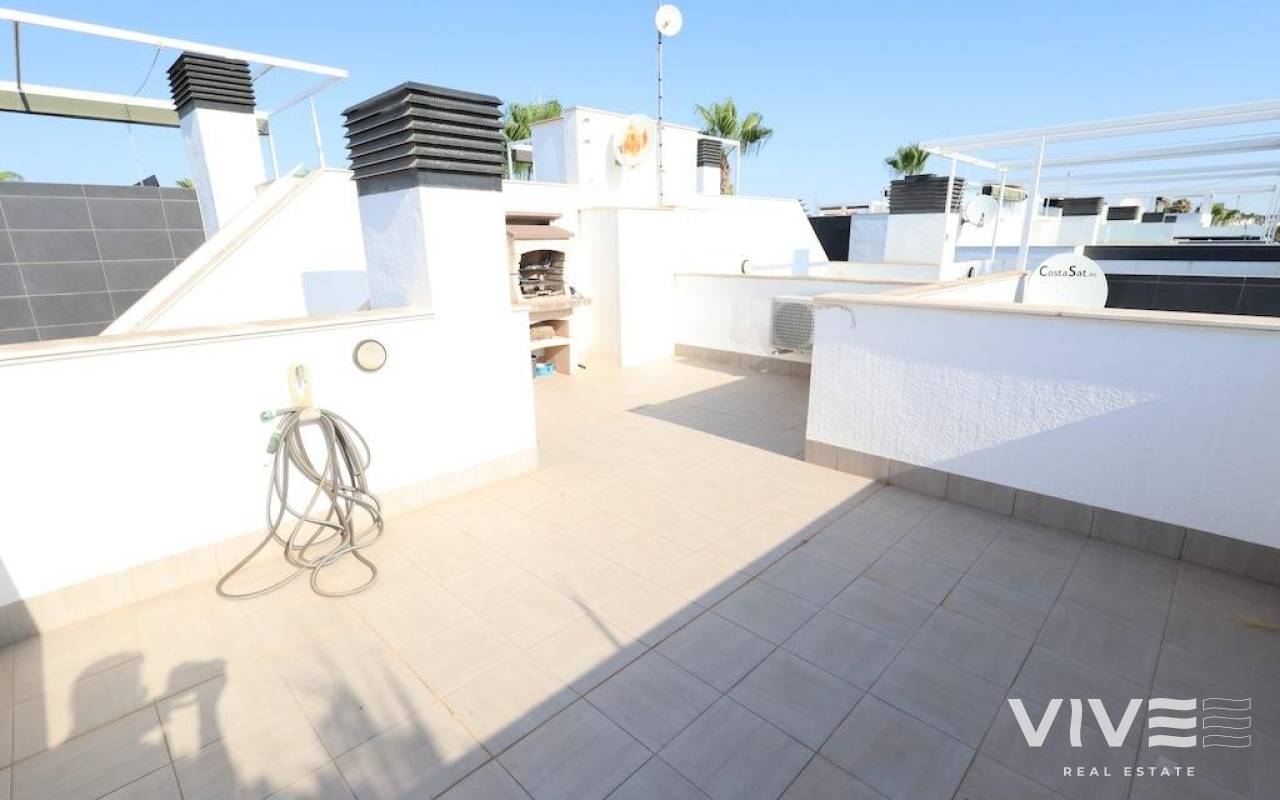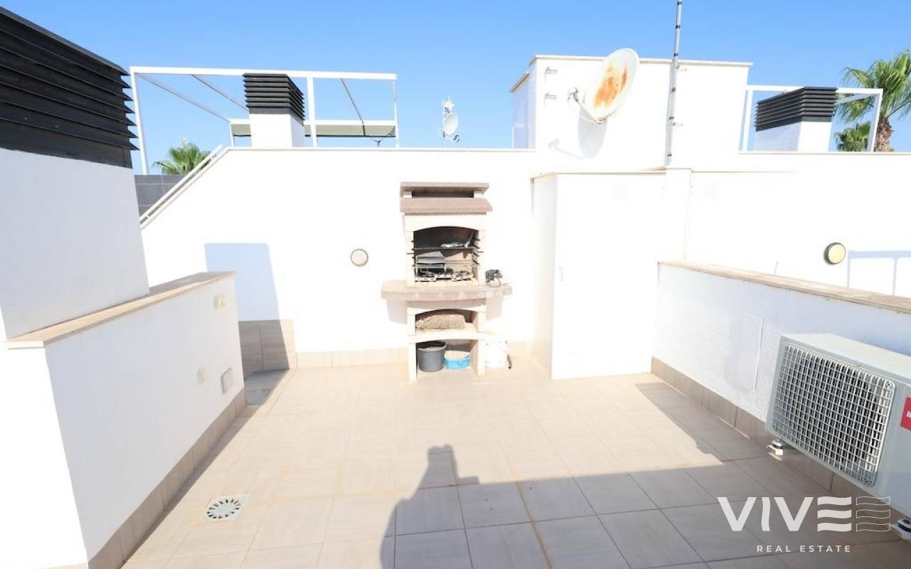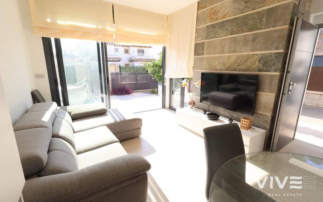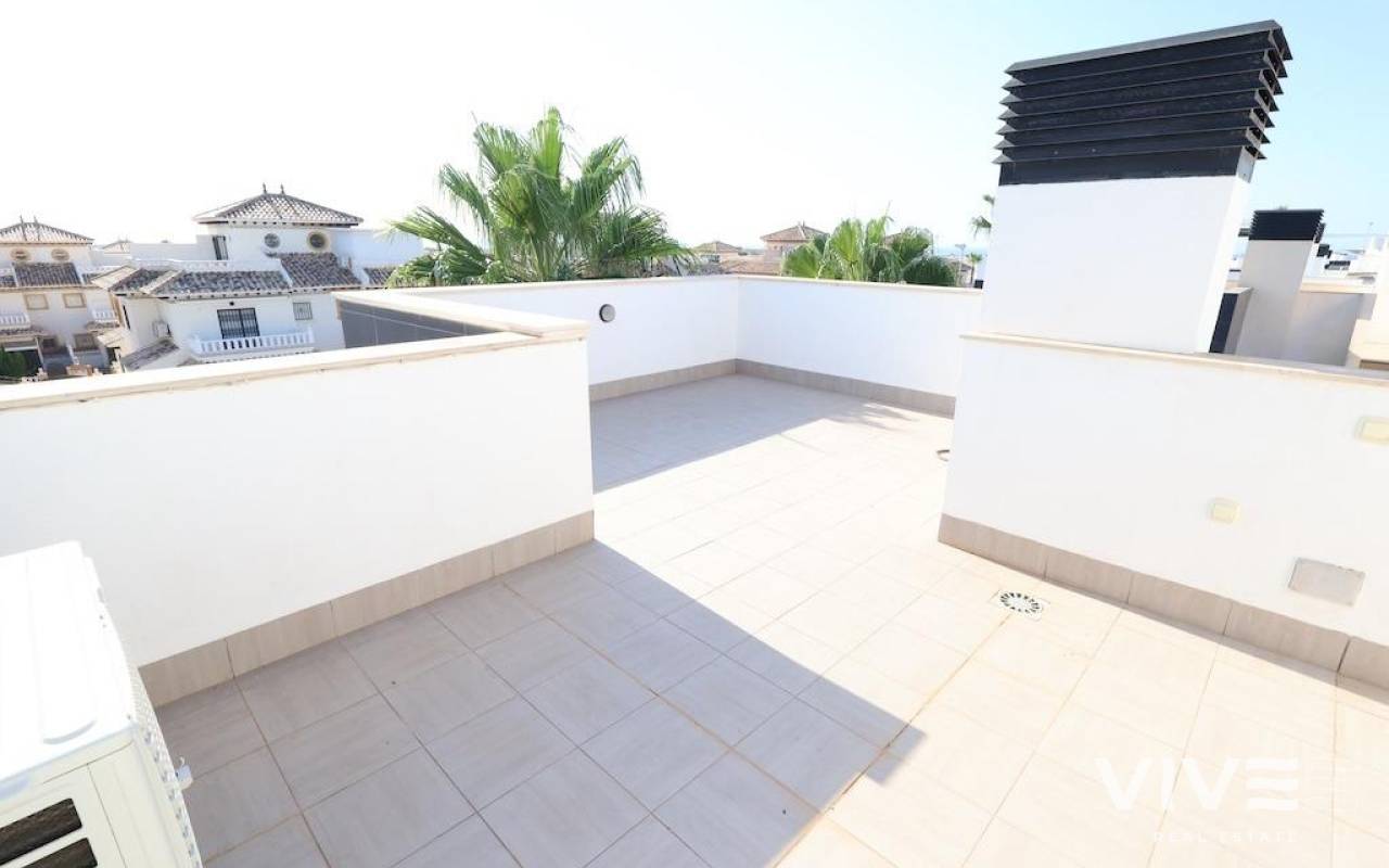 Magnificent townhouse located in the exclusive Oasis Hill residential area in Lomas de Cabo Roig. The home, spread over three levels, features two spacious bedrooms and two full bathrooms, offering comfort, natural light, and functionality.. . On the ground floor, there is a 90 m² corner garden, ideal for enjoying the outdoors, with a driveway, a bright living-dining room, a fully equipped open-plan kitchen, a bedroom, and a full bathroom.. . On the first floor is the very spacious master bedroom with an en-suite bathroom and access to a private terrace. From there, you can access the upper floor, where you will find a large solarium with a storage room and unobstructed sea views.. . The property is sold fully furnished, with air conditioning, and ready to move into.. . The residential complex has two outdoor communal pools, large garden areas, and is conveniently located close to supermarkets, restaurants, shops, and all amenities. The beaches of Cabo Roig and Campoamor are just a 3-minute drive away, and several golf courses are 5 minutes away.. . Ideal as a permanent home, second home, or investment for vacation rentals.