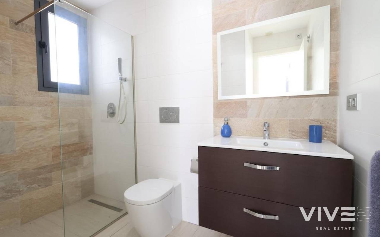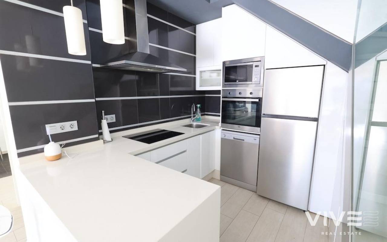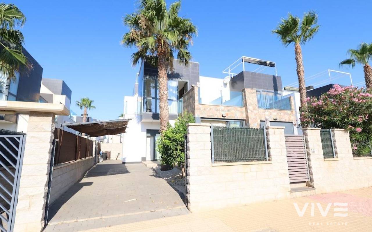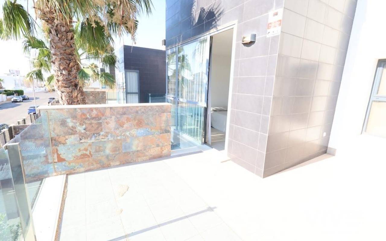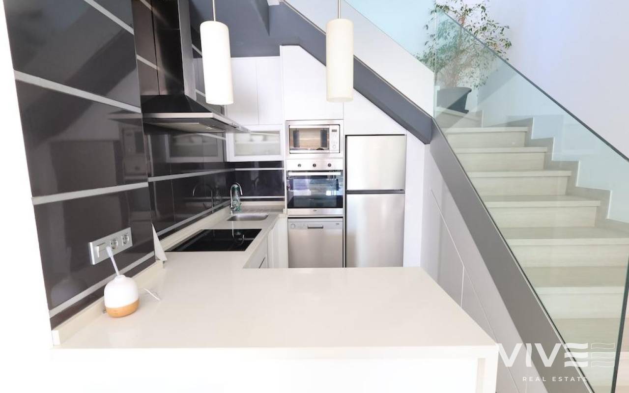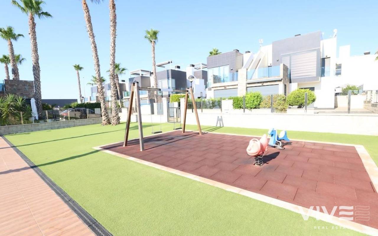 Magnificent townhouse located in the exclusive Oasis Hill residential area in Lomas de Cabo Roig. The home, spread over three levels, features two spacious bedrooms and two full bathrooms, offering comfort, natural light, and functionality.. . On the ground floor, there is a 90 m² corner garden, ideal for enjoying the outdoors, with a driveway, a bright living-dining room, a fully equipped open-plan kitchen, a bedroom, and a full bathroom.. . On the first floor is the very spacious master bedroom with an en-suite bathroom and access to a private terrace. From there, you can access the upper floor, where you will find a large solarium with a storage room and unobstructed sea views.. . The property is sold fully furnished, with air conditioning, and ready to move into.. . The residential complex has two outdoor communal pools, large garden areas, and is conveniently located close to supermarkets, restaurants, shops, and all amenities. The beaches of Cabo Roig and Campoamor are just a 3-minute drive away, and several golf courses are 5 minutes away.. . Ideal as a permanent home, second home, or investment for vacation rentals.